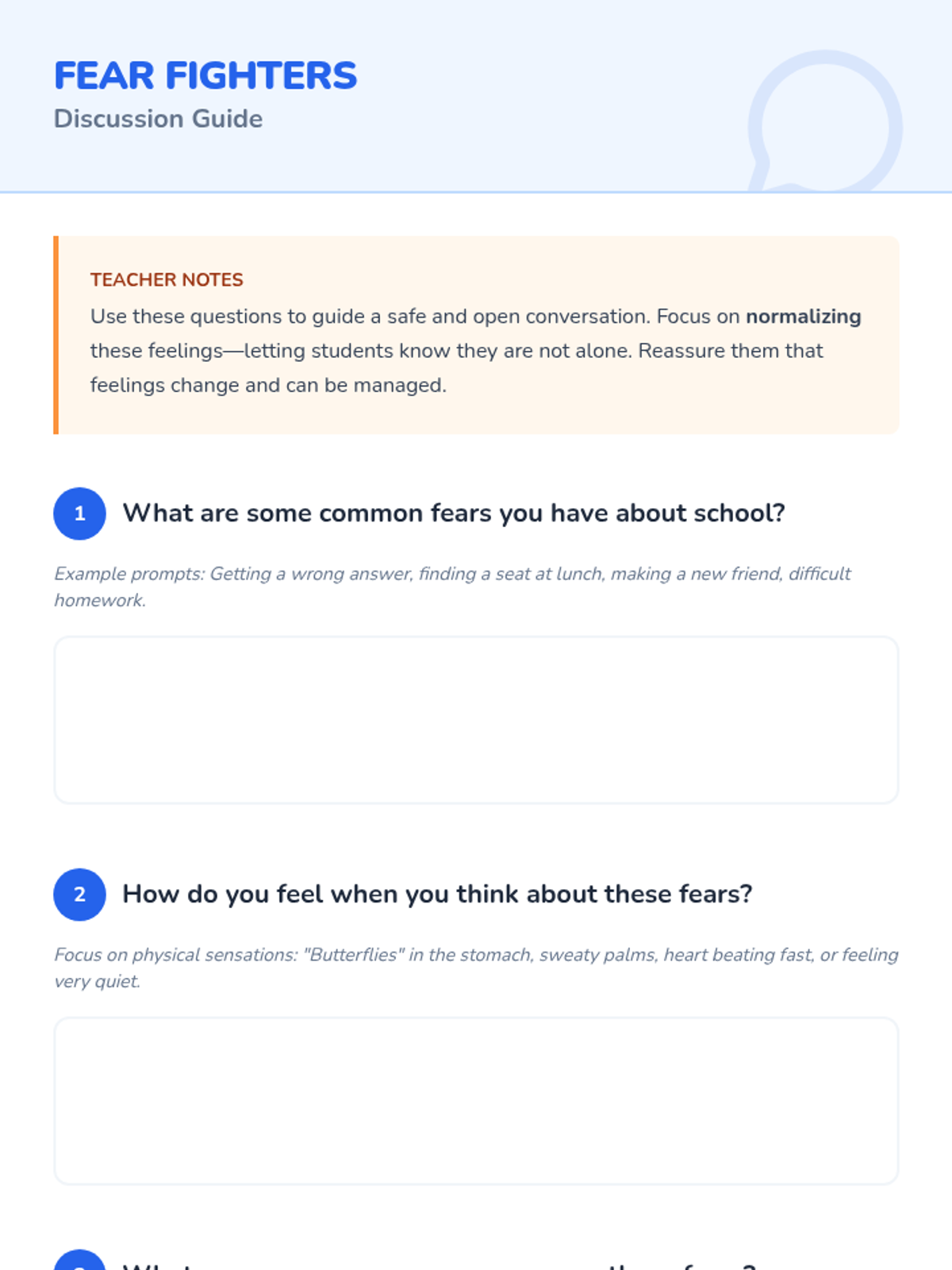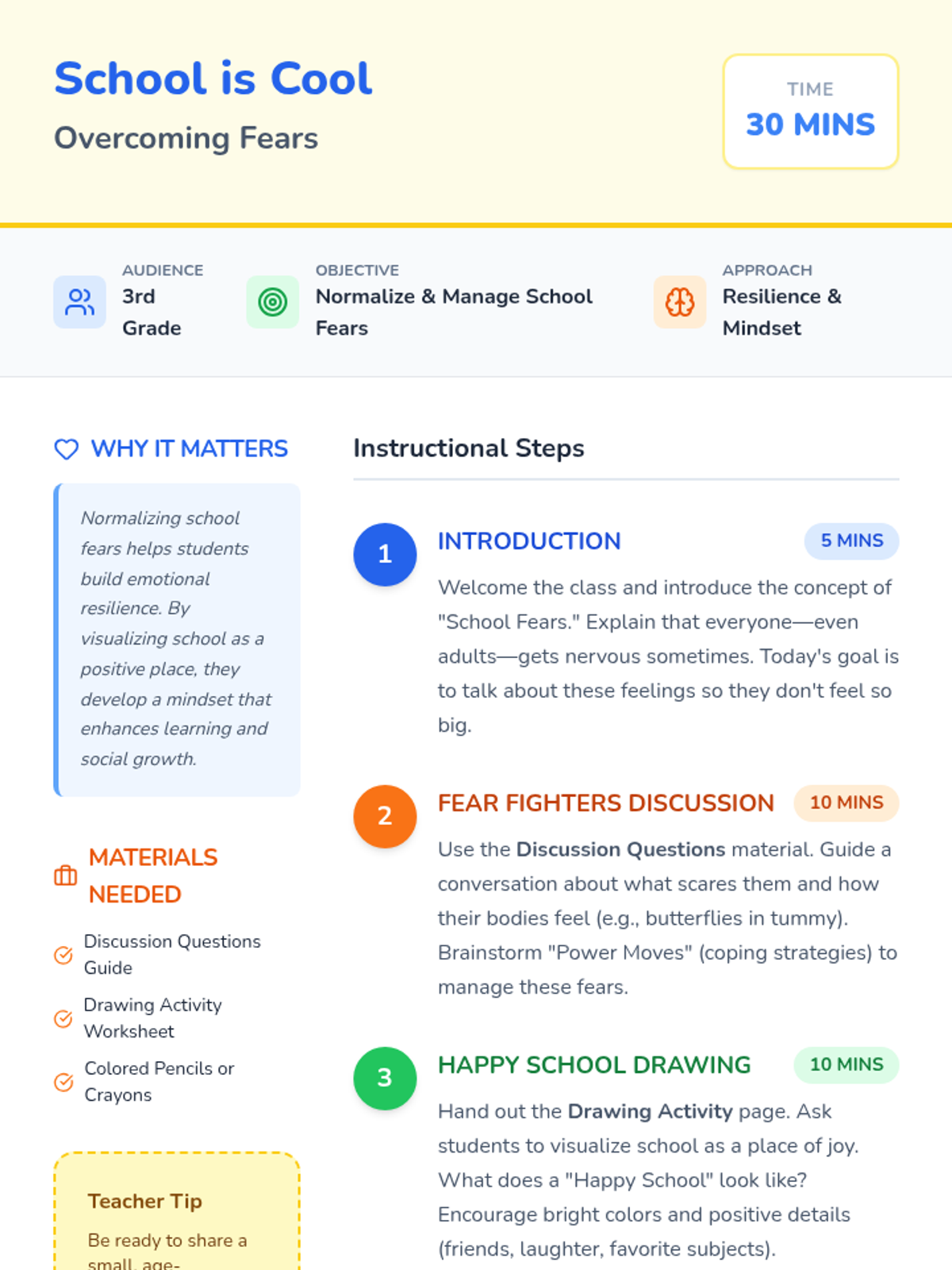 A lesson designed for 3rd-grade students to normalize school-related fears and develop positive coping strategies through discussion and creative expression.