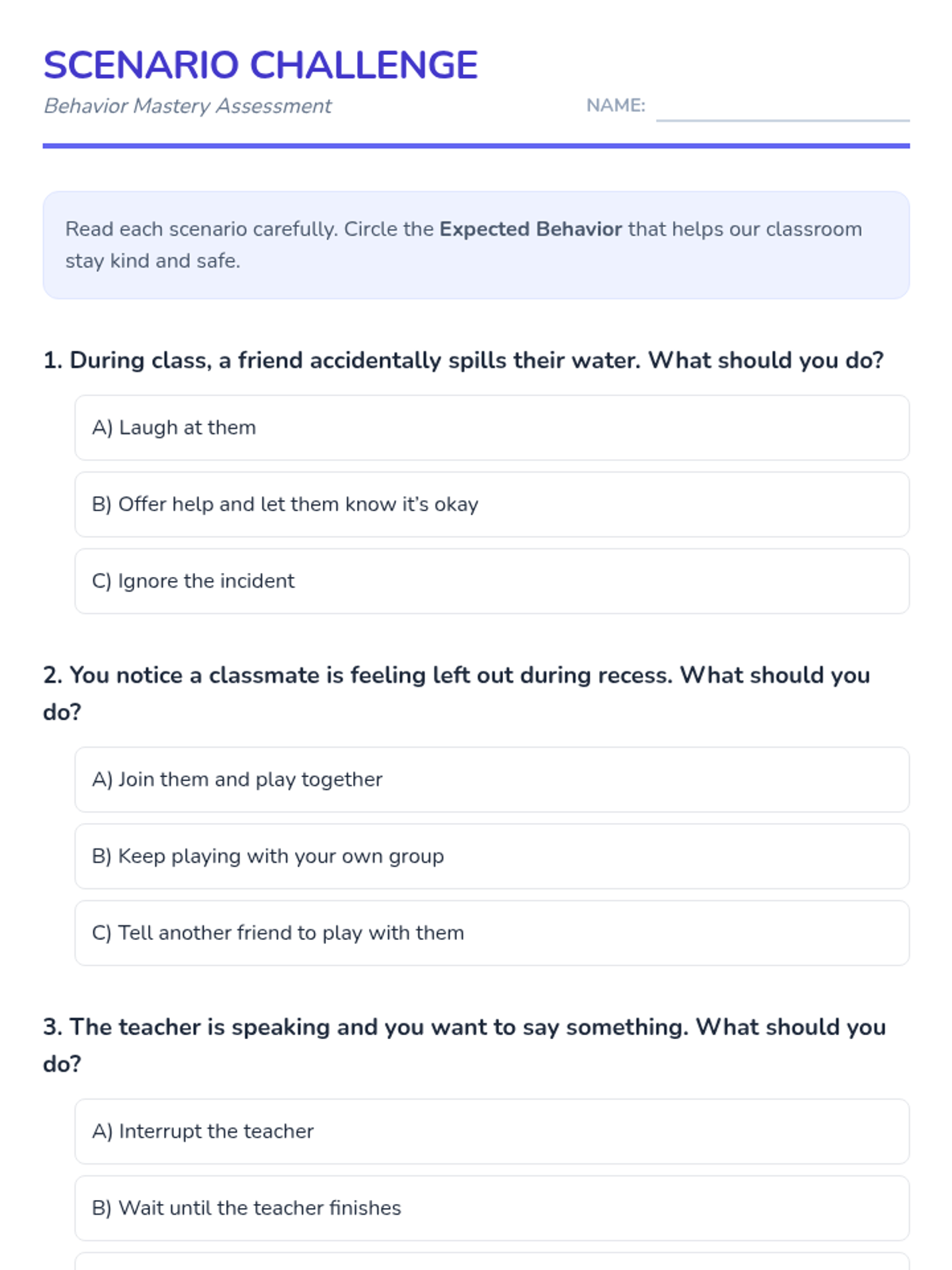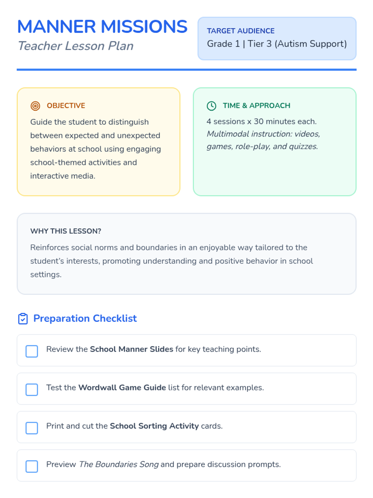 A four-session lesson designed to help students understand social norms and boundaries at school using videos, interactive games, and scenario-based practice.
