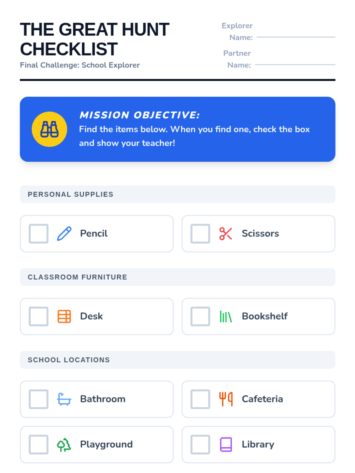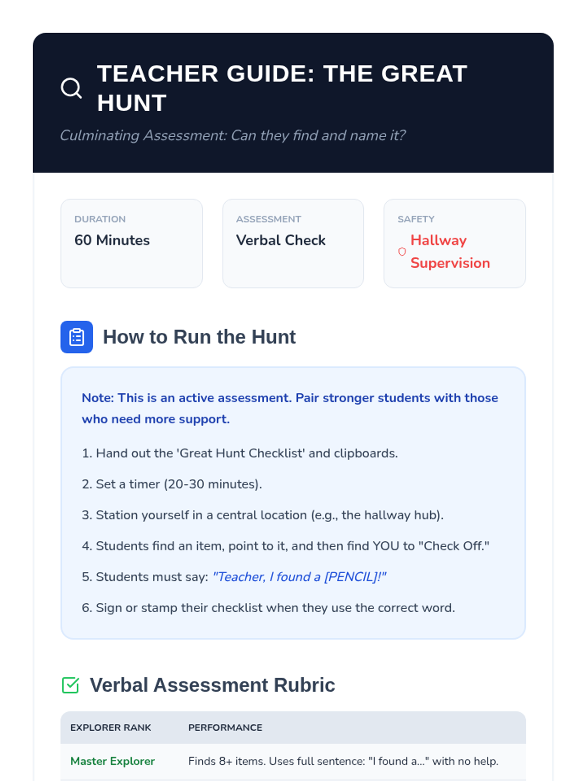 A culminating scavenger hunt where students find and name items and places using full sentences.