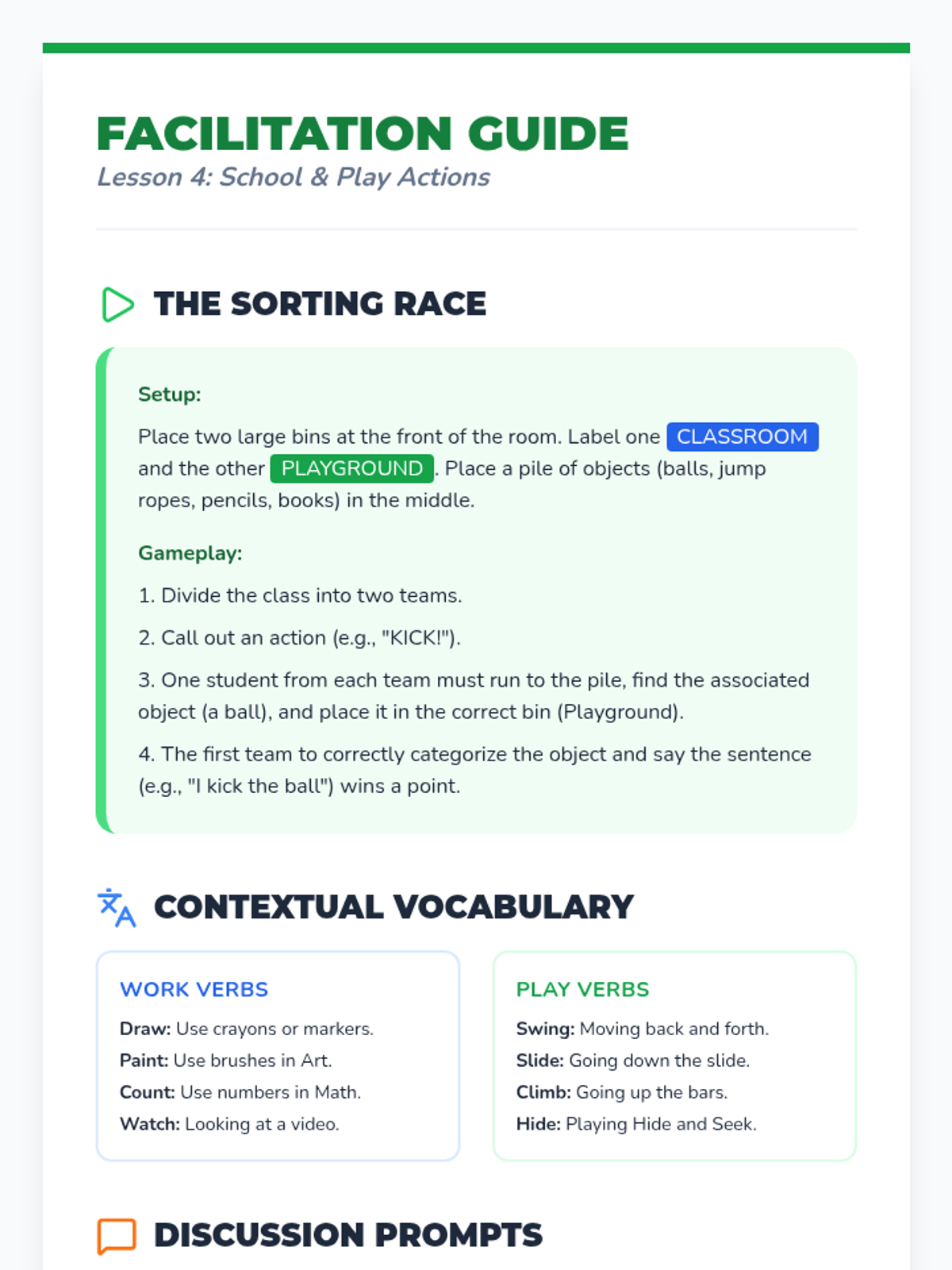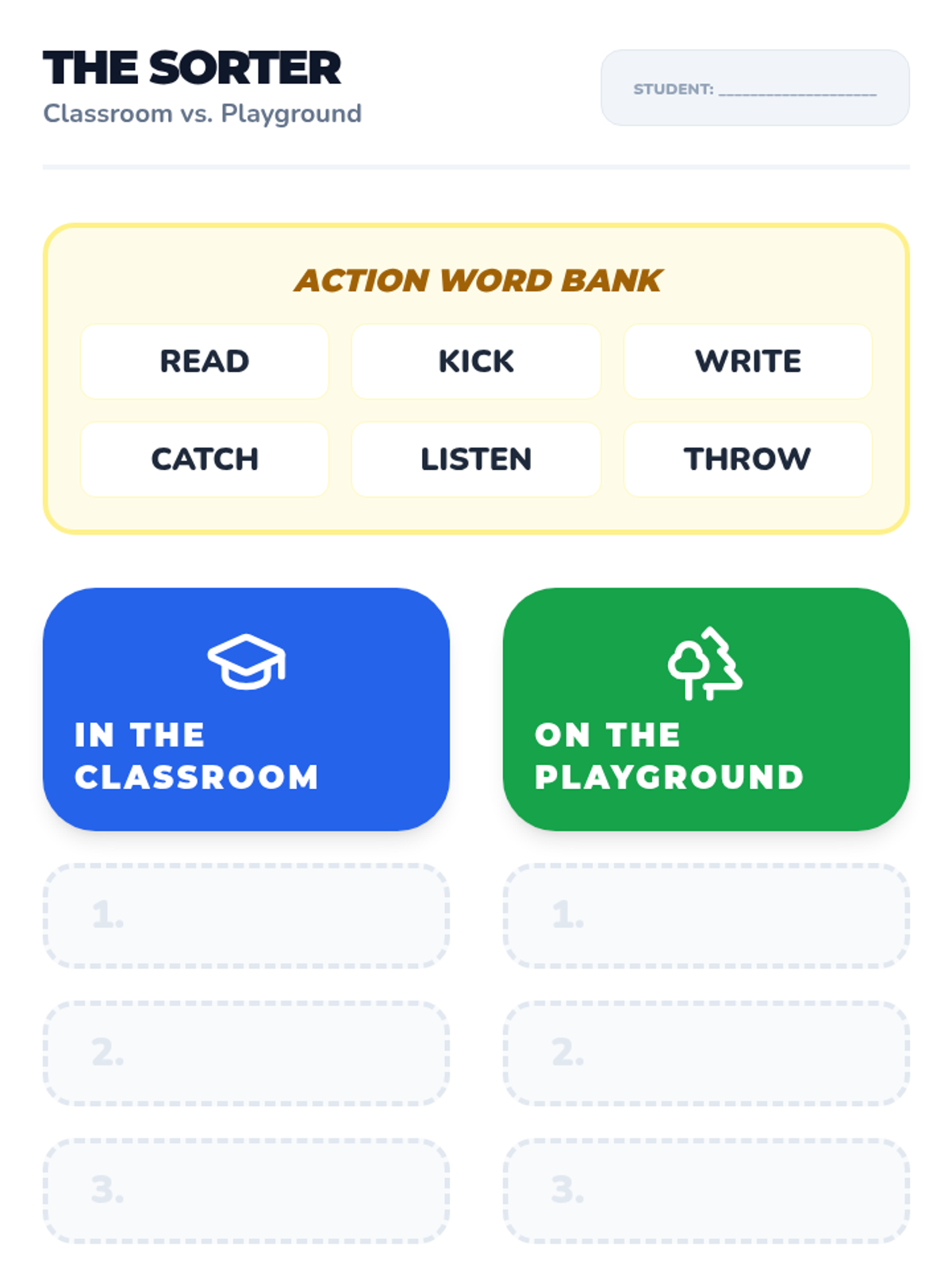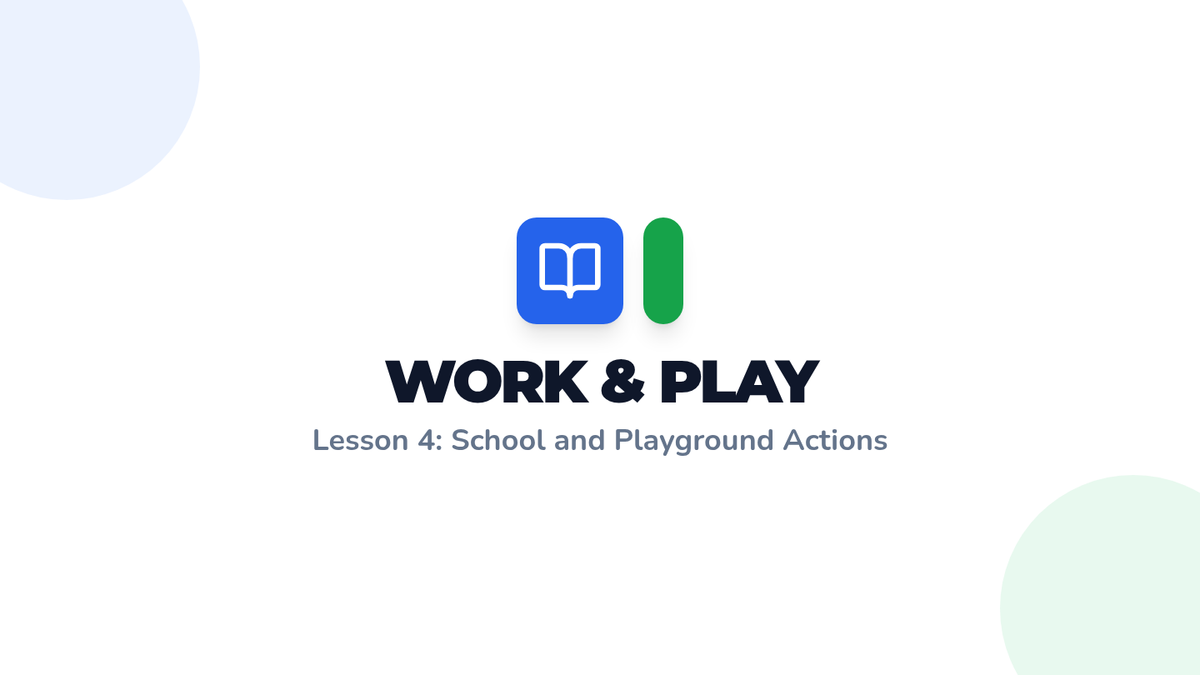 Vocabulary expands to include classroom and playground verbs, requiring students to categorize actions based on context.