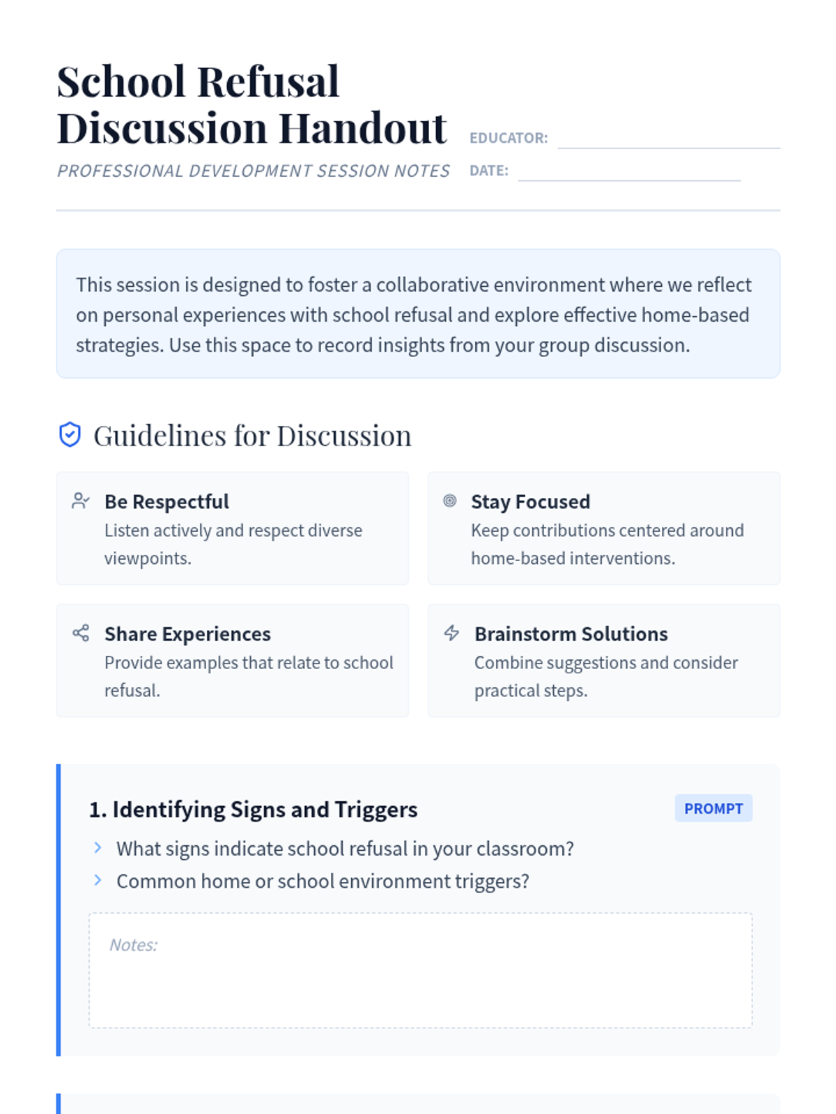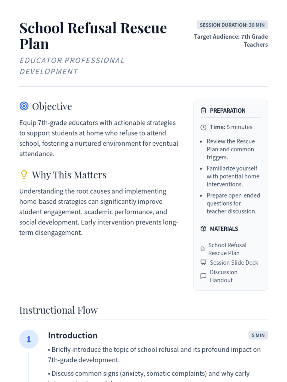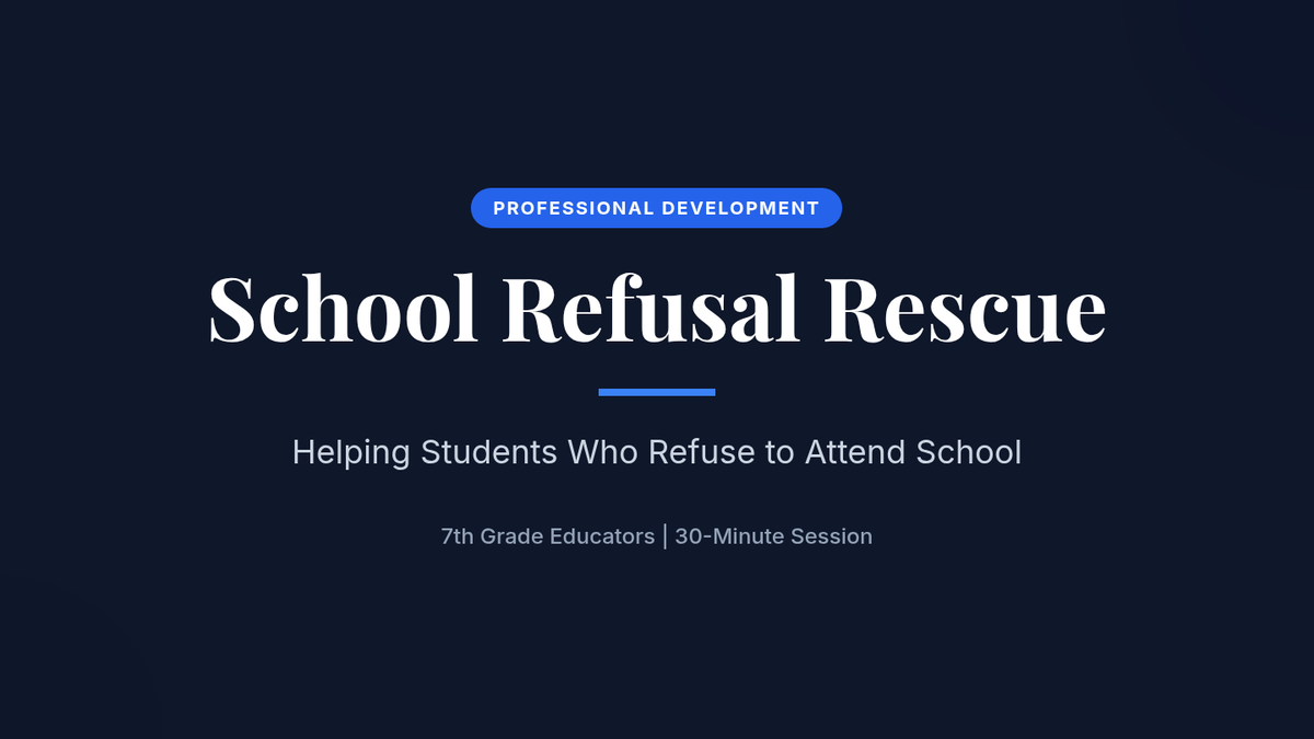A professional development session for 7th-grade educators focused on identifying the root causes of school refusal and implementing practical, home-based support strategies to re-engage students.