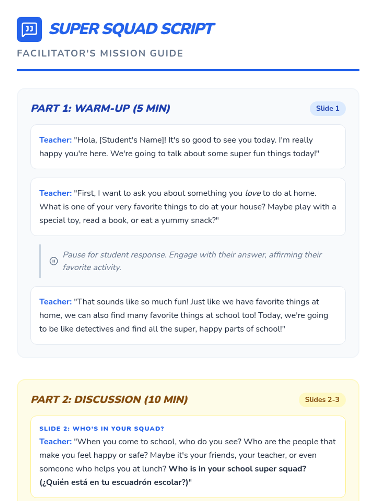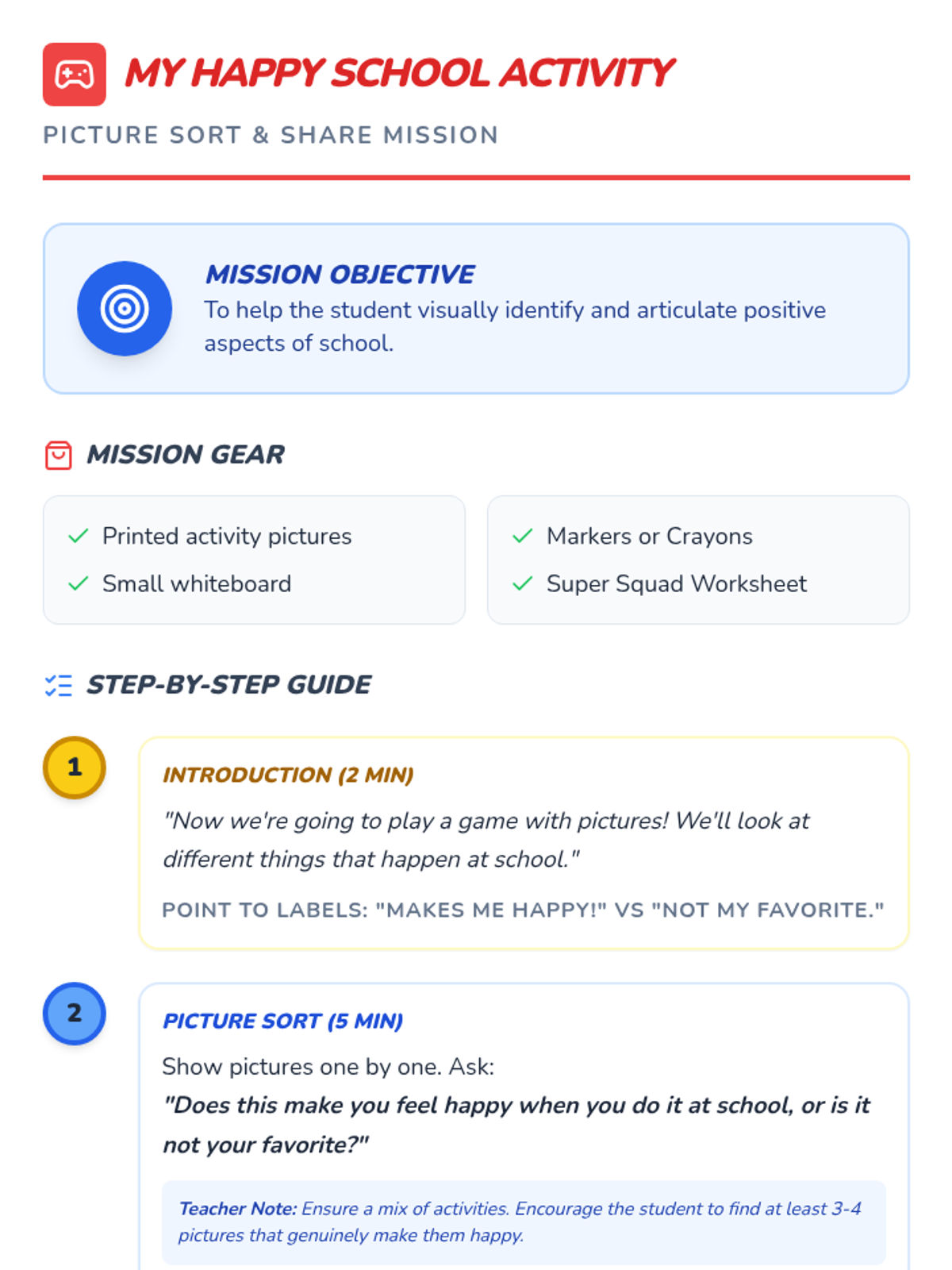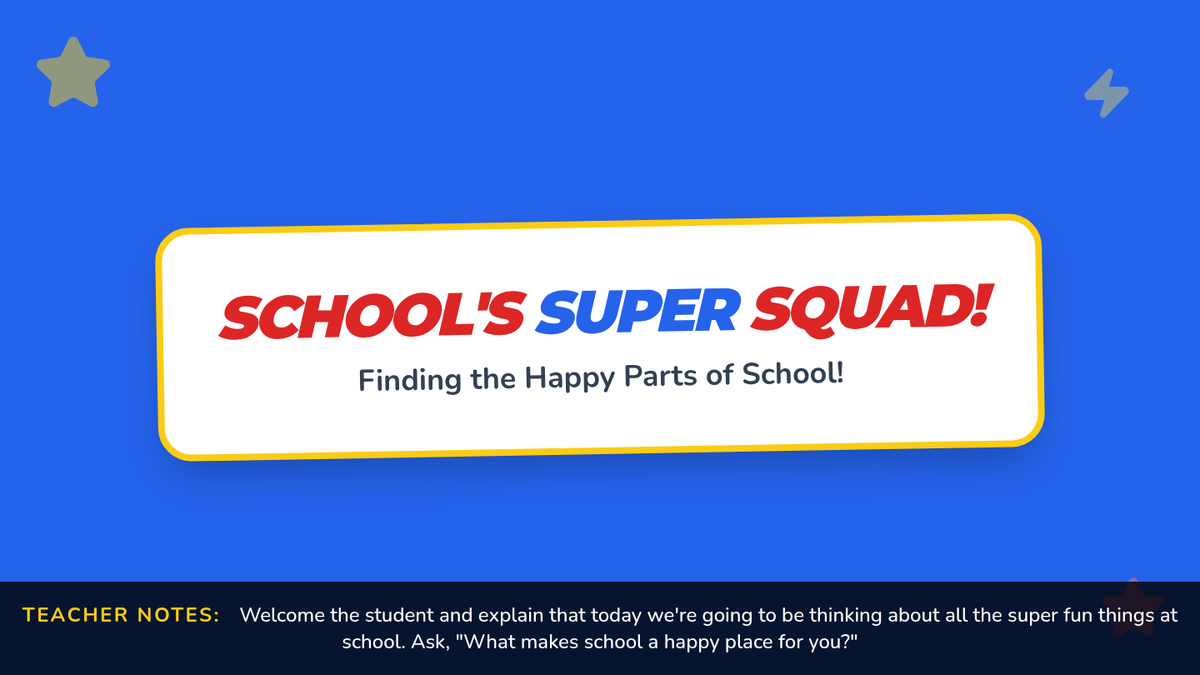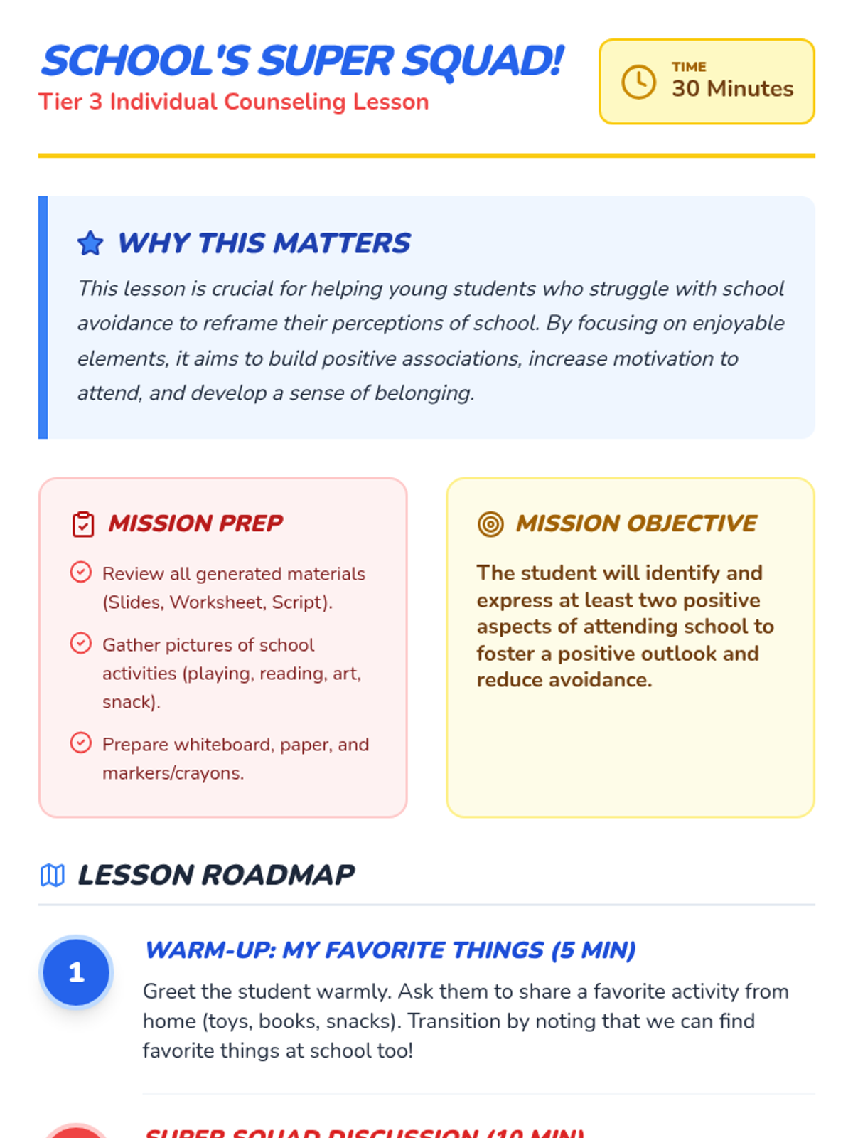 This 30-minute, individual Tier 3 lesson for a kindergartner focuses on identifying positive aspects of school to address school avoidance. It helps the student explore enjoyable activities and people at school, building a more positive association with the learning environment.