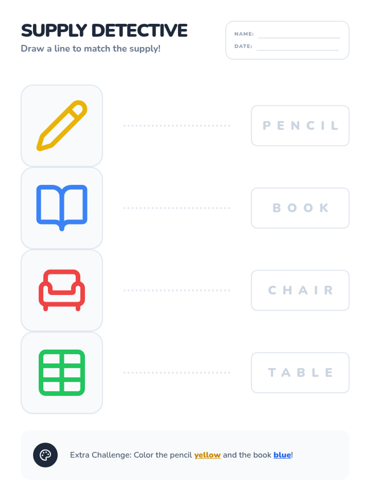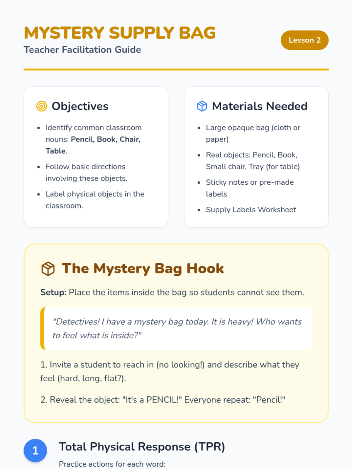 Learners focus on high-frequency nouns like pencil, book, chair, and table through a mystery bag sensory activity and classroom labeling.