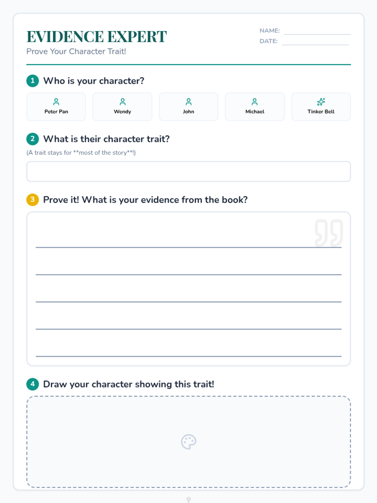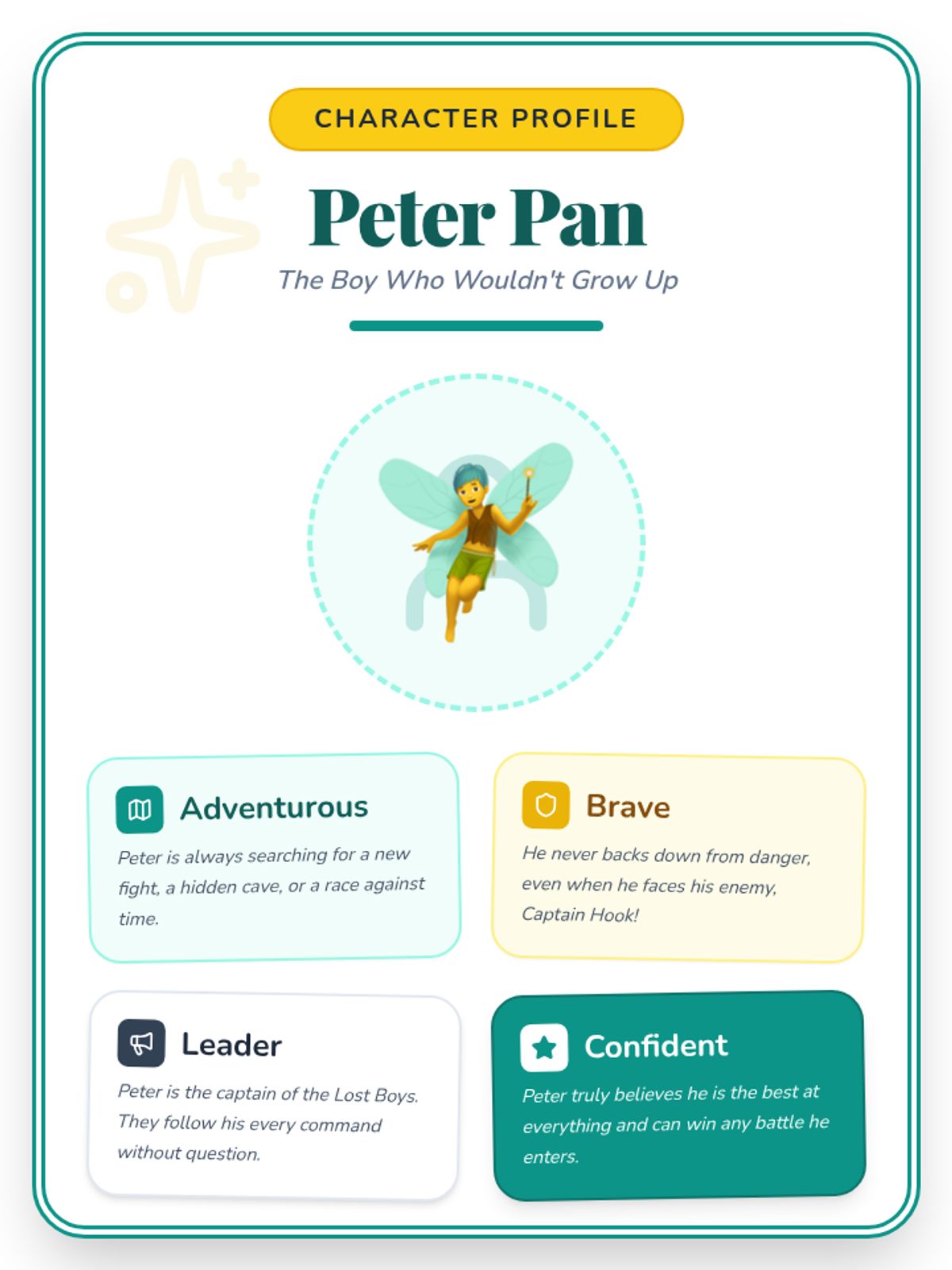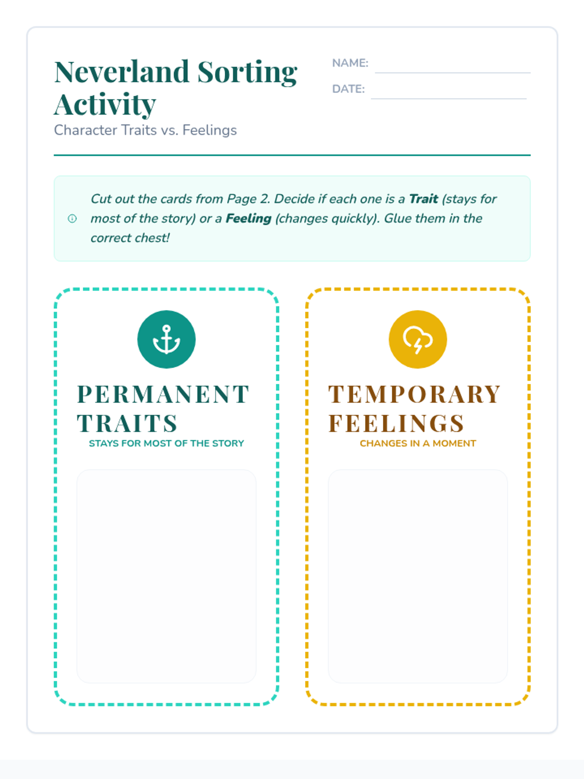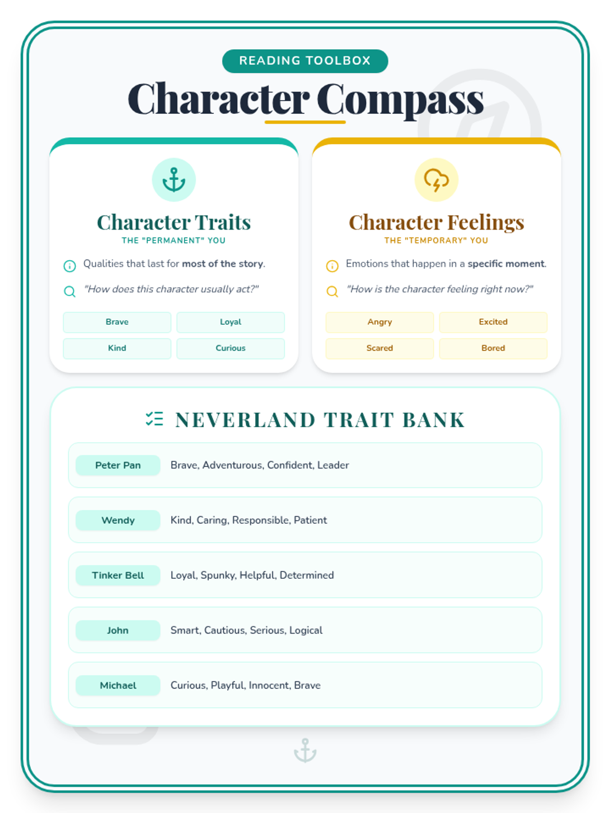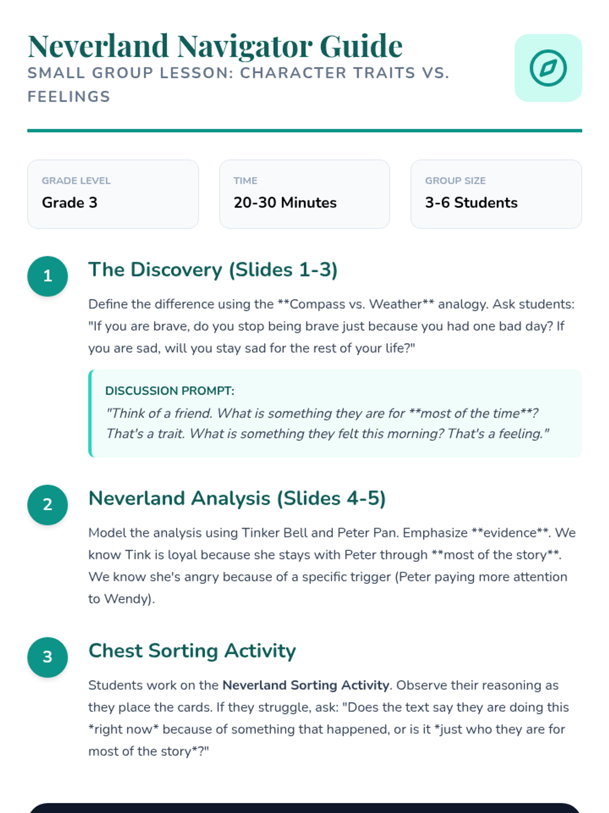 A small group lesson for Grade 3 students focusing on distinguishing between character traits and feelings using the characters of Wendy, John, Michael, Peter Pan, and Tinker Bell. Students will analyze these characters to identify permanent personality traits versus temporary emotional states.