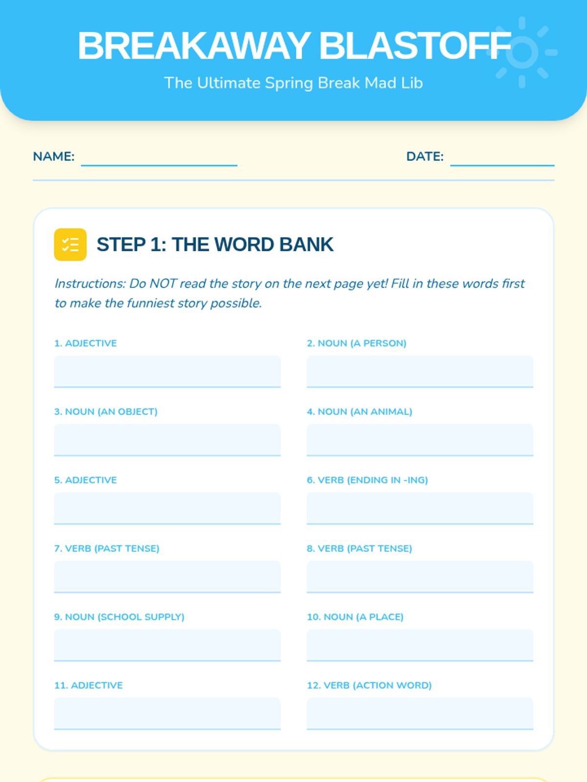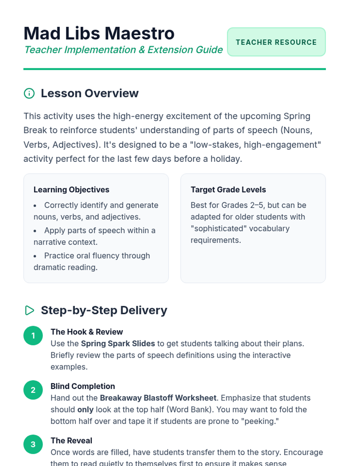 A fun, high-energy lesson focused on creative writing and parts of speech through a Spring Break-themed Mad Lib activity. Students will practice identifying nouns, verbs, and adjectives while sharing their excitement for the upcoming break.