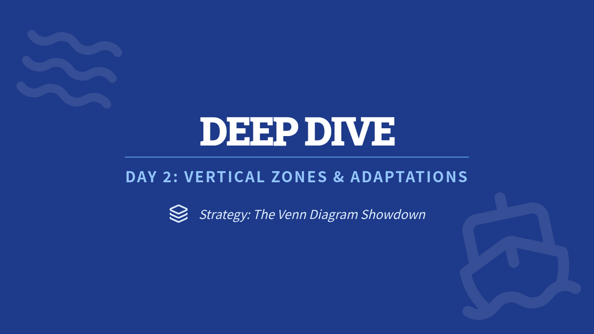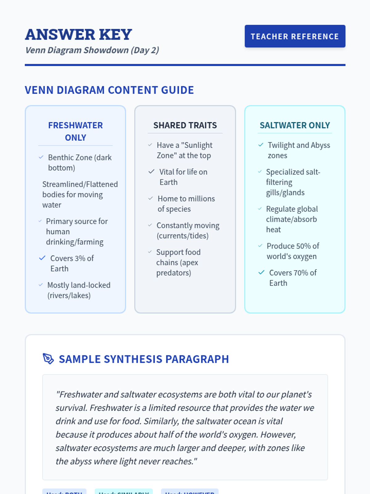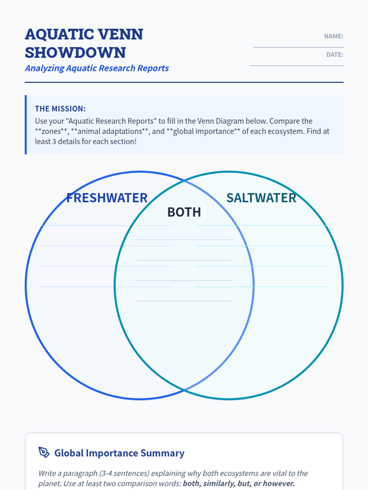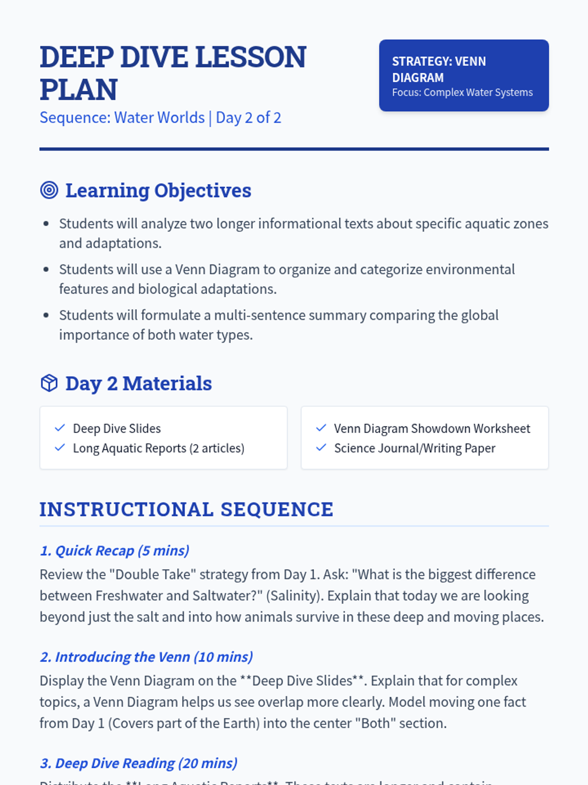 Day 2 of the Water Worlds unit. Students tackle longer informational texts and transition to using a Venn Diagram strategy to categorize similarities and differences in environmental zones, animal adaptations, and global importance.