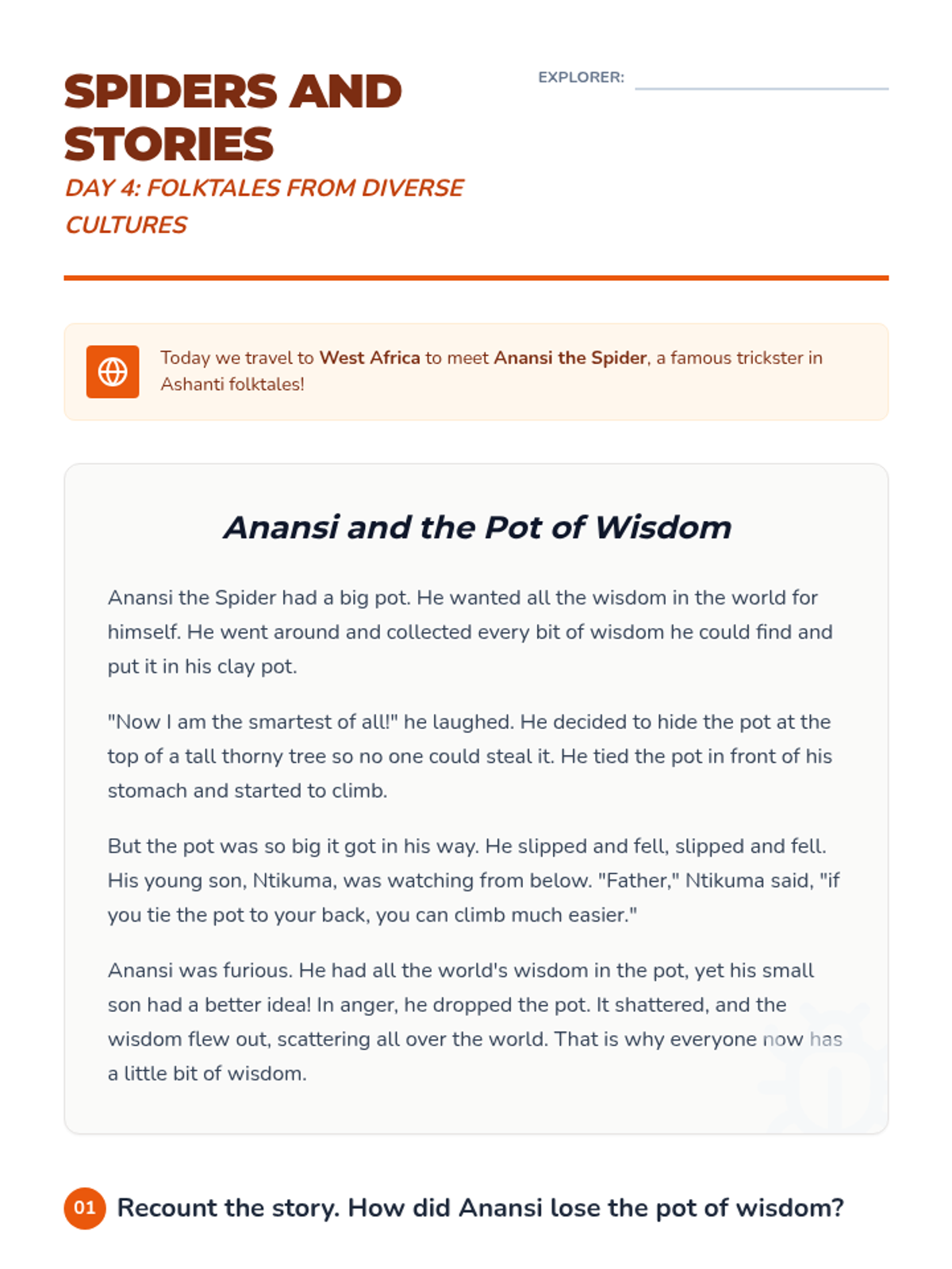 Explore folktales from West Africa featuring Anansi the Spider to understand stories from diverse cultures and how their messages apply universally.