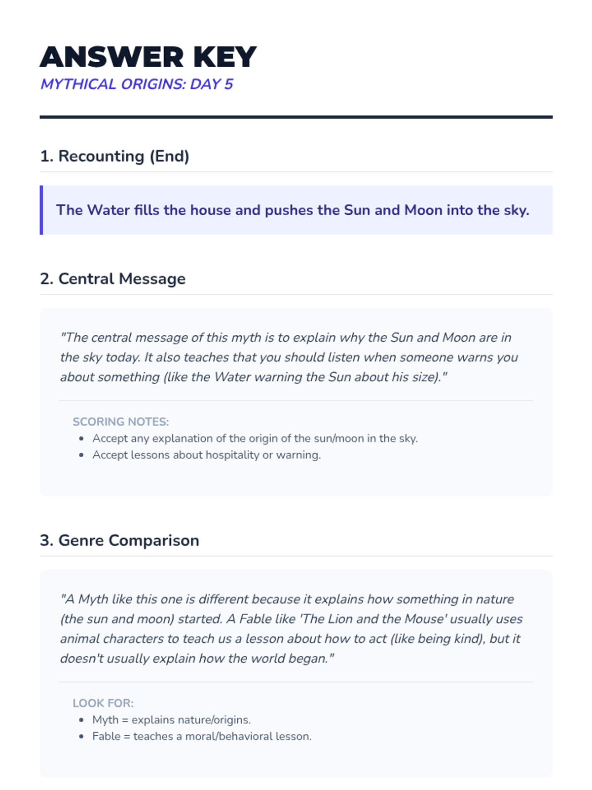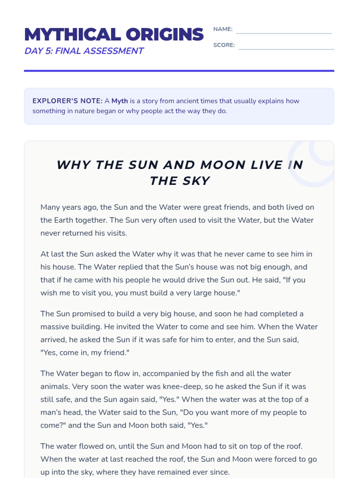 Distinguish myths from other story types and complete a final assessment on recounting and identifying central messages across different genres.