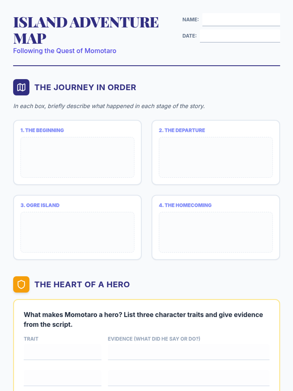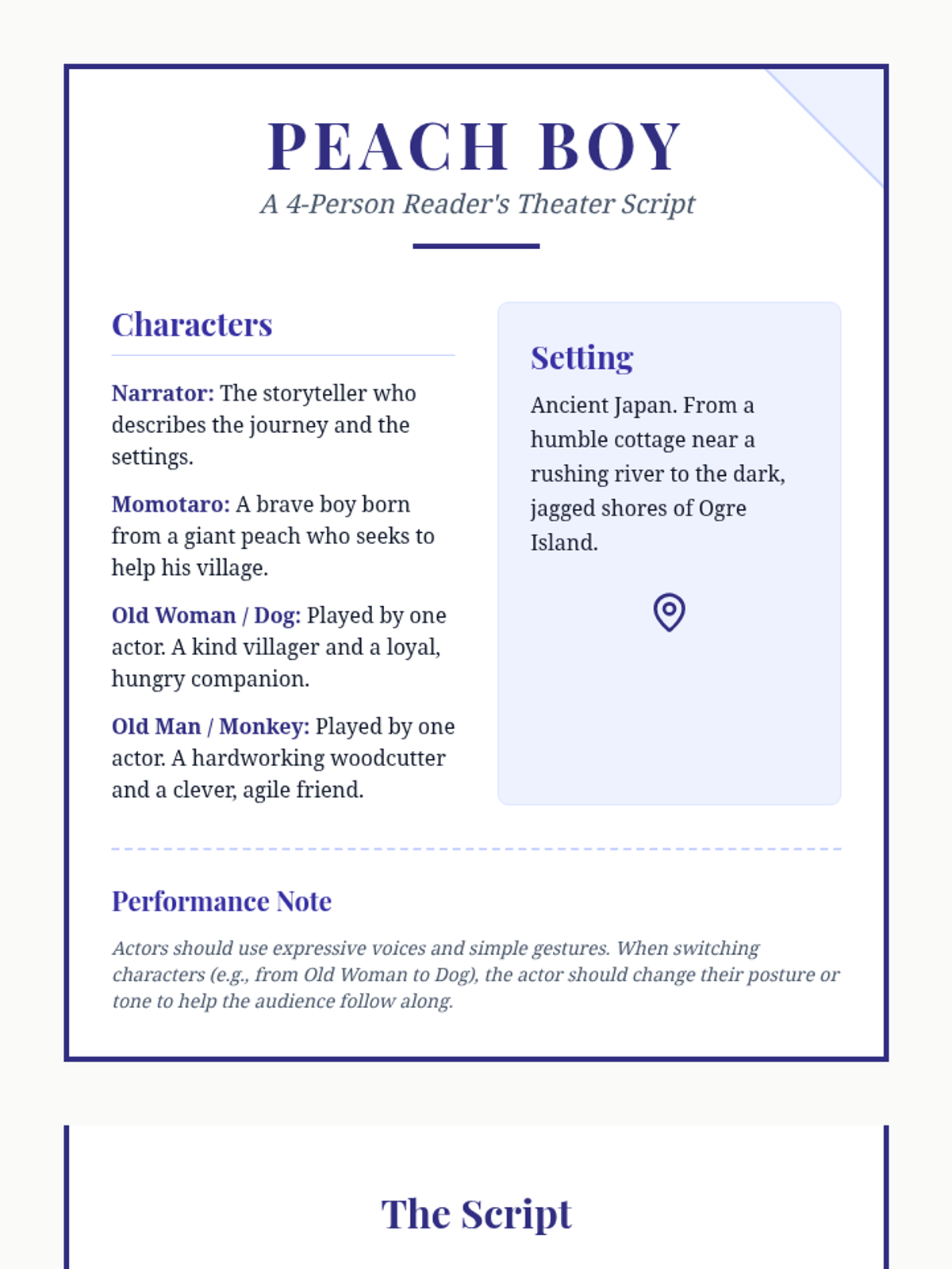A literacy lesson centered around the classic Japanese folktale of Momotaro (Peach Boy), featuring a 4-person reader's theater script, a teacher's guide for performance, and a narrative mapping activity.