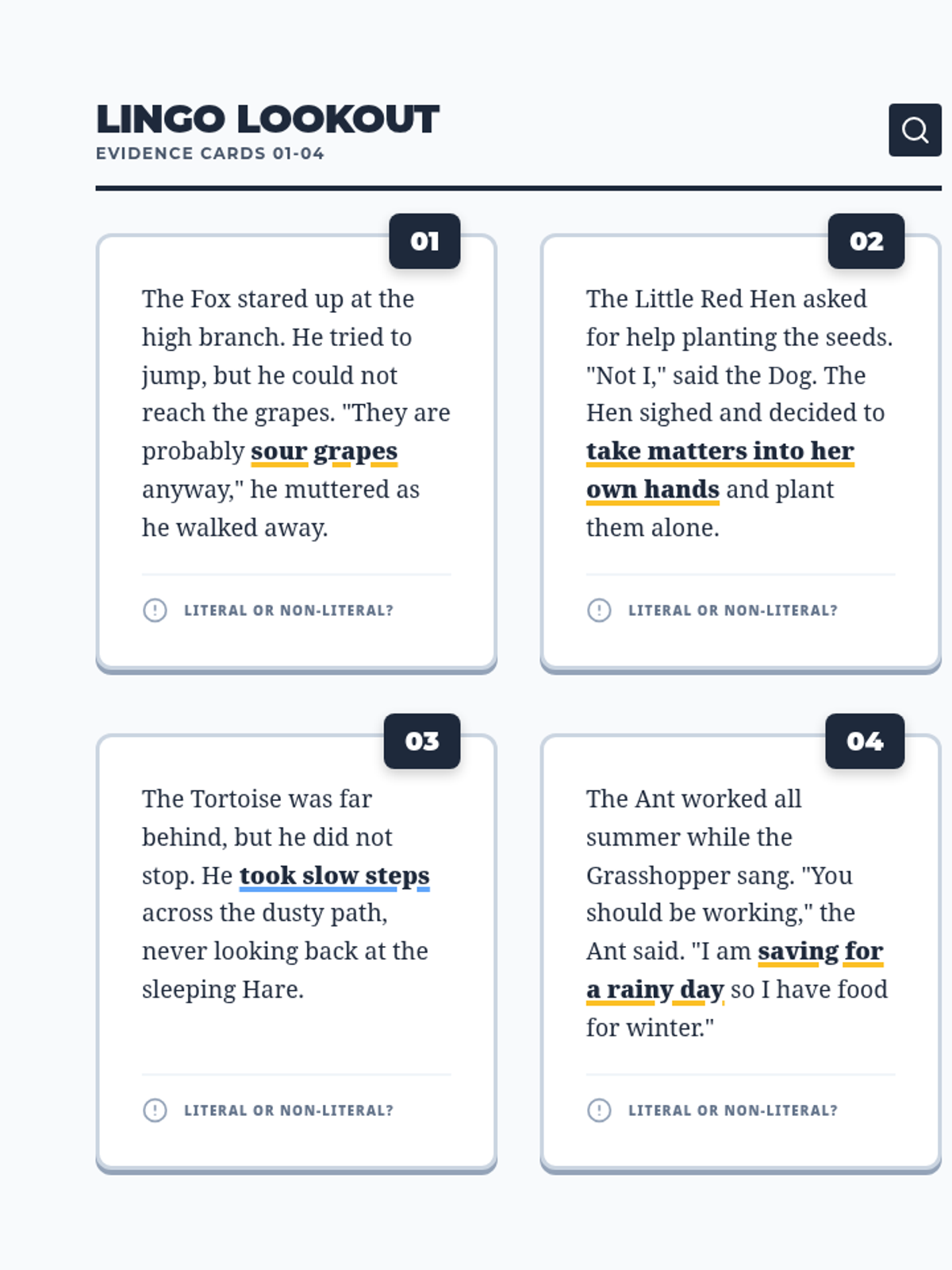 A lesson focused on distinguishing between literal and non-literal language using fables and folktales as context for idiomatic expressions and figurative speech.