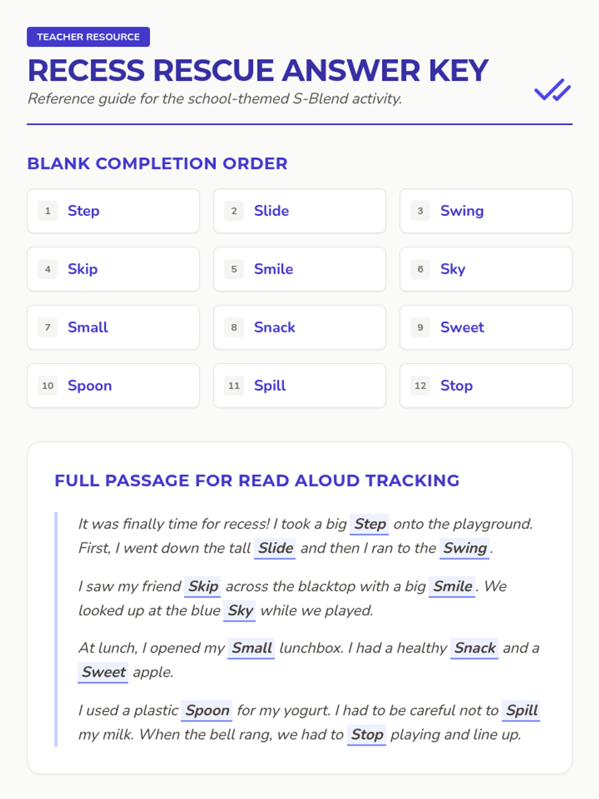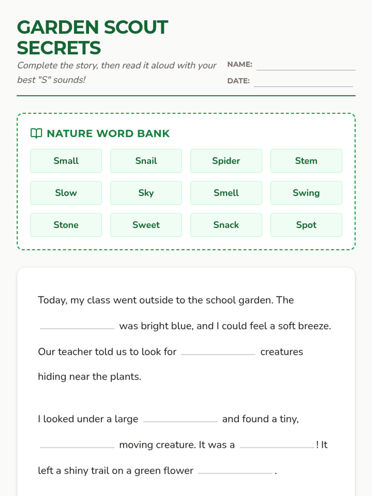 This lesson focuses on identifying and pronouncing mixed s-blends (st, sp, sk, sl, sm, sn, sw) through engaging school and nature-themed reading passages and interactive slides.