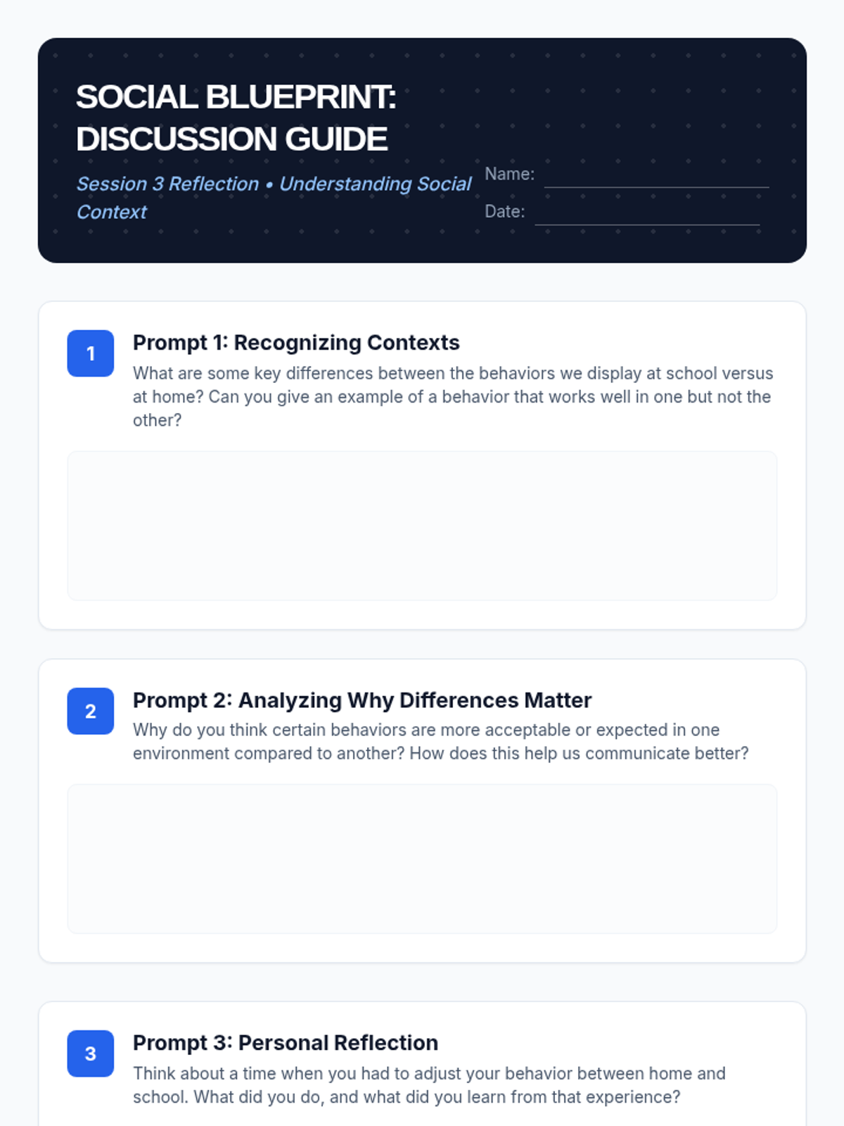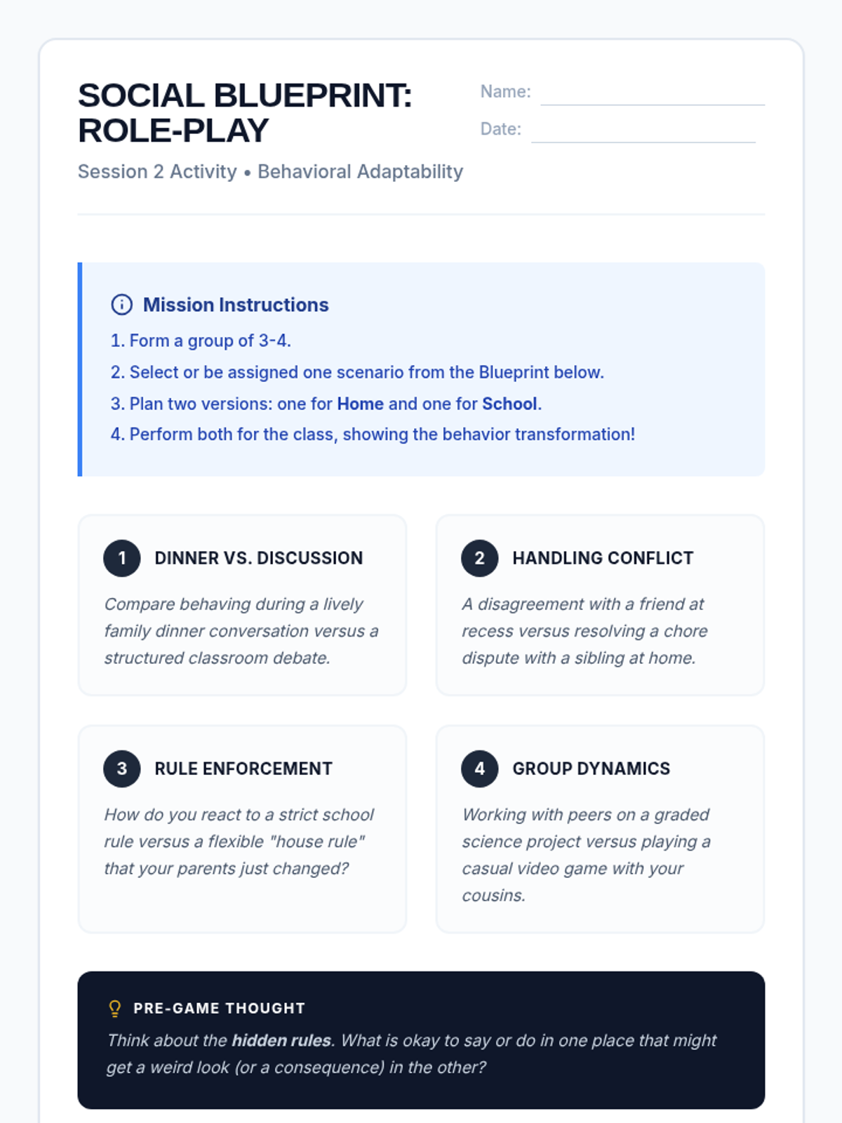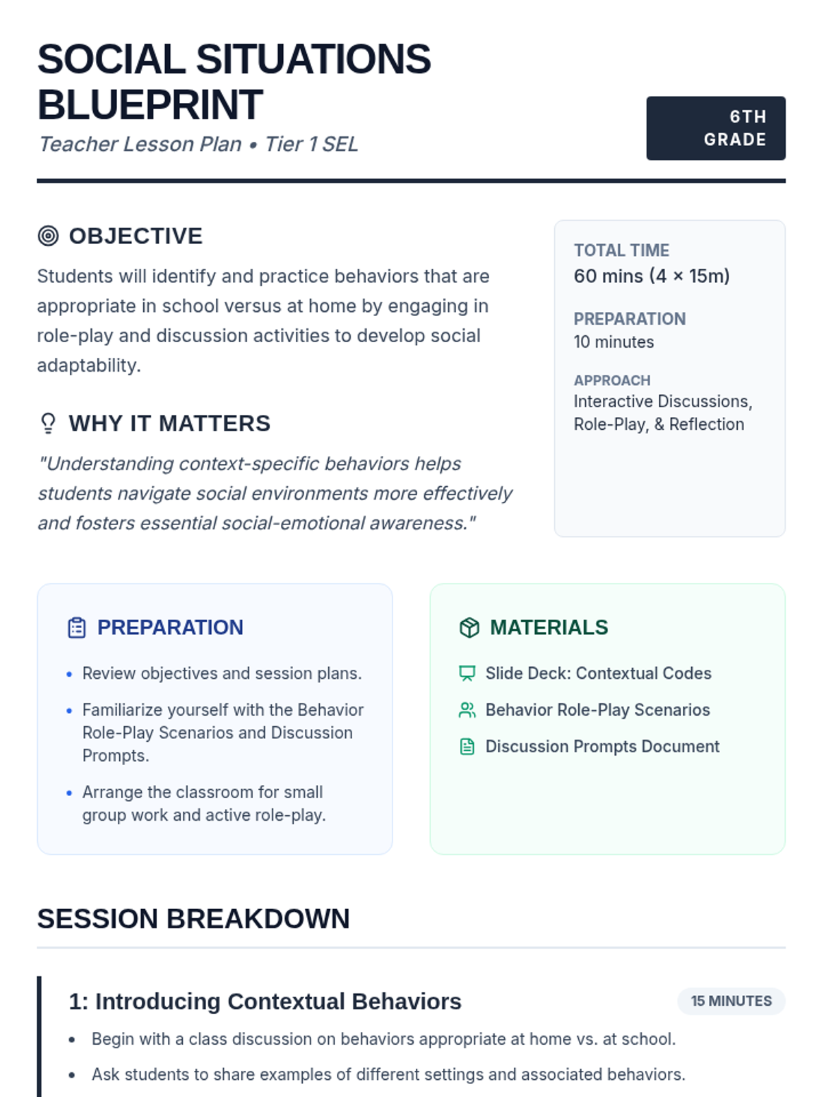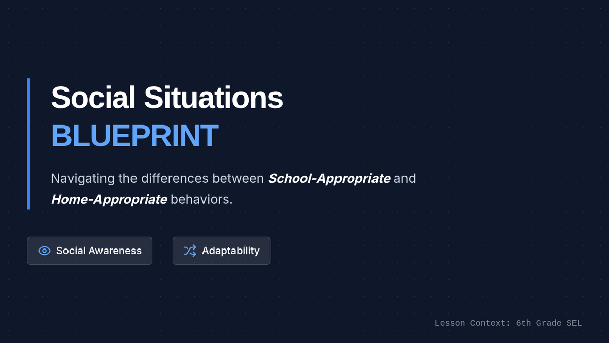 A four-session lesson for 6th graders exploring the differences between school-appropriate and home-appropriate behaviors to build social awareness and adaptability.