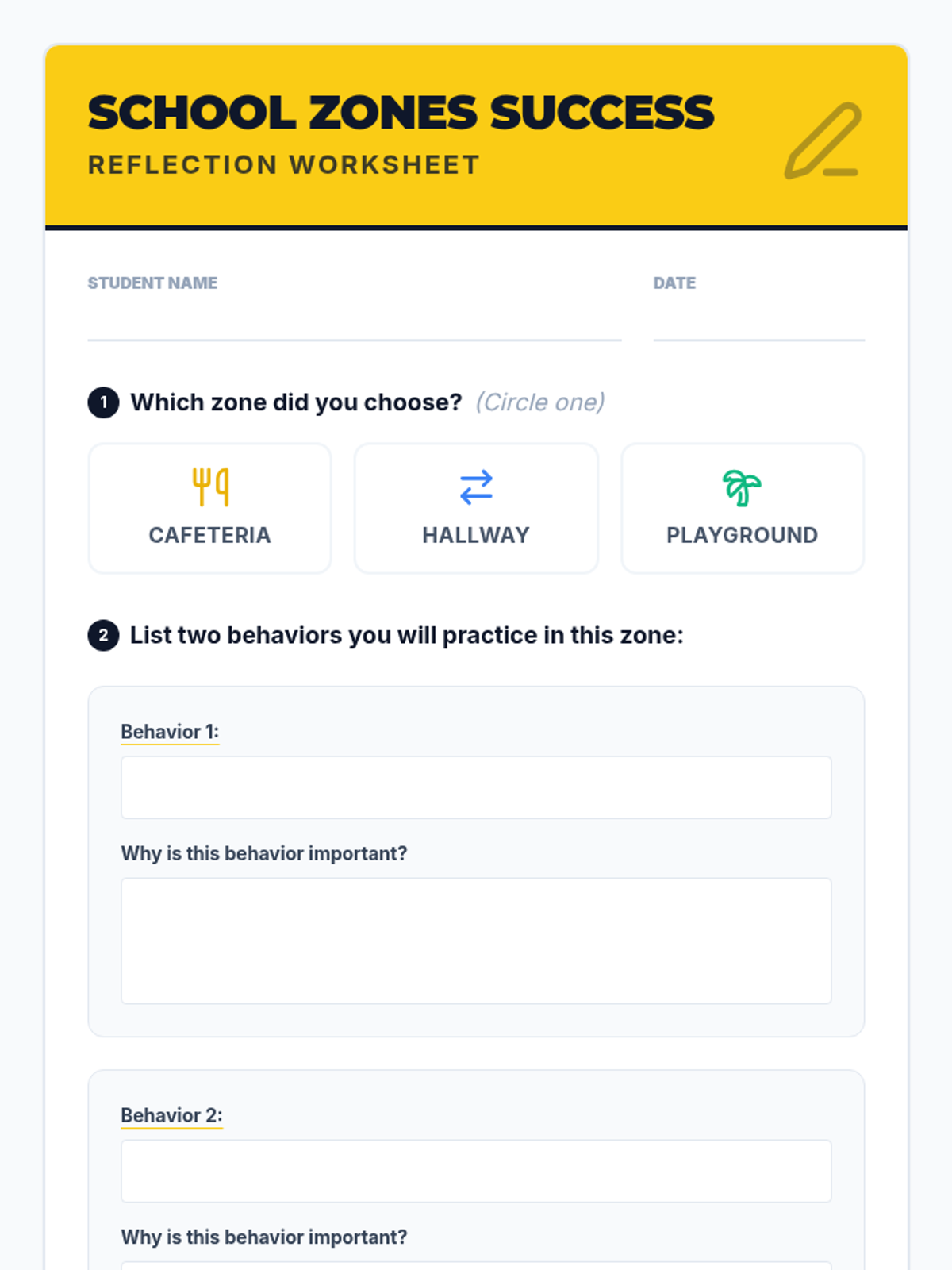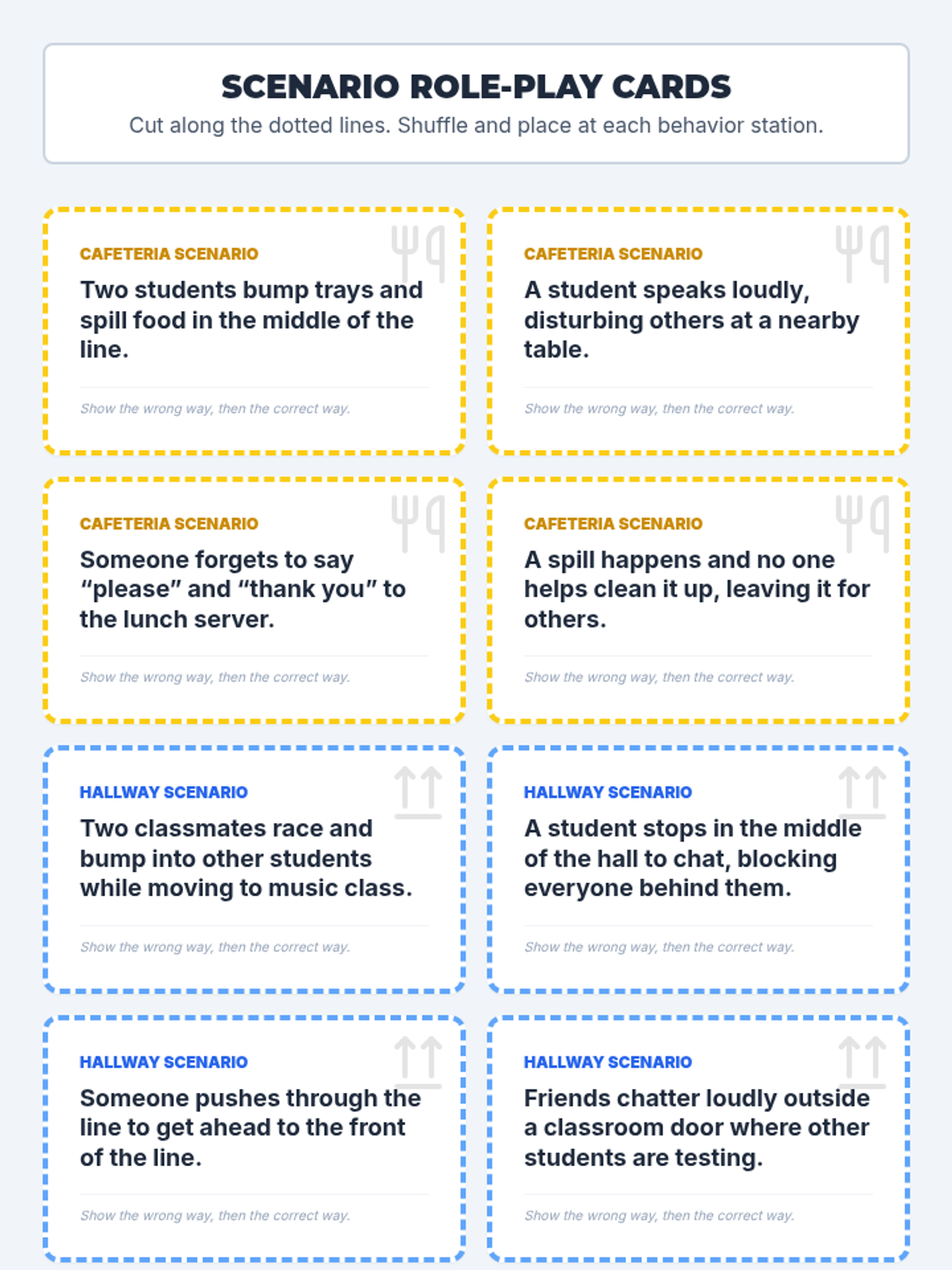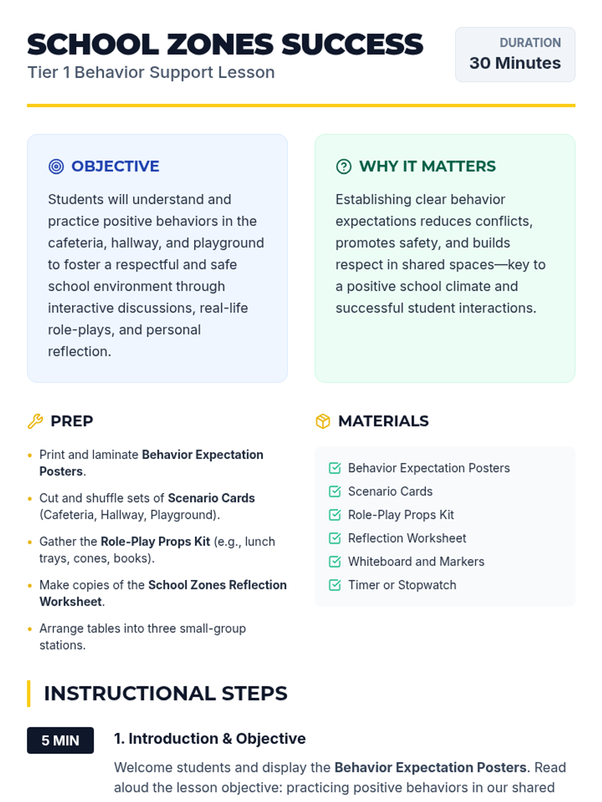 A 30-minute Tier 1 lesson for 5th graders focused on establishing and practicing positive behavior expectations in the cafeteria, hallway, and playground. through interactive discussion and role-play.