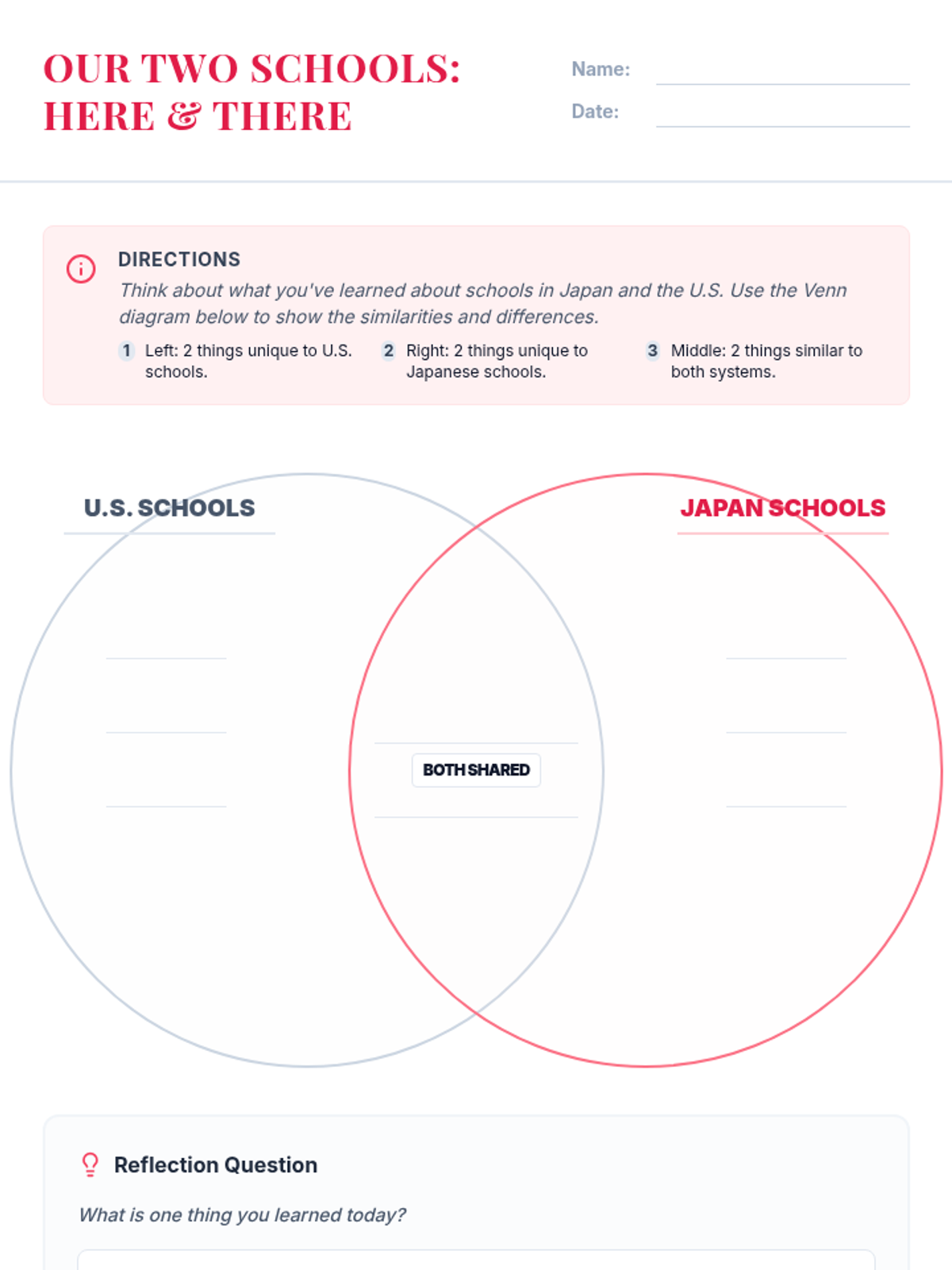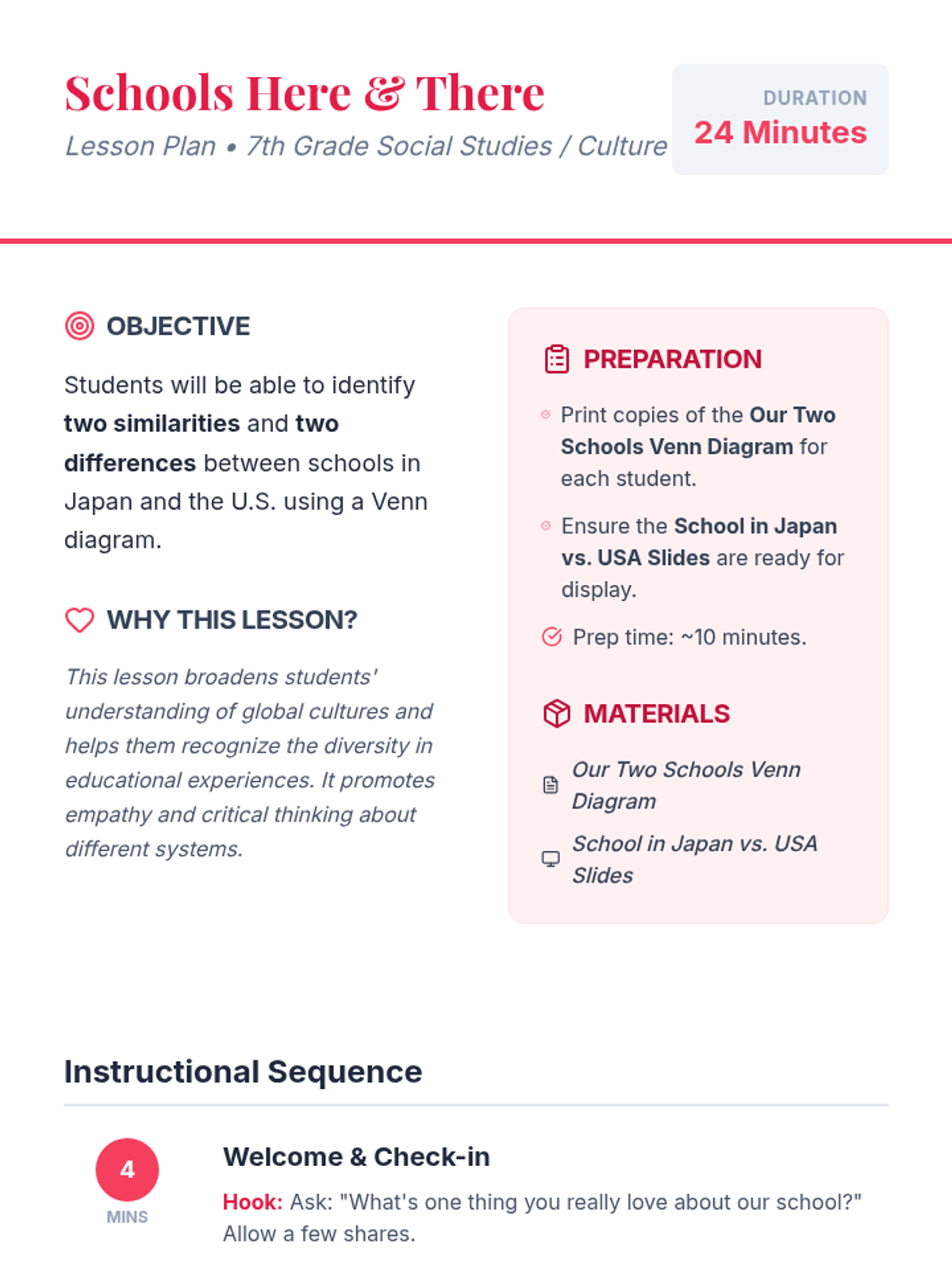 A 24-minute lesson for 7th-grade students comparing school life in Japan and the U.S. to foster a global perspective. Students will use a Venn diagram to identify similarities and differences in uniforms, lunch routines, and school culture.