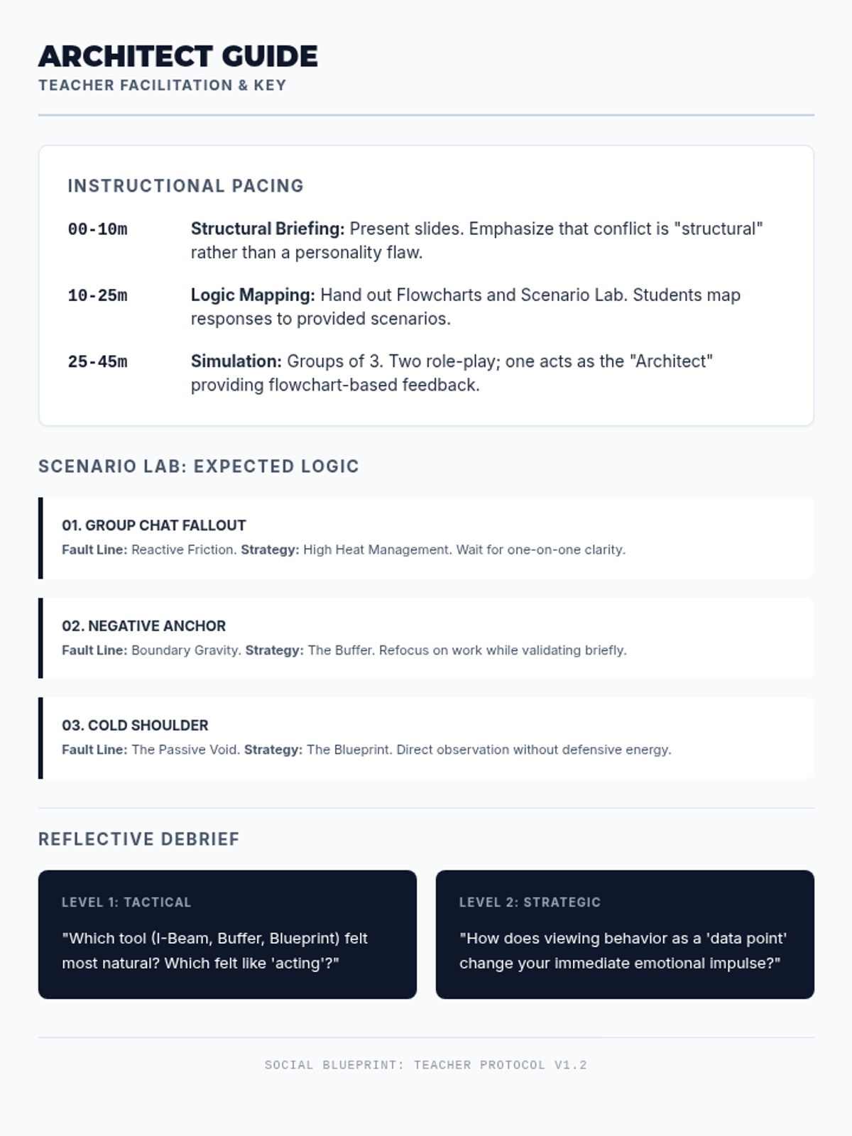 A high school lesson focused on developing professional and interpersonal strategies for navigating peer conflict and difficult social behaviors using a 'Social Architecture' framework.