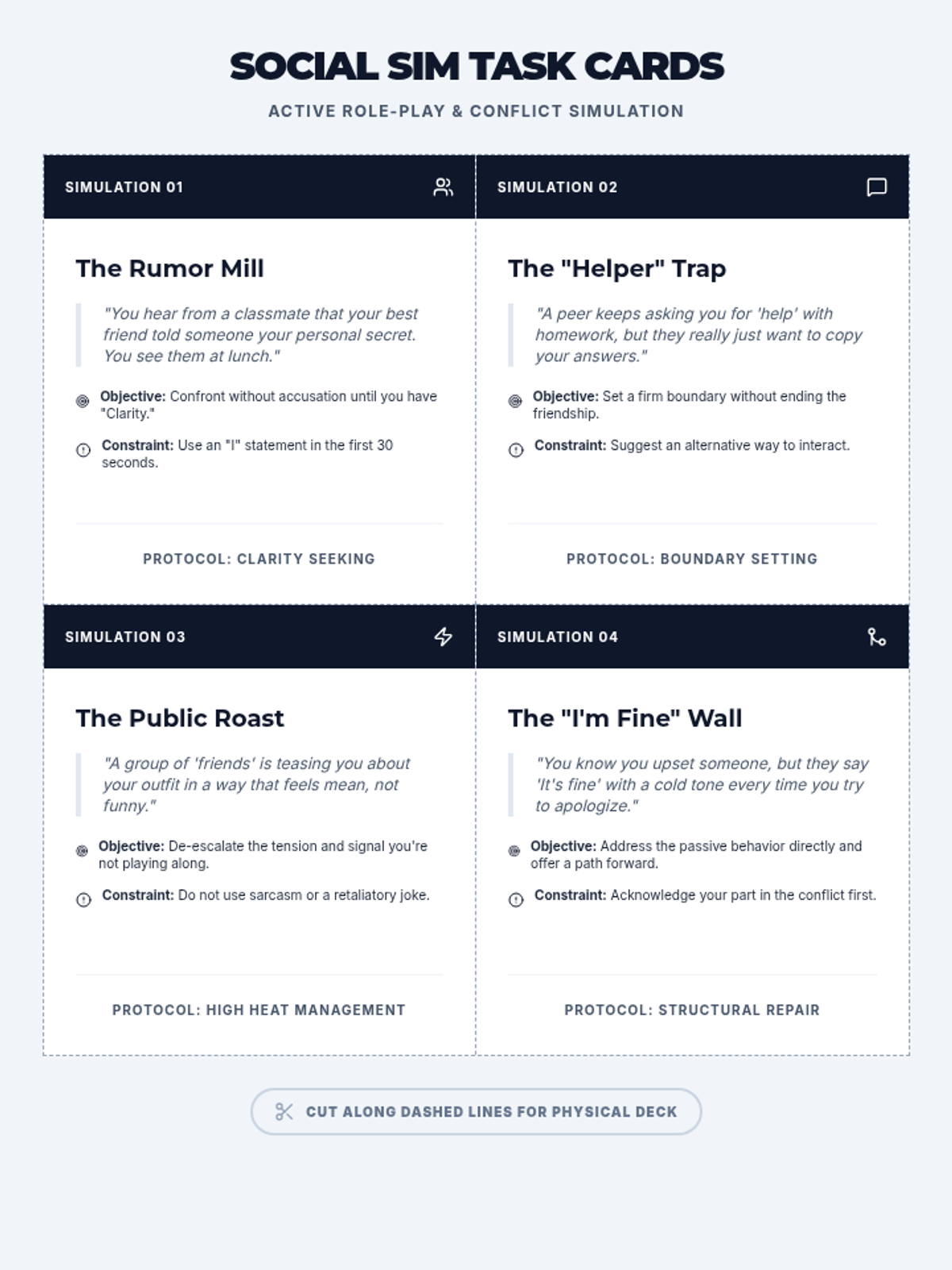 A practical workshop on active listening and 'I' statements to equip students with conflict resolution skills.