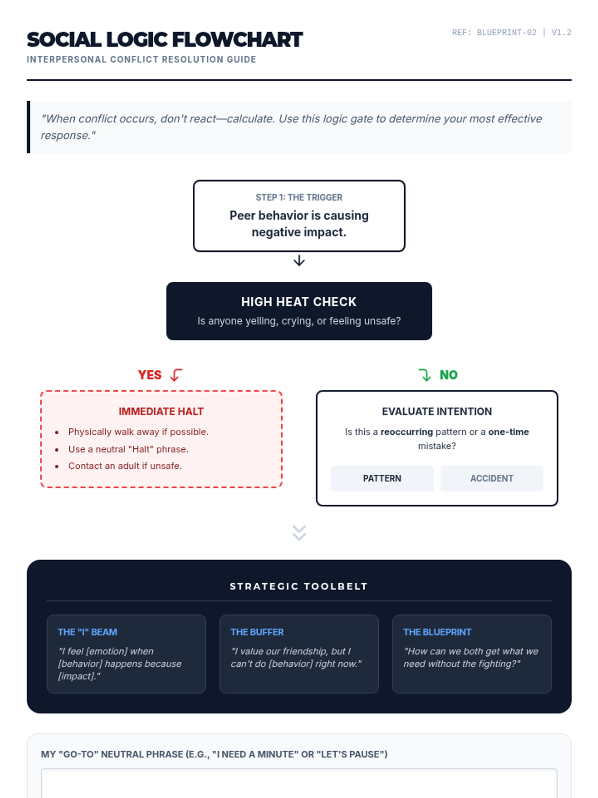 A comprehensive anger management module for teenagers, focusing on identifying emotional triggers, mastering 'I' statements, and implementing de-escalation strategies through a modern technical blueprint aesthetic.