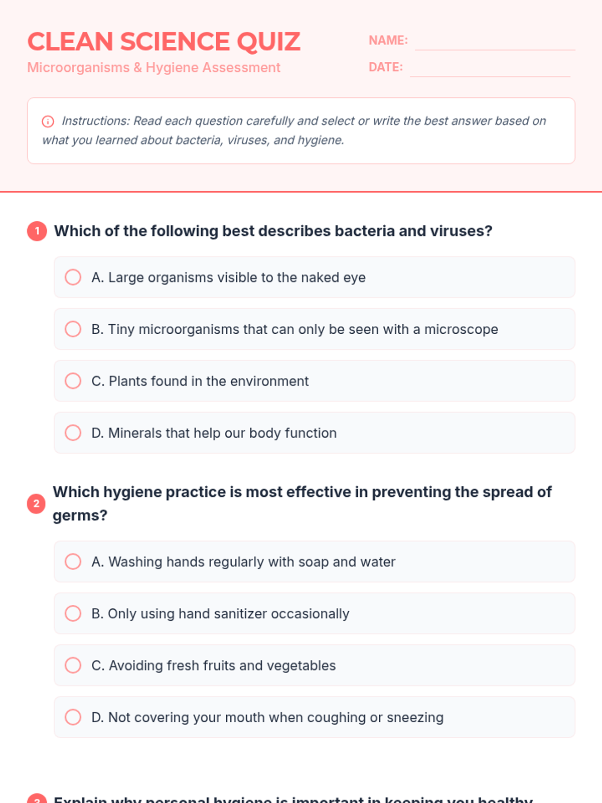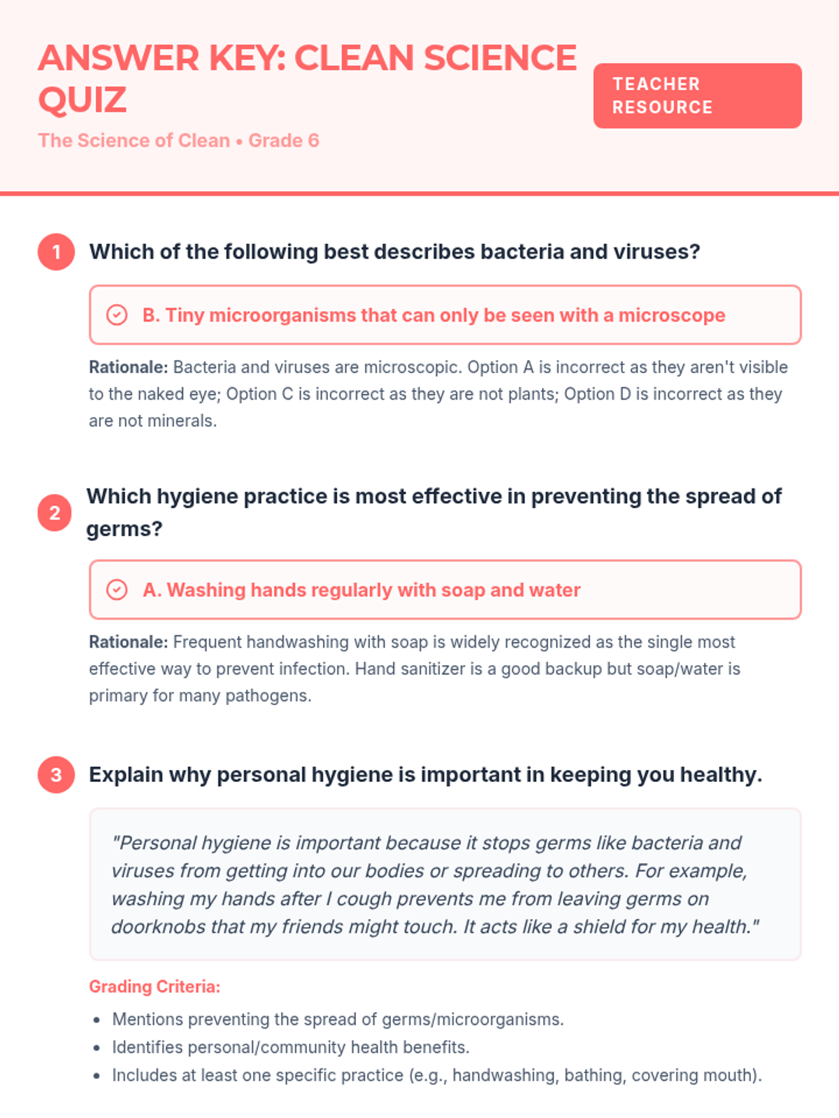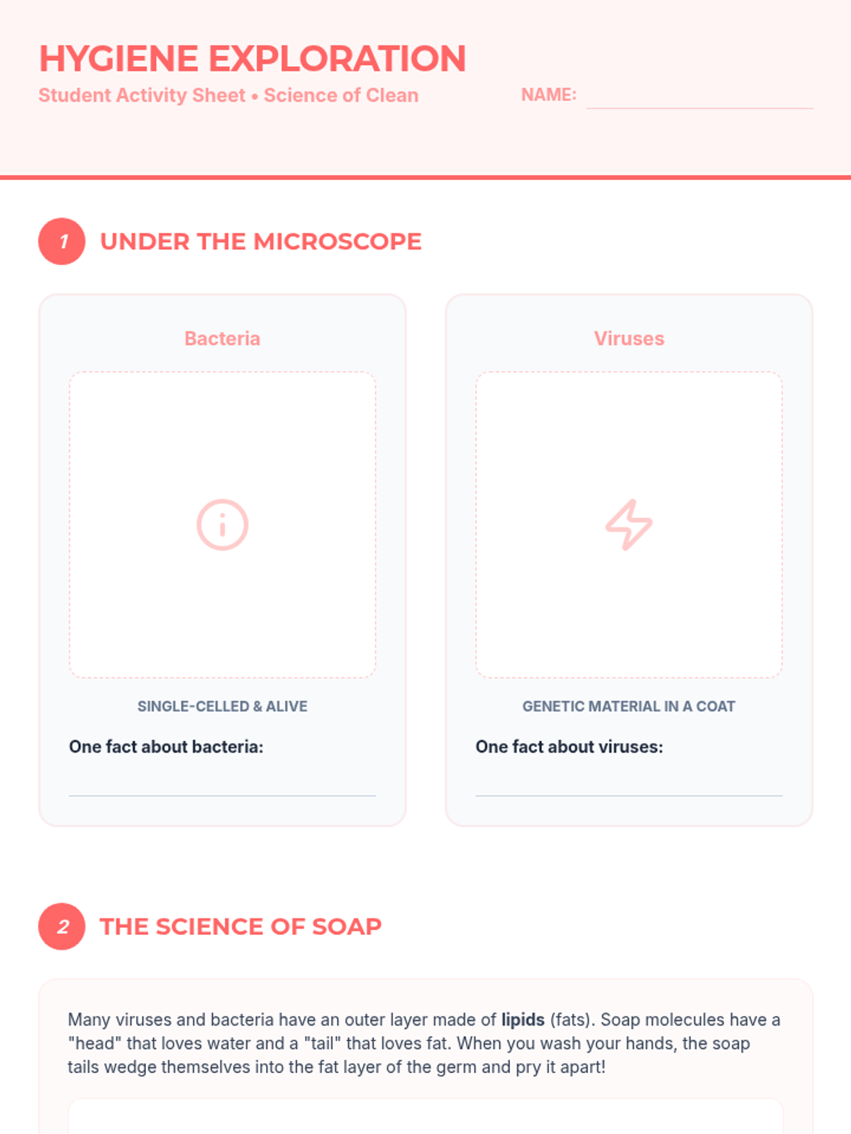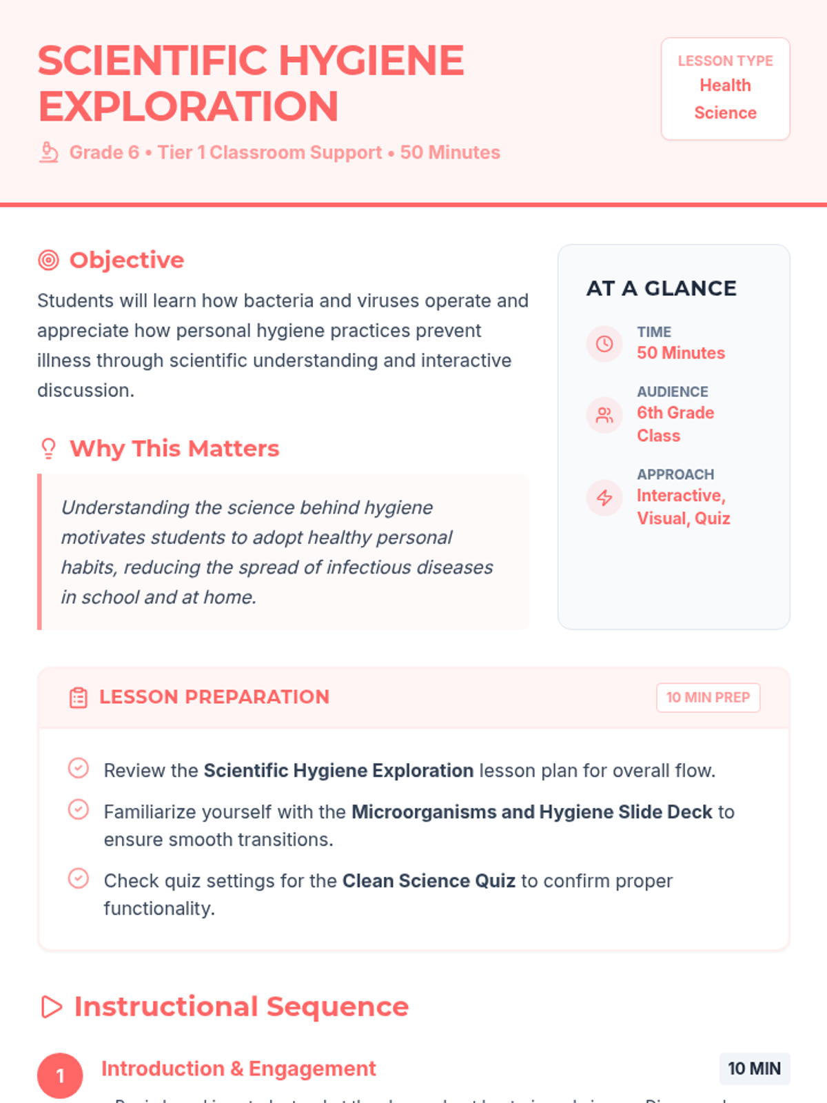 A comprehensive 50-minute lesson for 6th graders exploring the microscopic world of bacteria and viruses and the critical role of personal hygiene in maintaining health. Students will investigate how germs spread and why simple habits like handwashing are scientifically effective.