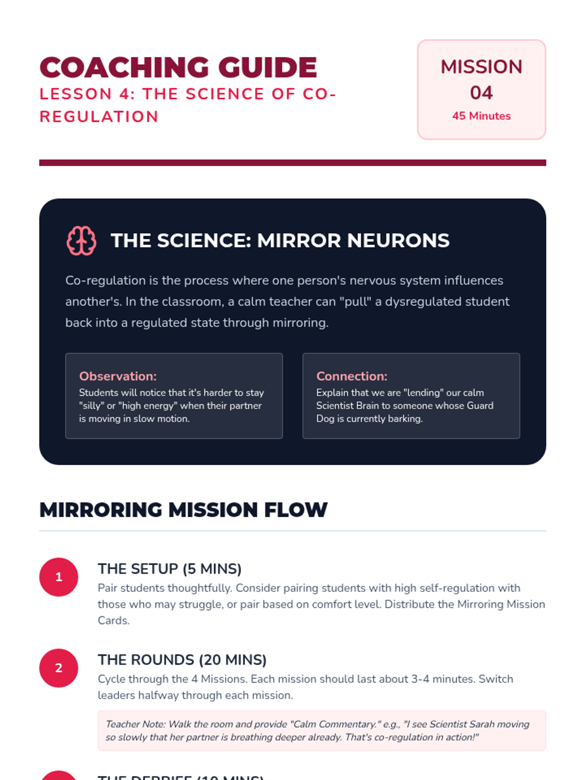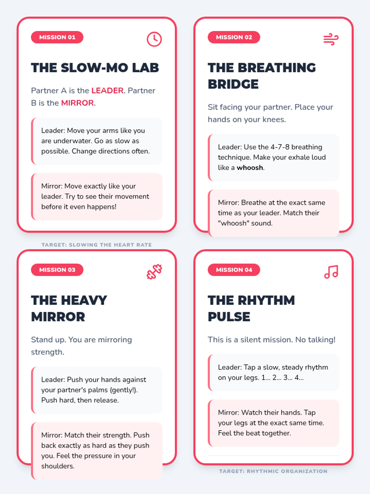 Students explore how calmness is contagious by mirroring an adult's slow breathing and movements. They learn that recovery often requires a partner to help 'lend' their calm nervous system.