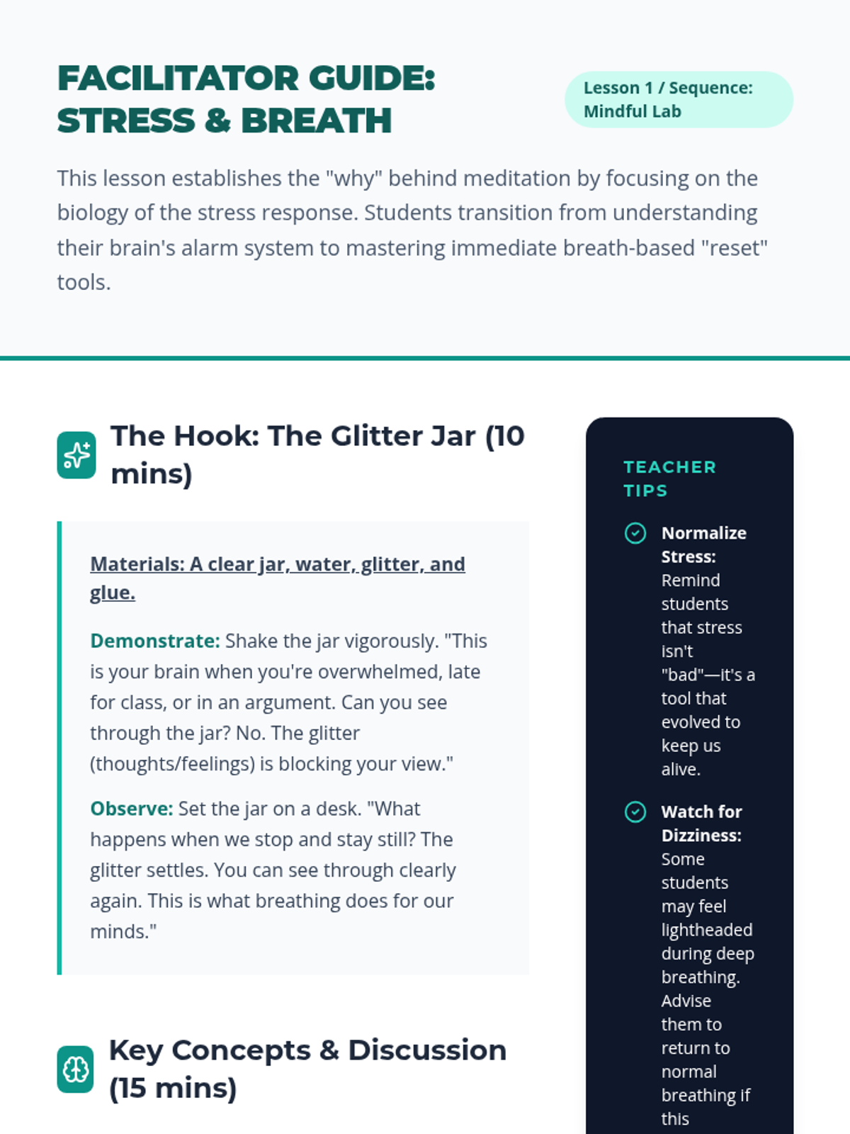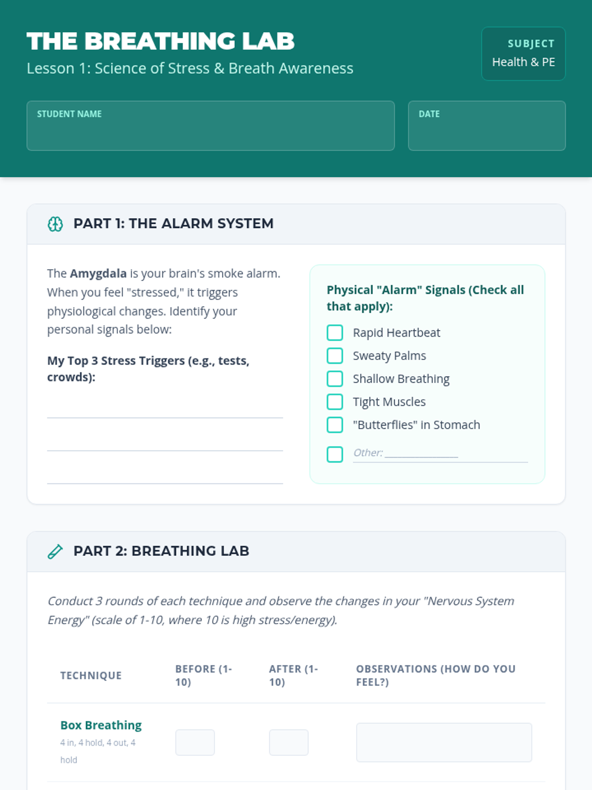 Students investigate the physiological signs of stress, the role of the amygdala, and practice controlled breathing techniques like Box Breathing to calm the nervous system.