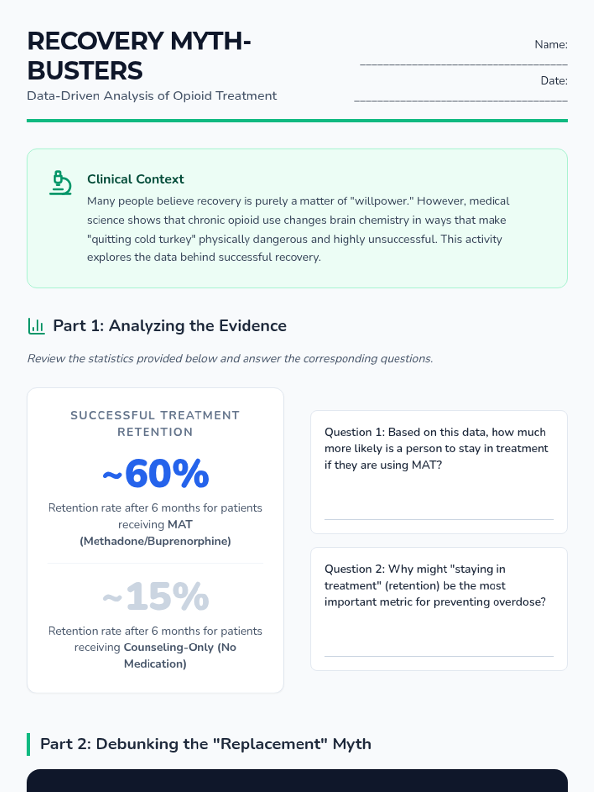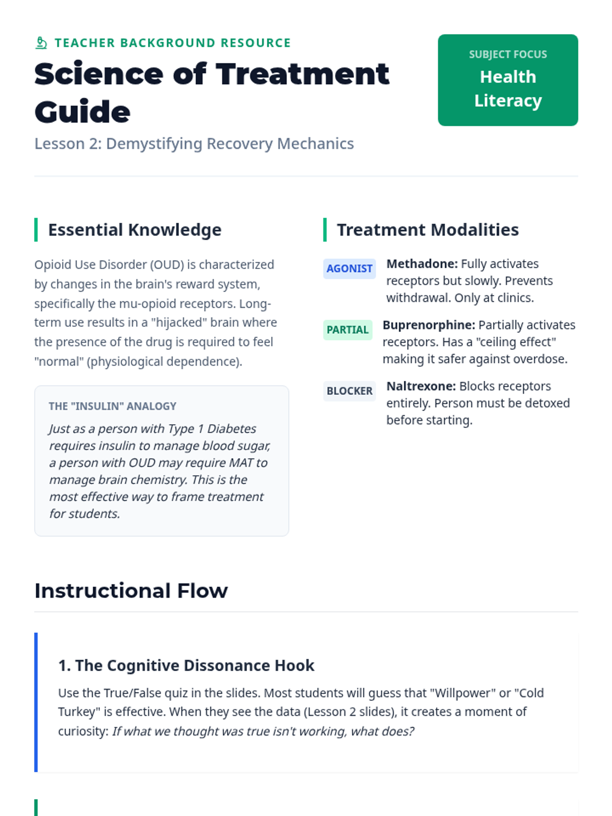This lesson demystifies recovery by explaining evidence-based treatments, specifically Medication-Assisted Treatment (MAT) like methadone and buprenorphine. Students debunk common myths and compare different levels of care.