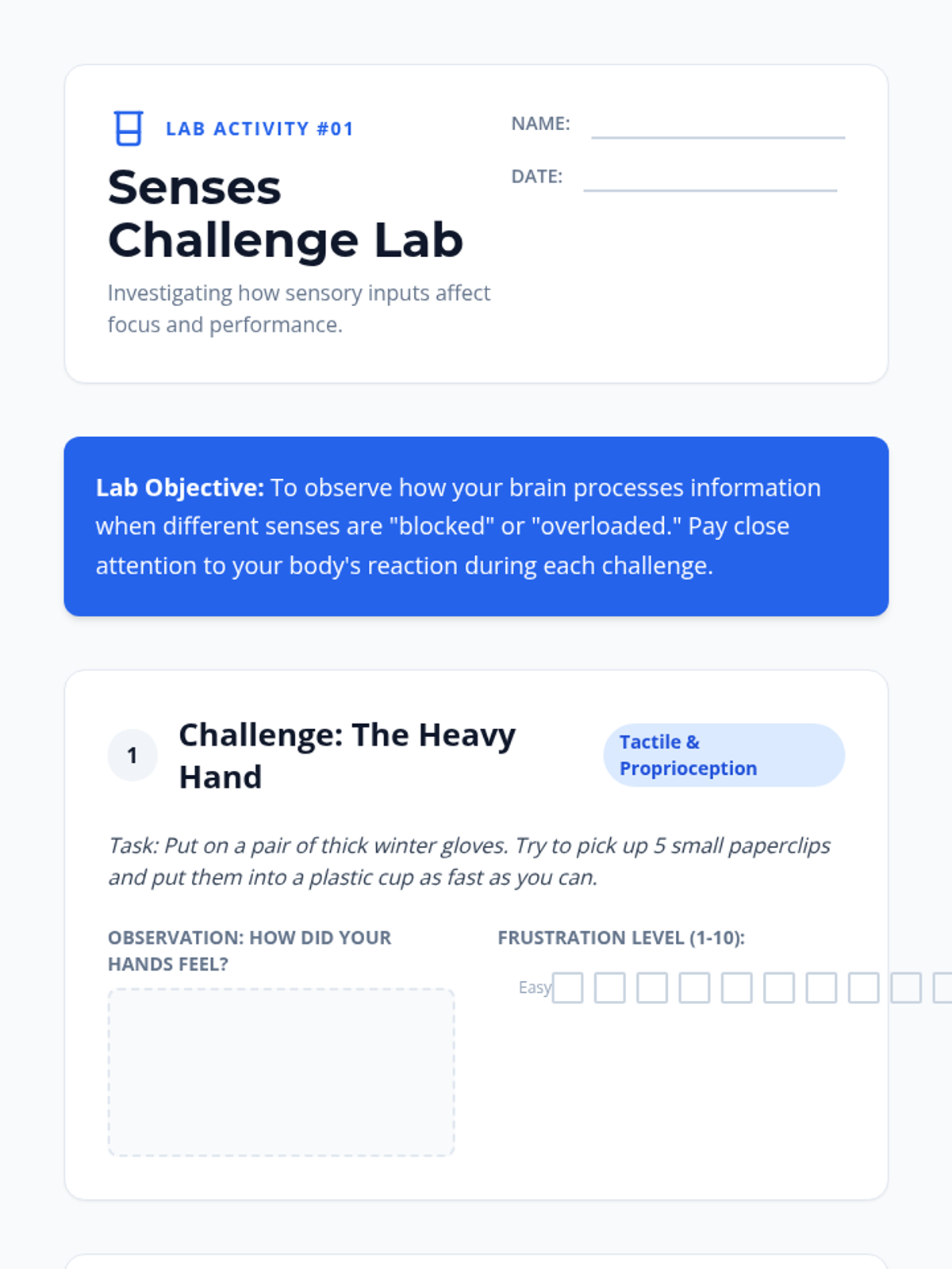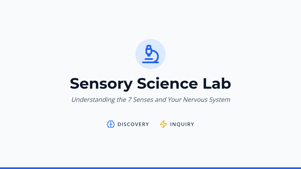 Students investigate the seven senses, including proprioception and vestibular systems, through interactive experiments to understand how different inputs affect the nervous system.