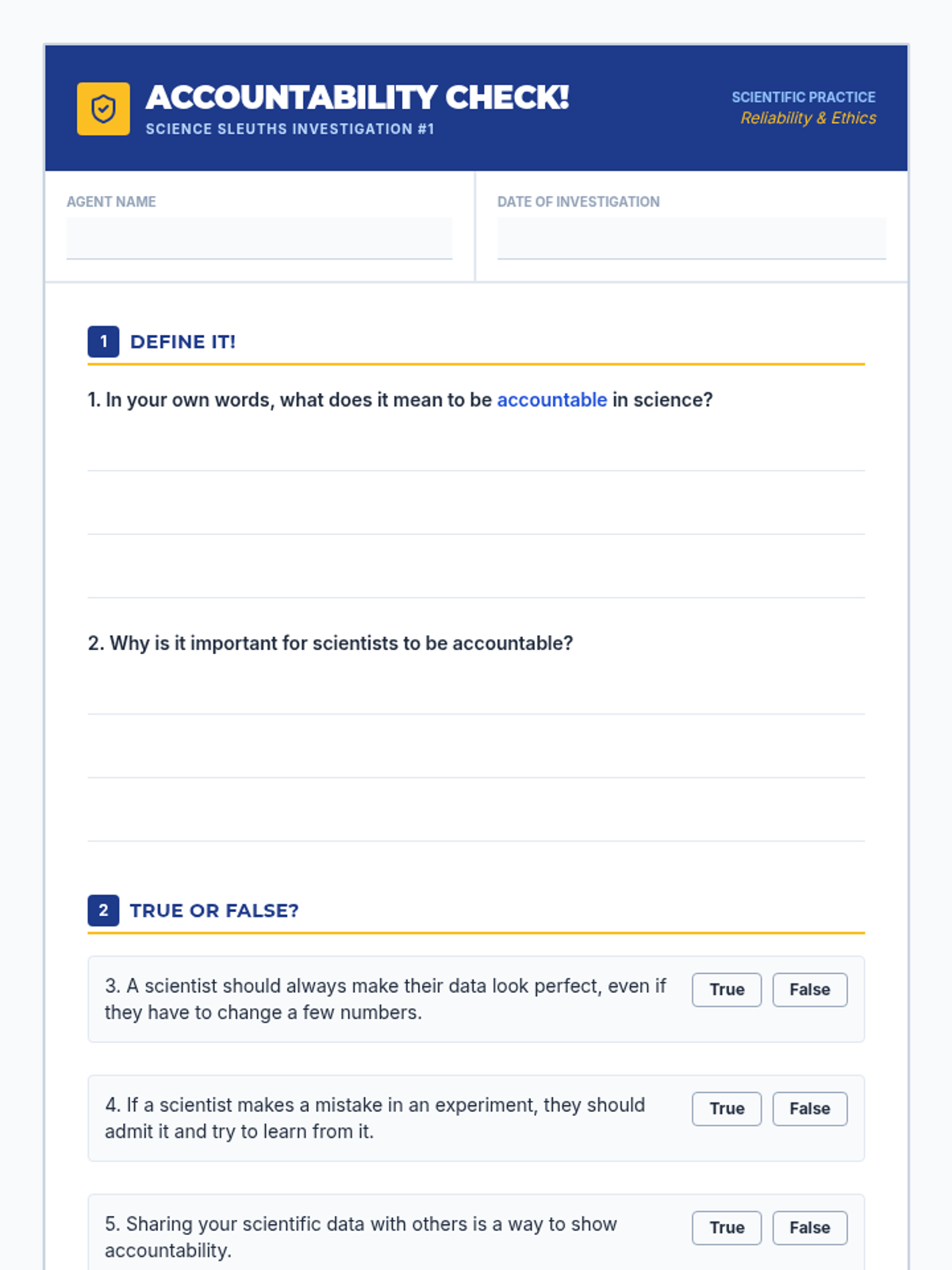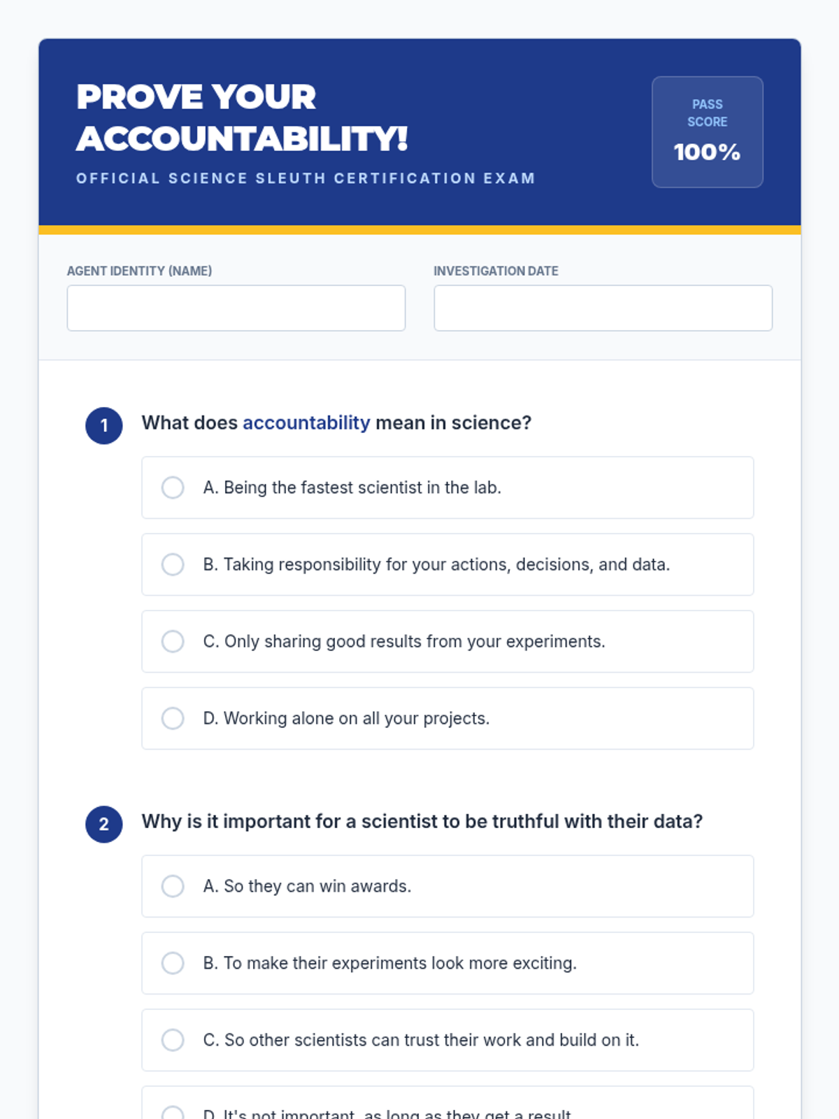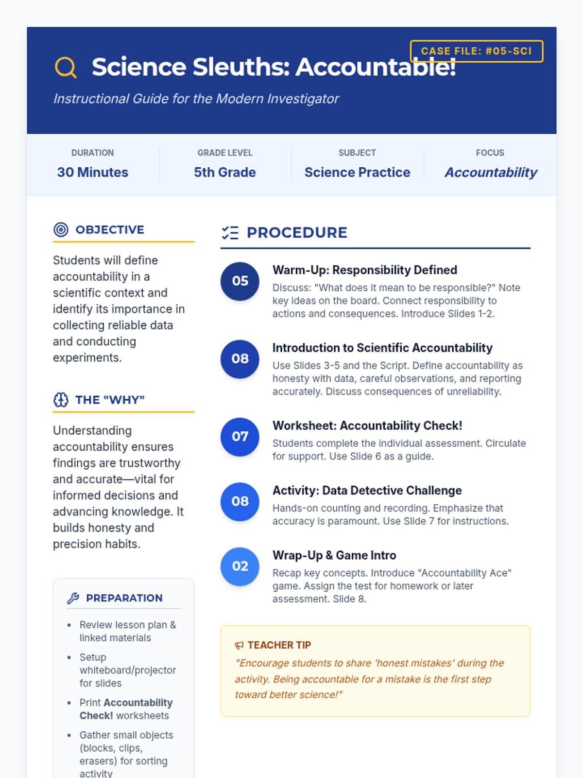A 30-minute lesson for 5th graders introducing scientific accountability through interactive discussion, a data detective challenge, and decision-making scenarios. Students learn why honesty and precision are the bedrock of reliable science.