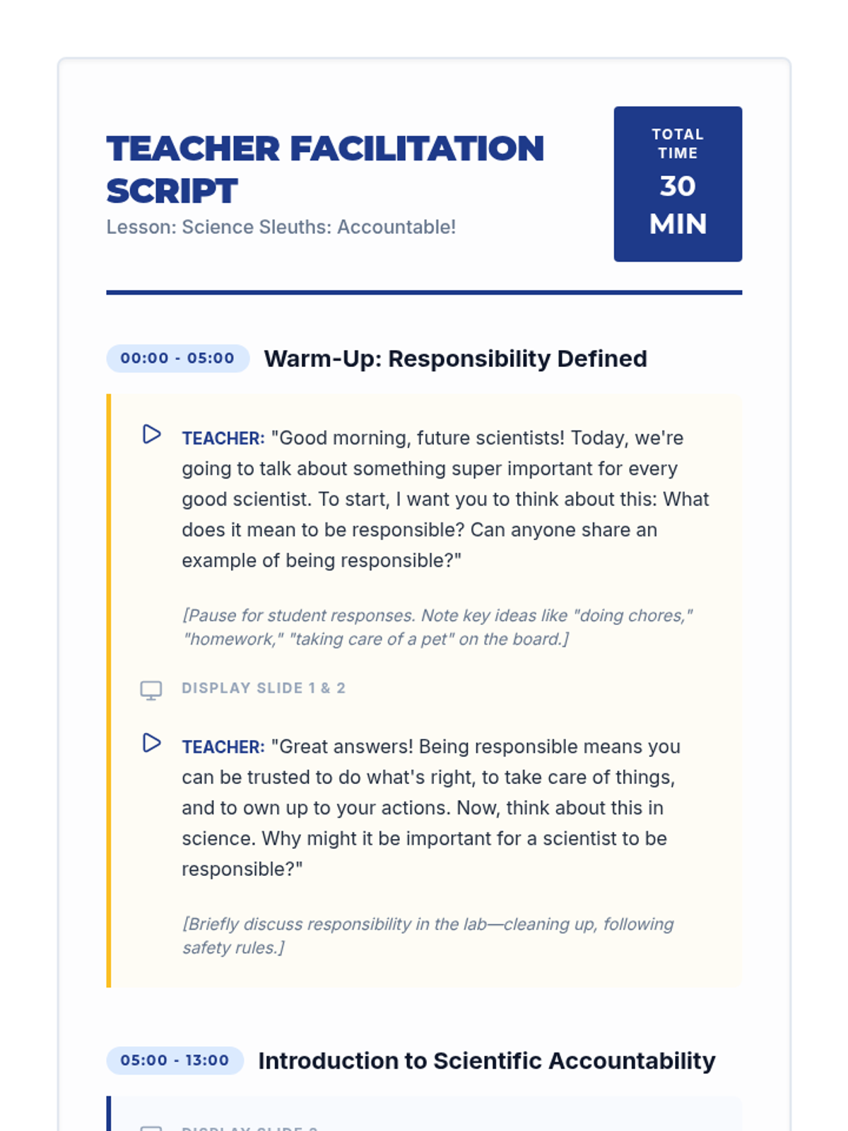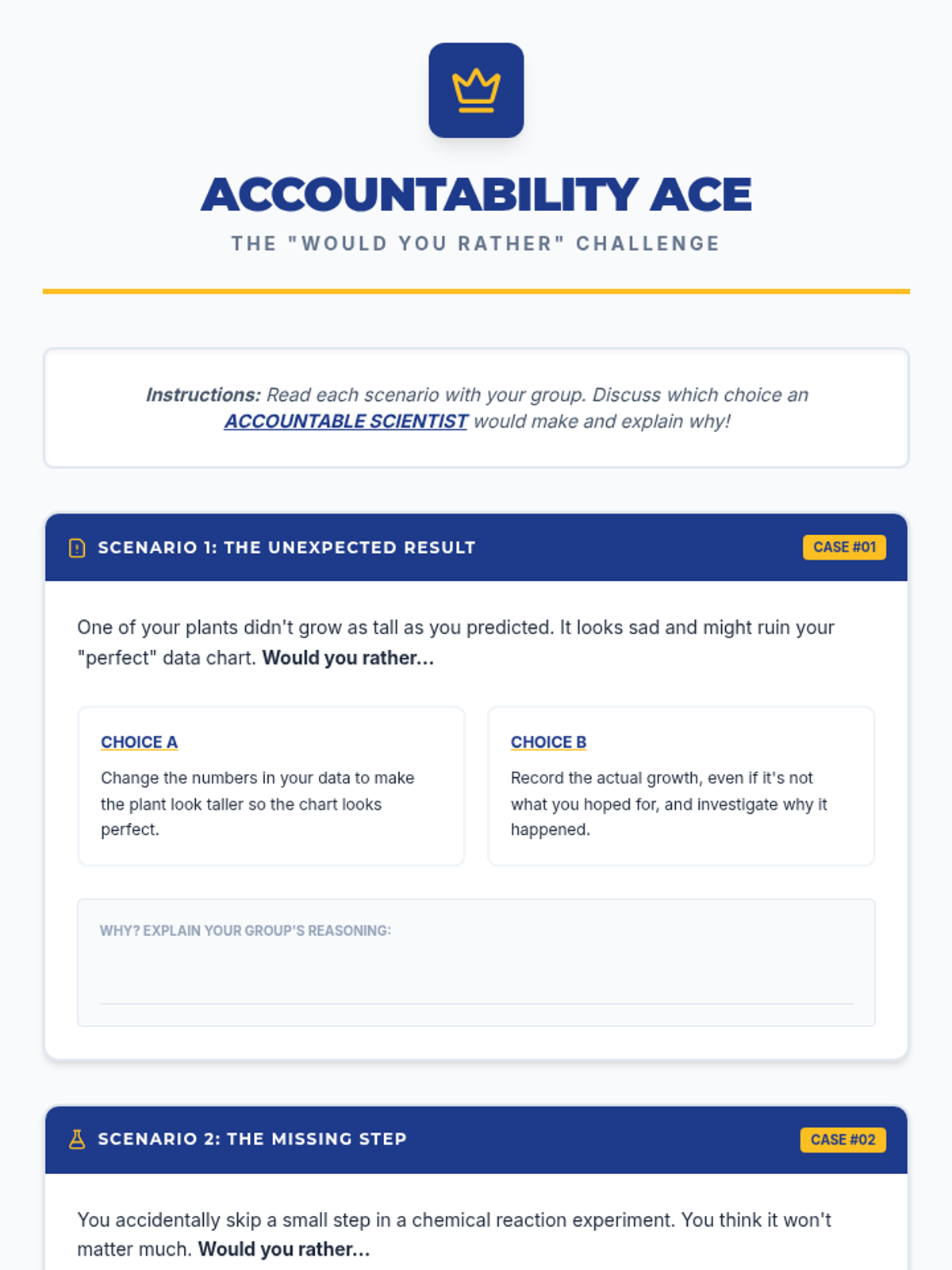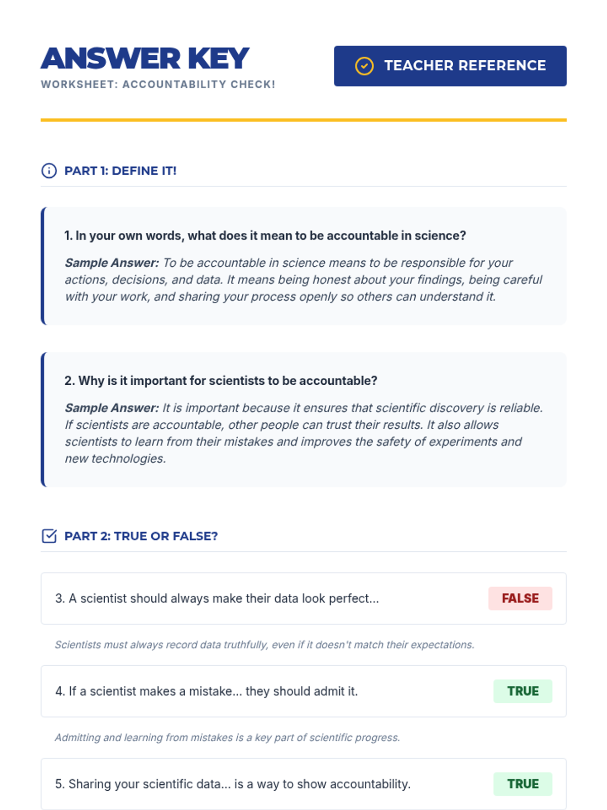A 30-minute lesson for 5th graders introducing scientific accountability through interactive discussion, a data detective challenge, and decision-making scenarios. Students learn why honesty and precision are the bedrock of reliable science.