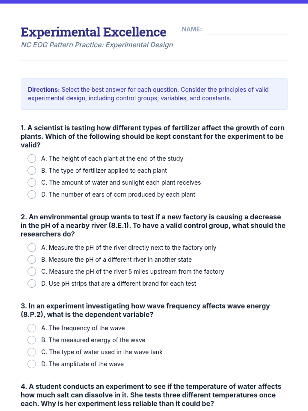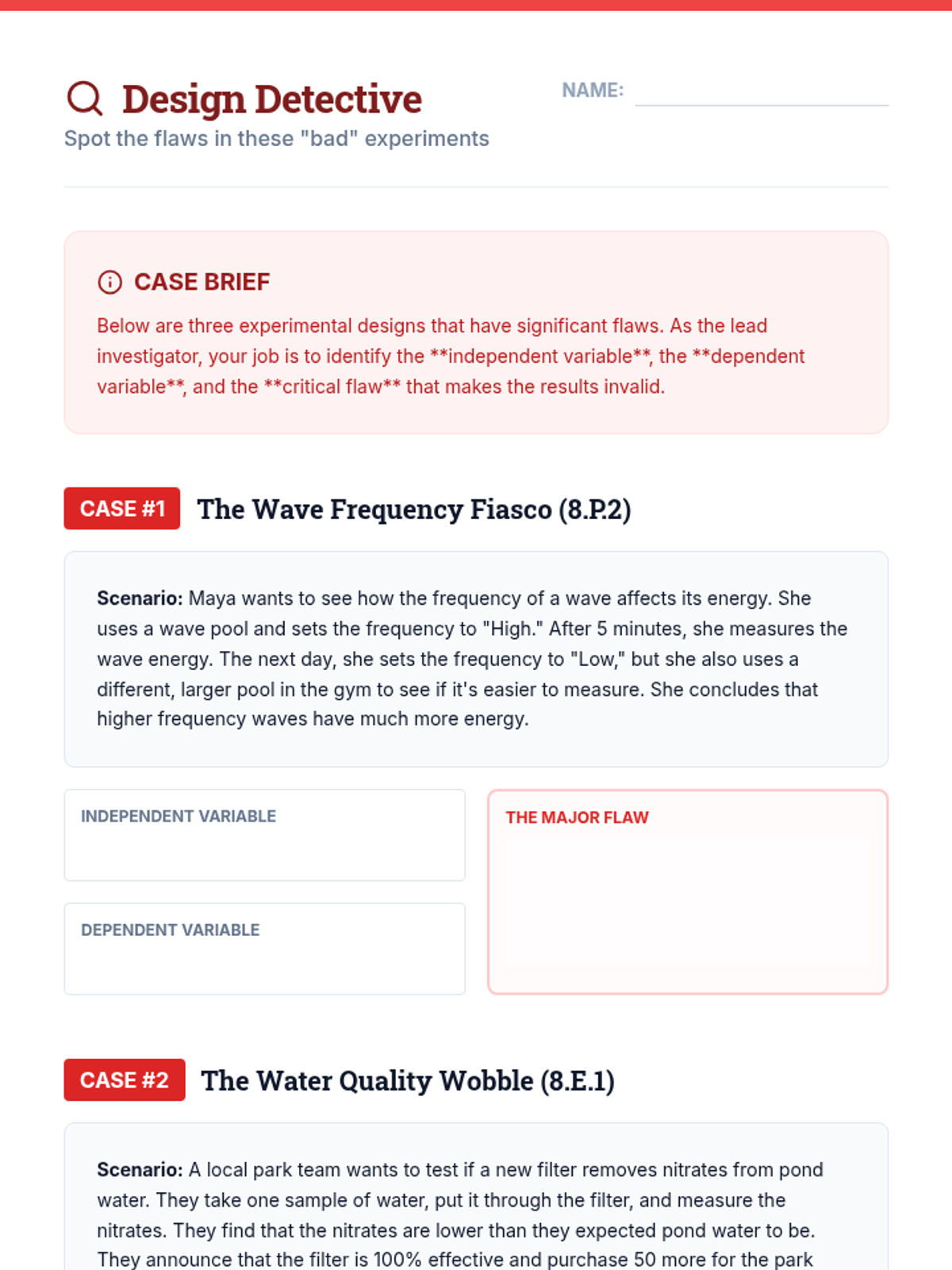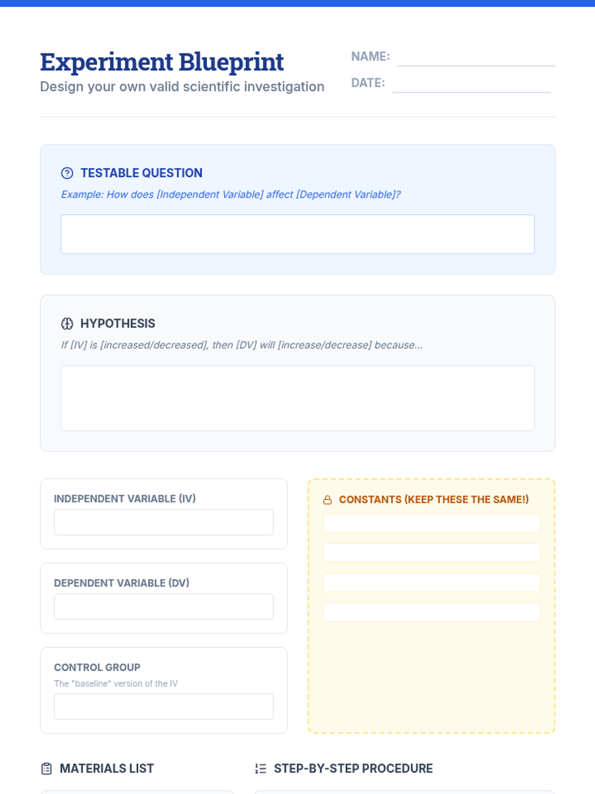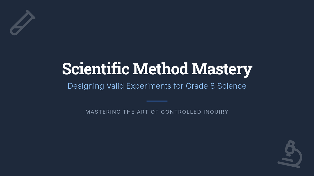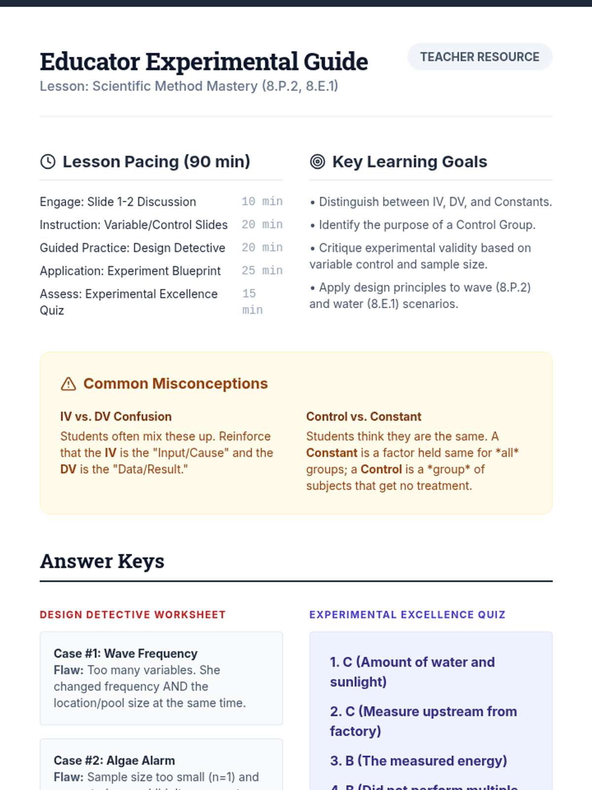 A comprehensive Grade 8 science lesson focused on the principles of experimental design, focusing on identifying variables, establishing controls, and critiquing experimental validity in the context of physical and earth science standards.
