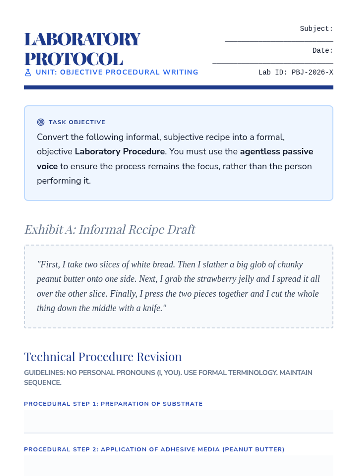 Students practice the agentless passive specifically for scientific and technical reporting. They learn to prioritize the process over the person performing the action to maintain academic objectivity.