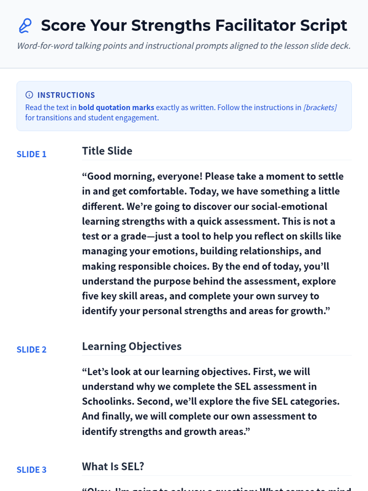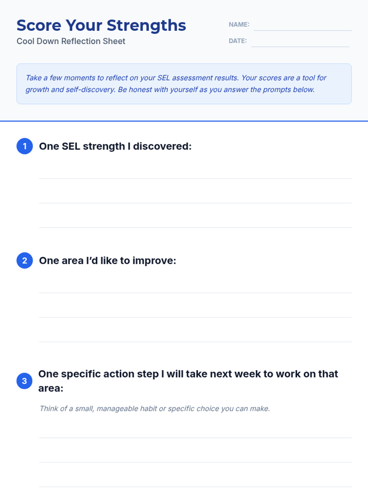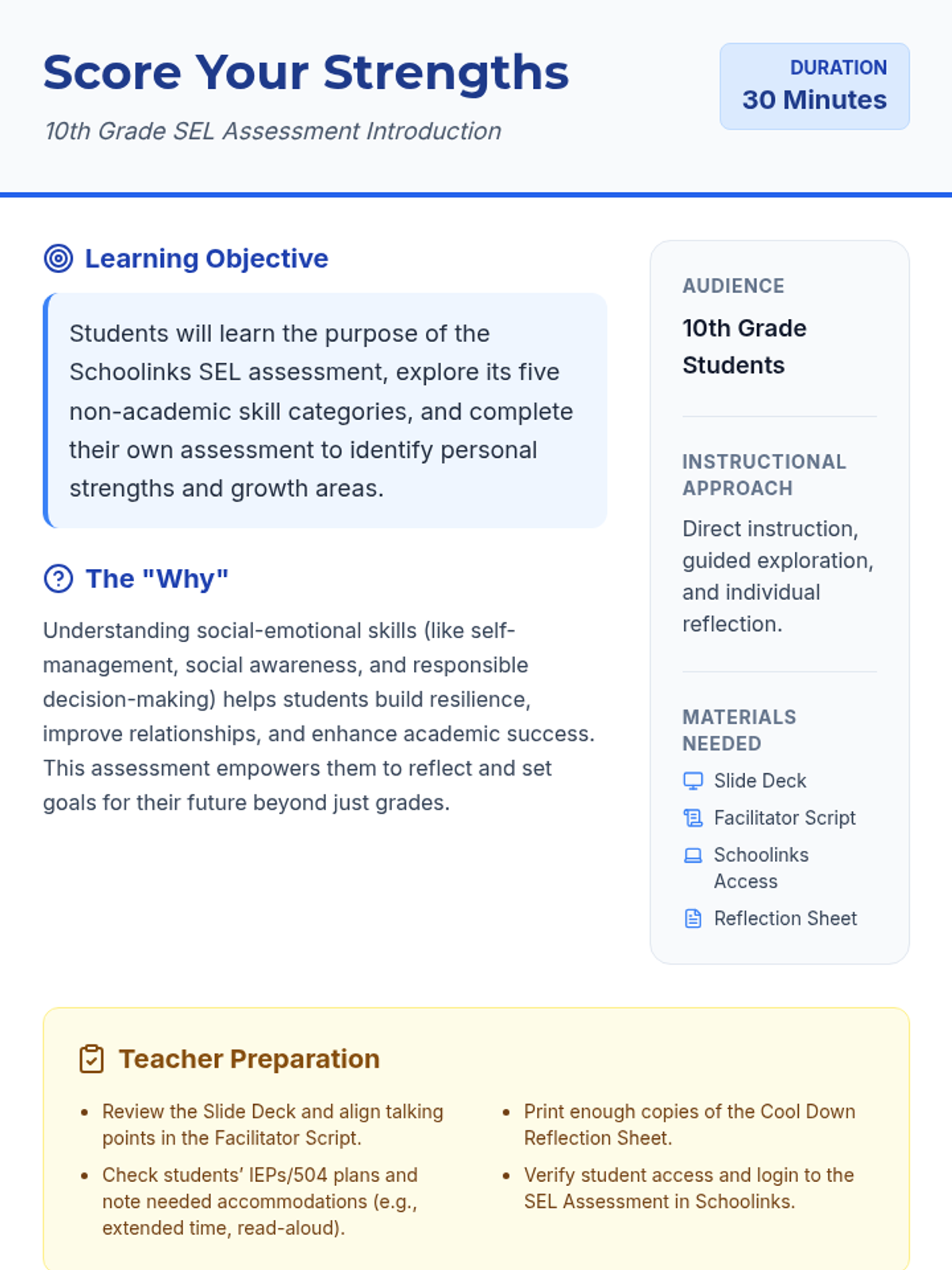 In this 30-minute lesson, tenth grade students will understand the purpose and benefits of completing a Social Emotional Learning (SEL) assessment in Schoolinks, explore the five SEL categories, and complete their own assessment to identify strengths and growth areas.