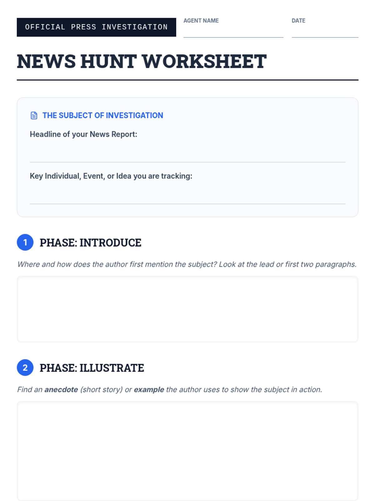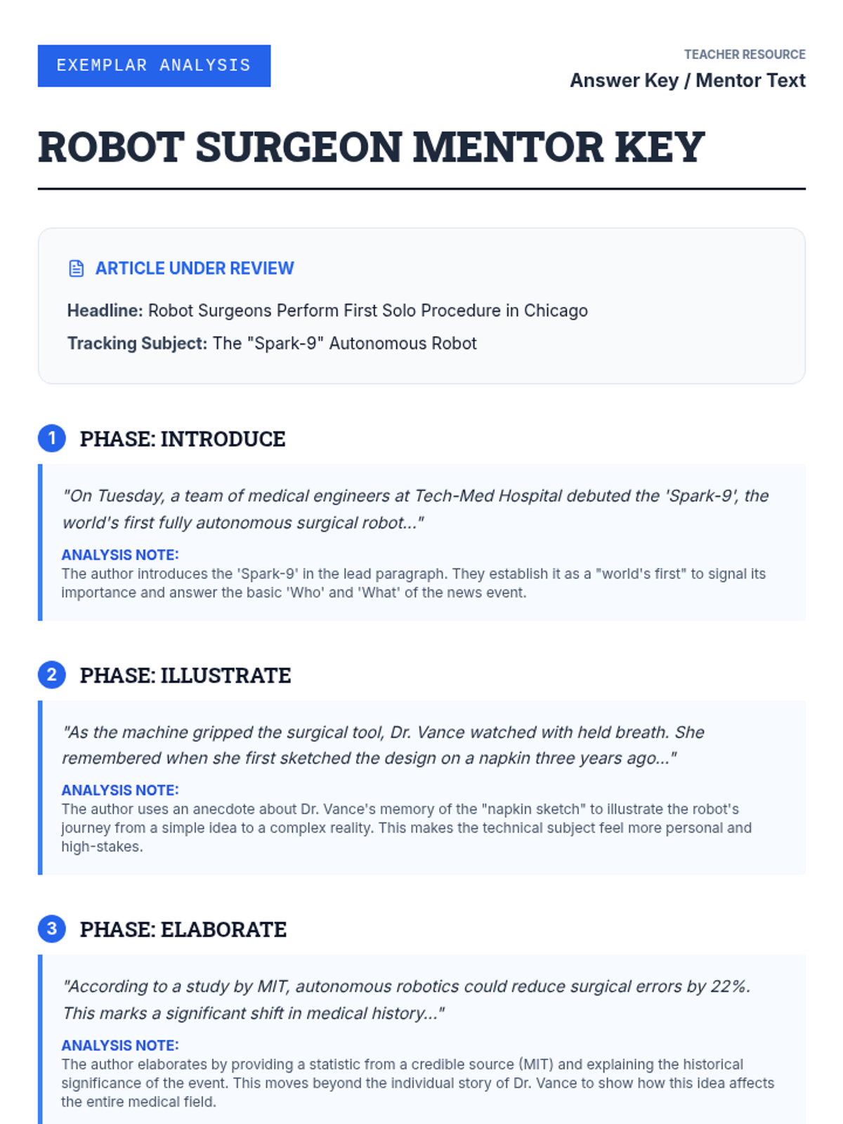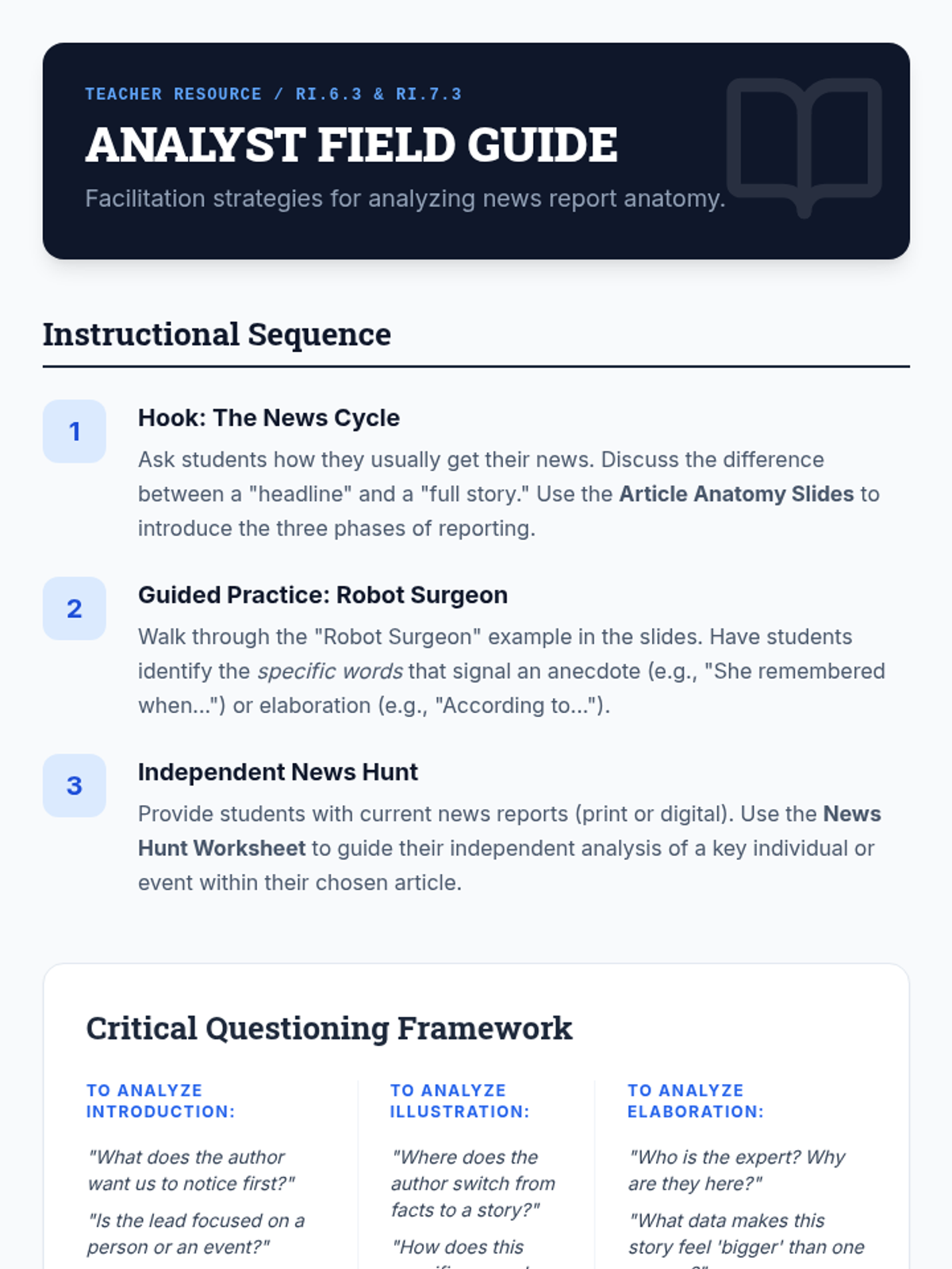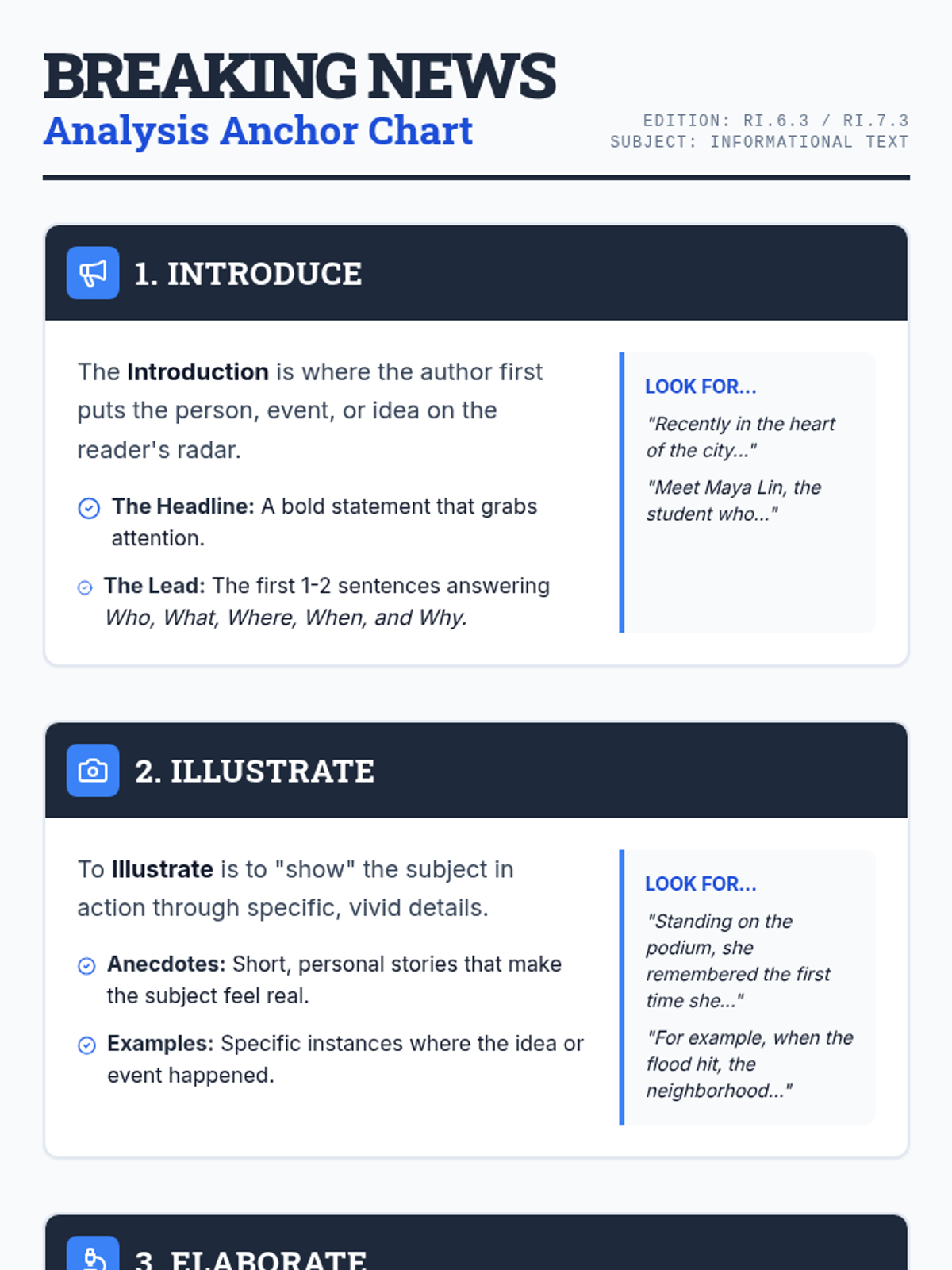 This lesson teaches students to analyze how news reports introduce, illustrate, and elaborate on key individuals, events, or ideas using specific examples and anecdotes.
