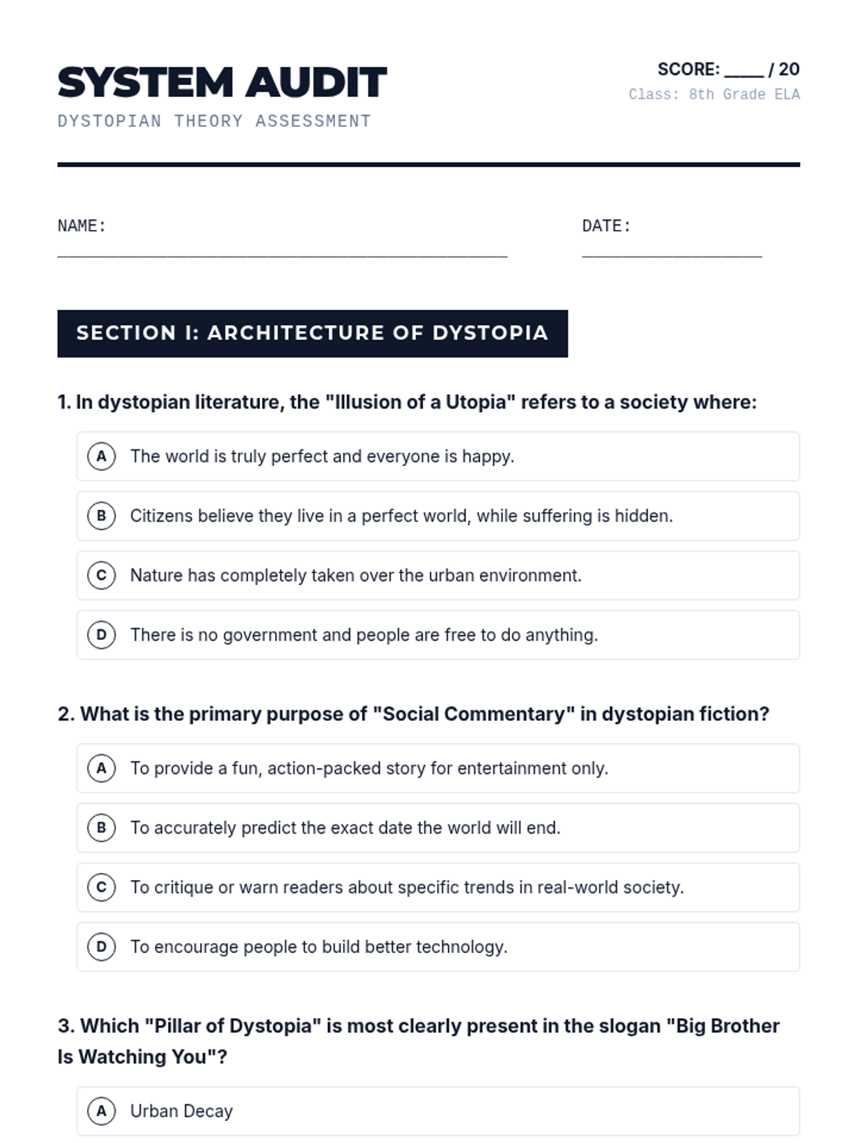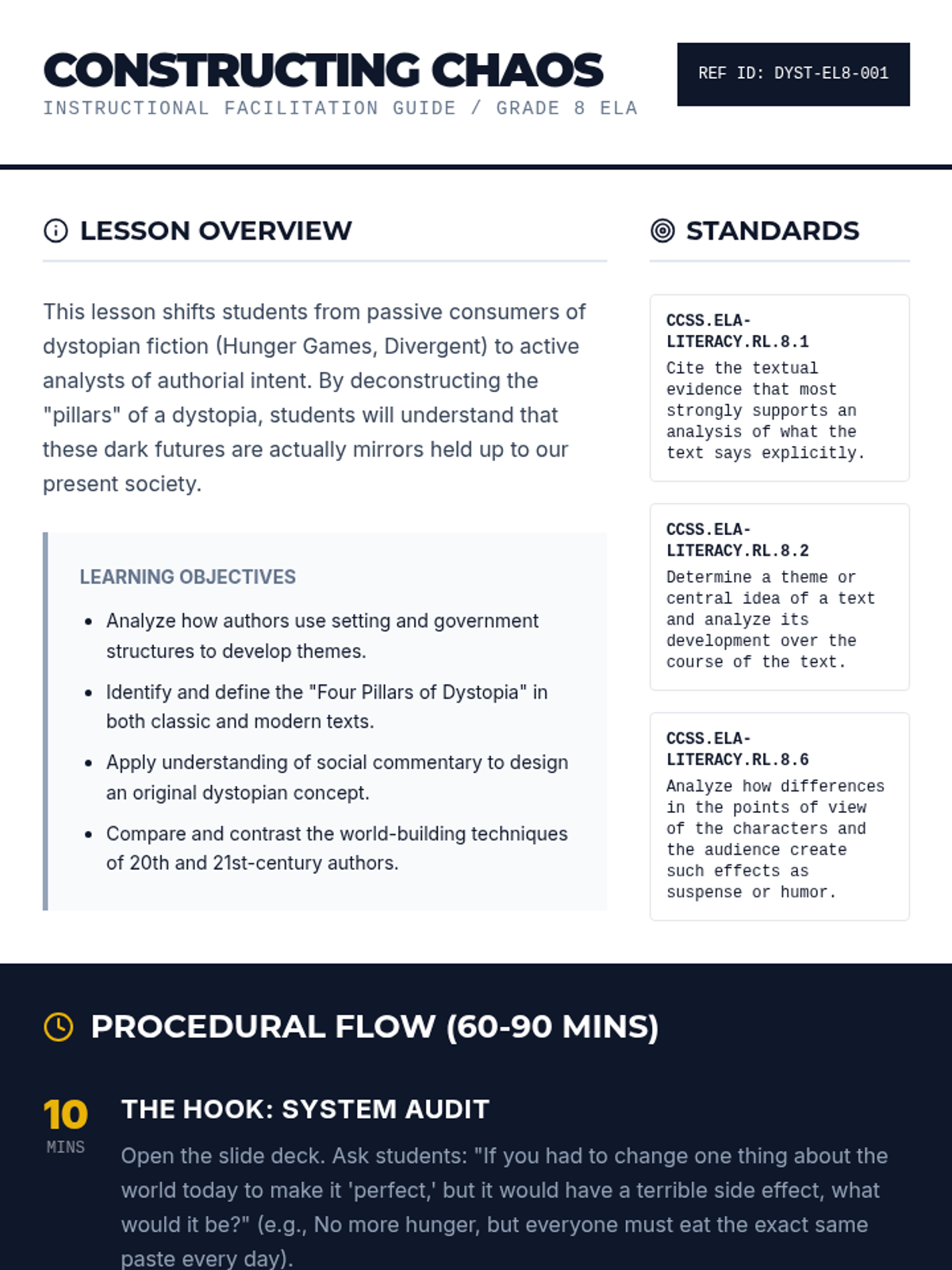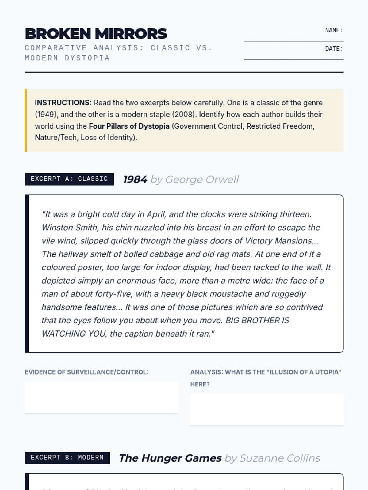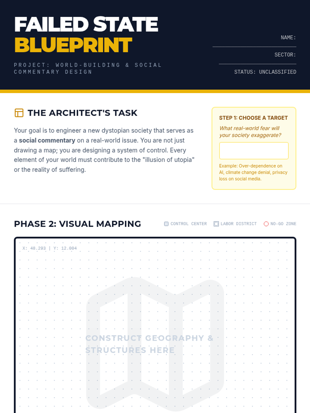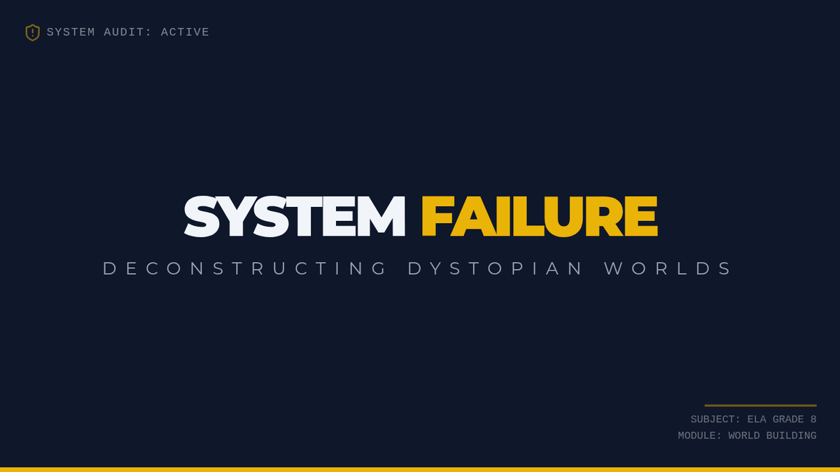 This lesson explores the structural elements of dystopian fiction, focusing on how authors use world-building to critique contemporary society. Students analyze classic and modern excerpts before designing their own symbolic 'failed society' map.