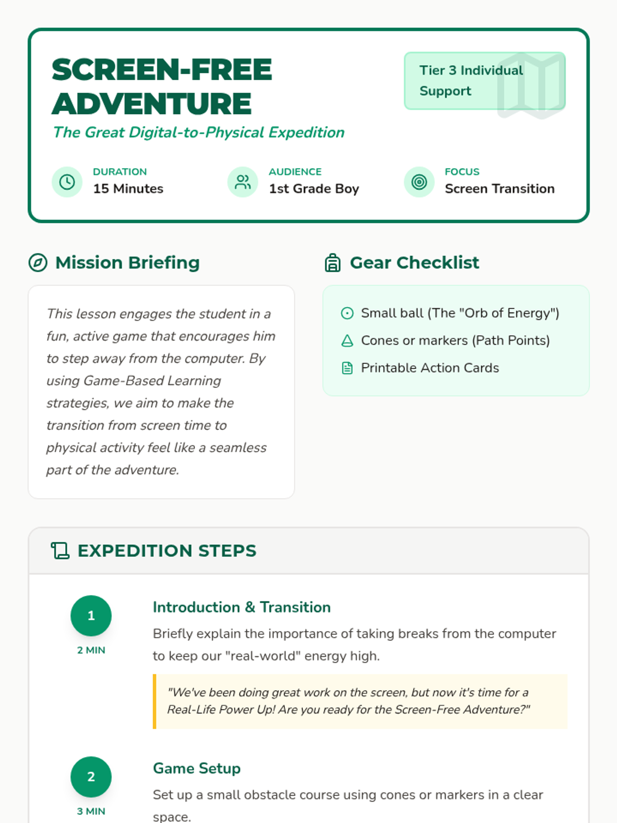 This lesson engages a 1st-grade boy in a fun, active game that encourages him to step away from the computer. By using Game-Based Learning and Active Learning strategies, the lesson aims to make the transition from screen time to physical activity enjoyable and seamless.