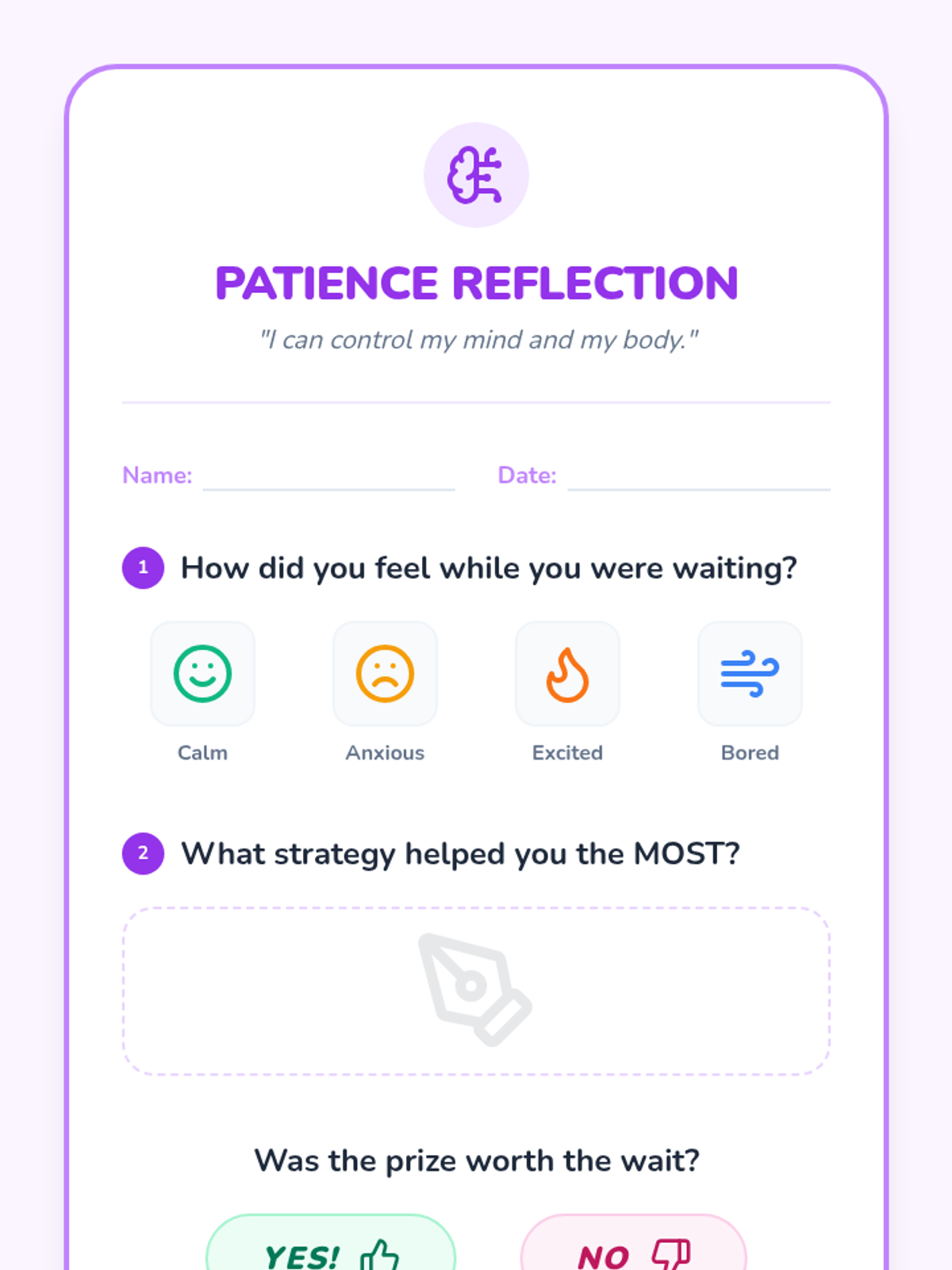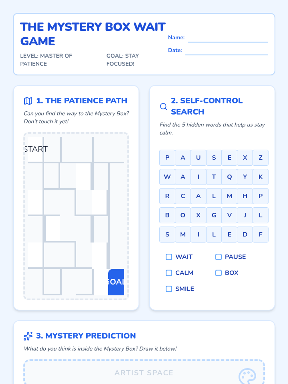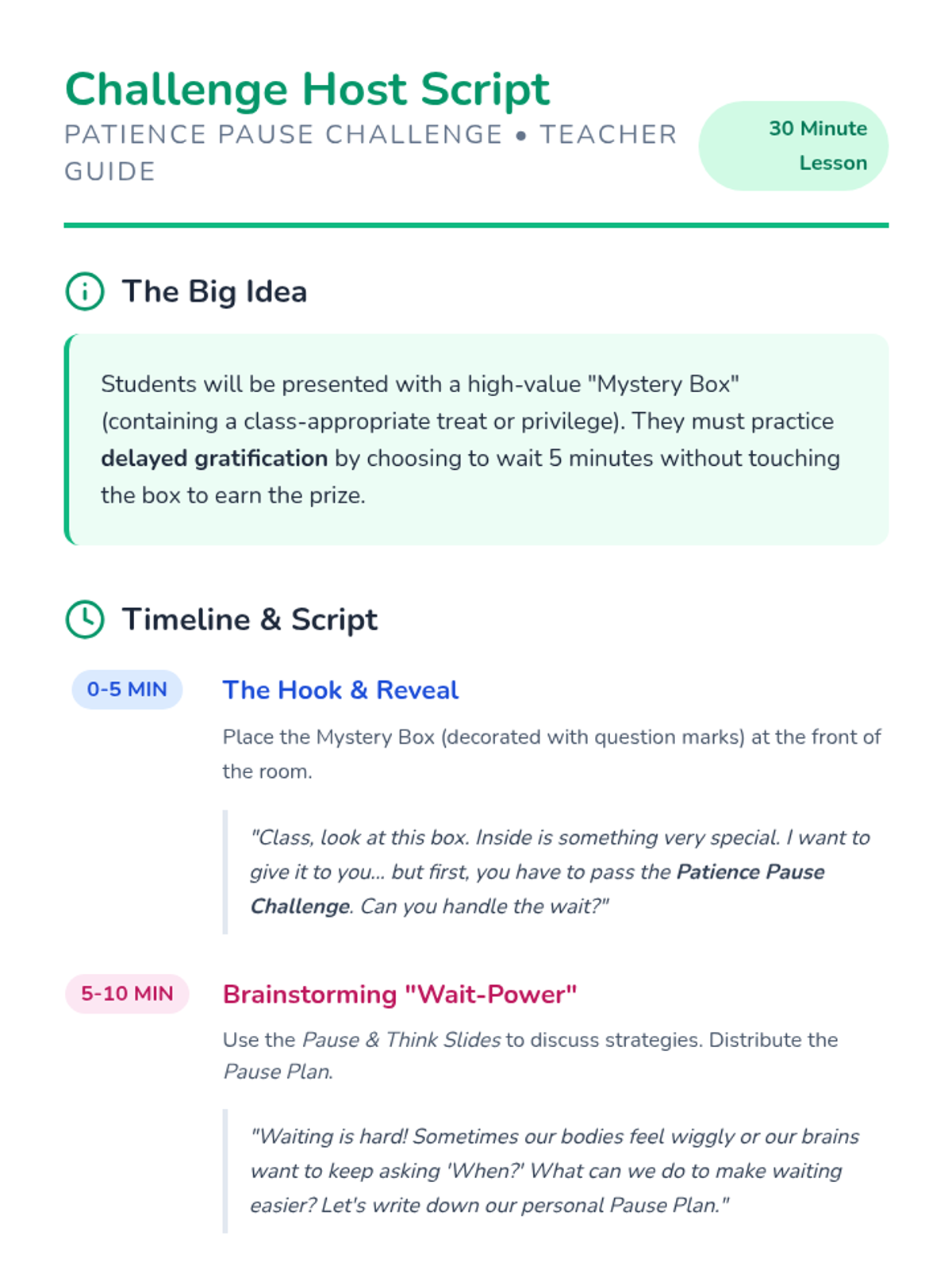 A 30-minute social-emotional learning lesson where students practice the 'superpower' of waiting. Students will develop strategies for delayed gratification, test their self-control with a mystery box challenge, and reflect on their emotional journey.