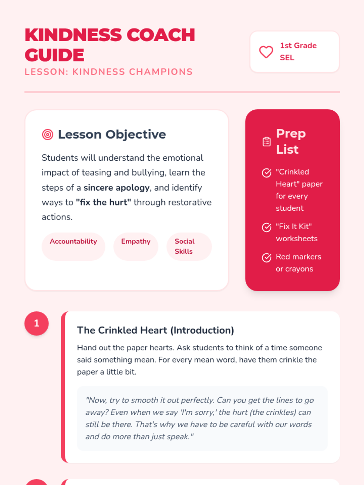 This lesson teaches first graders how their words and actions affect others, focusing on empathy, the impact of teasing, and the power of a sincere apology to 'fix the hurt'. Students engage in hands-on activities to visualize emotional impact and practice accountability.