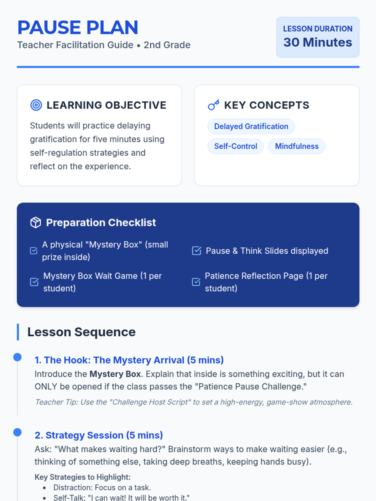 A 30-minute interactive lesson where 2nd-grade students practice delayed gratification through a 'Mystery Box' challenge and learn self-control strategies.