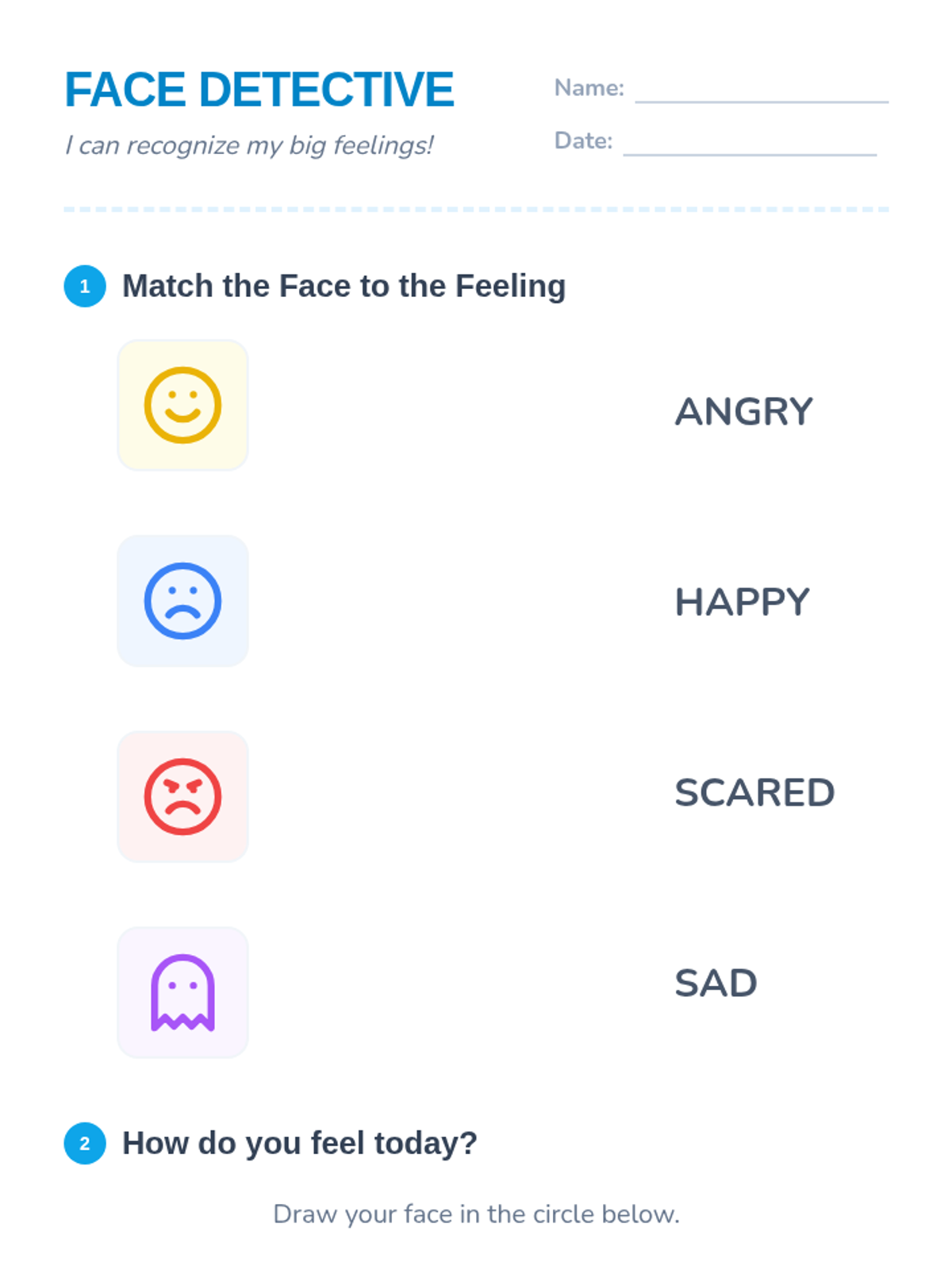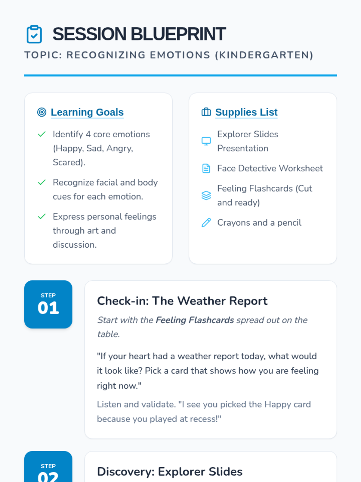A social skills lesson for kindergarteners focused on identifying and understanding basic emotions through visual cues and interactive play. This lesson helps students build emotional literacy and empathy in an individual counseling setting.