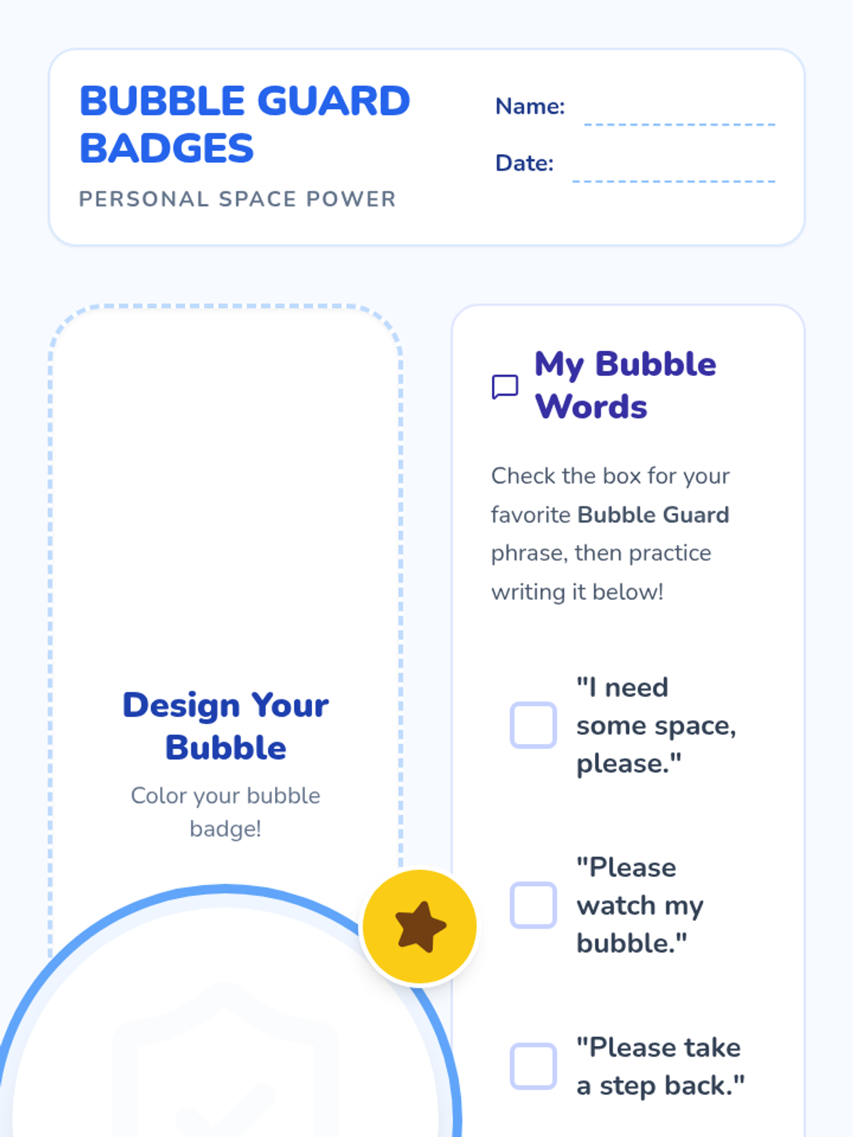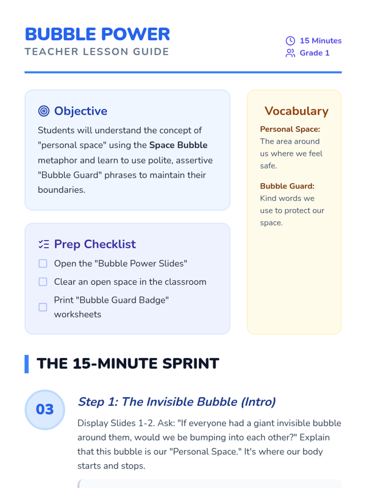 A quick, engaging 15-minute lesson for first graders about understanding and respecting personal space using the 'Space Bubble' metaphor. students will learn to identify their own boundaries and use polite words to protect them.