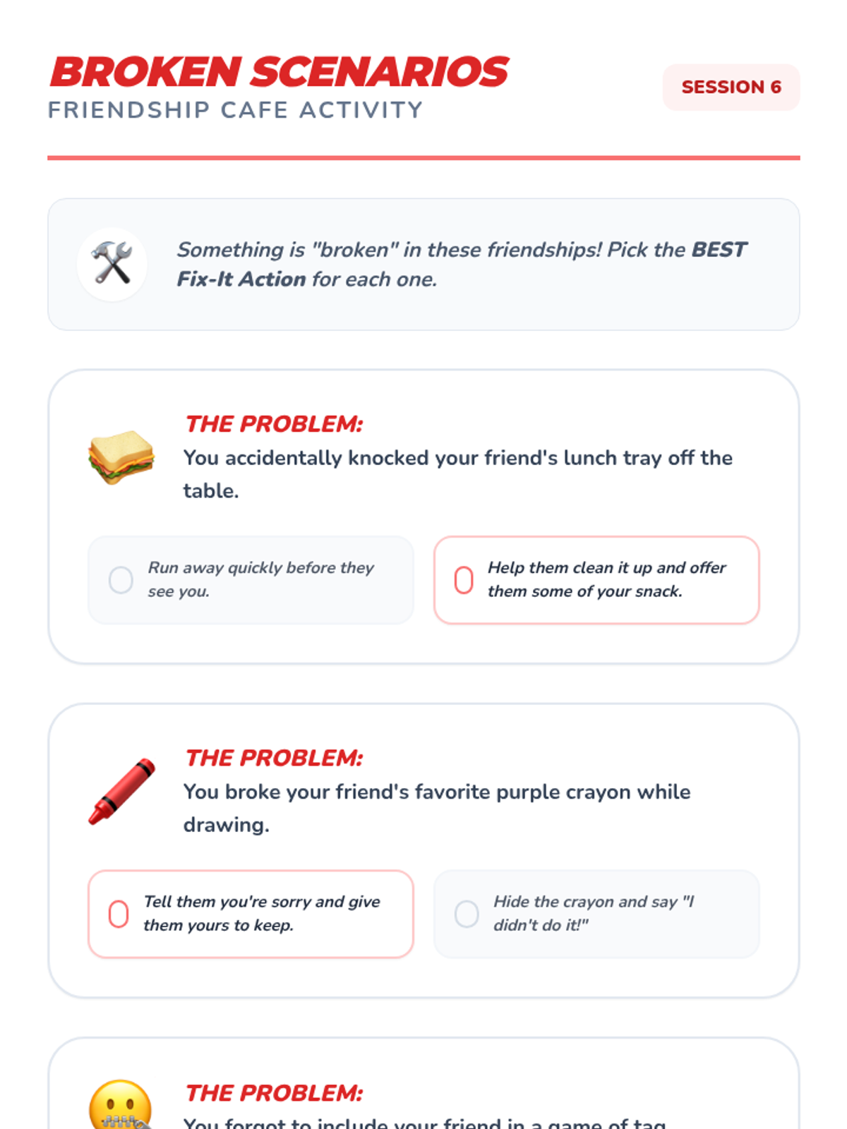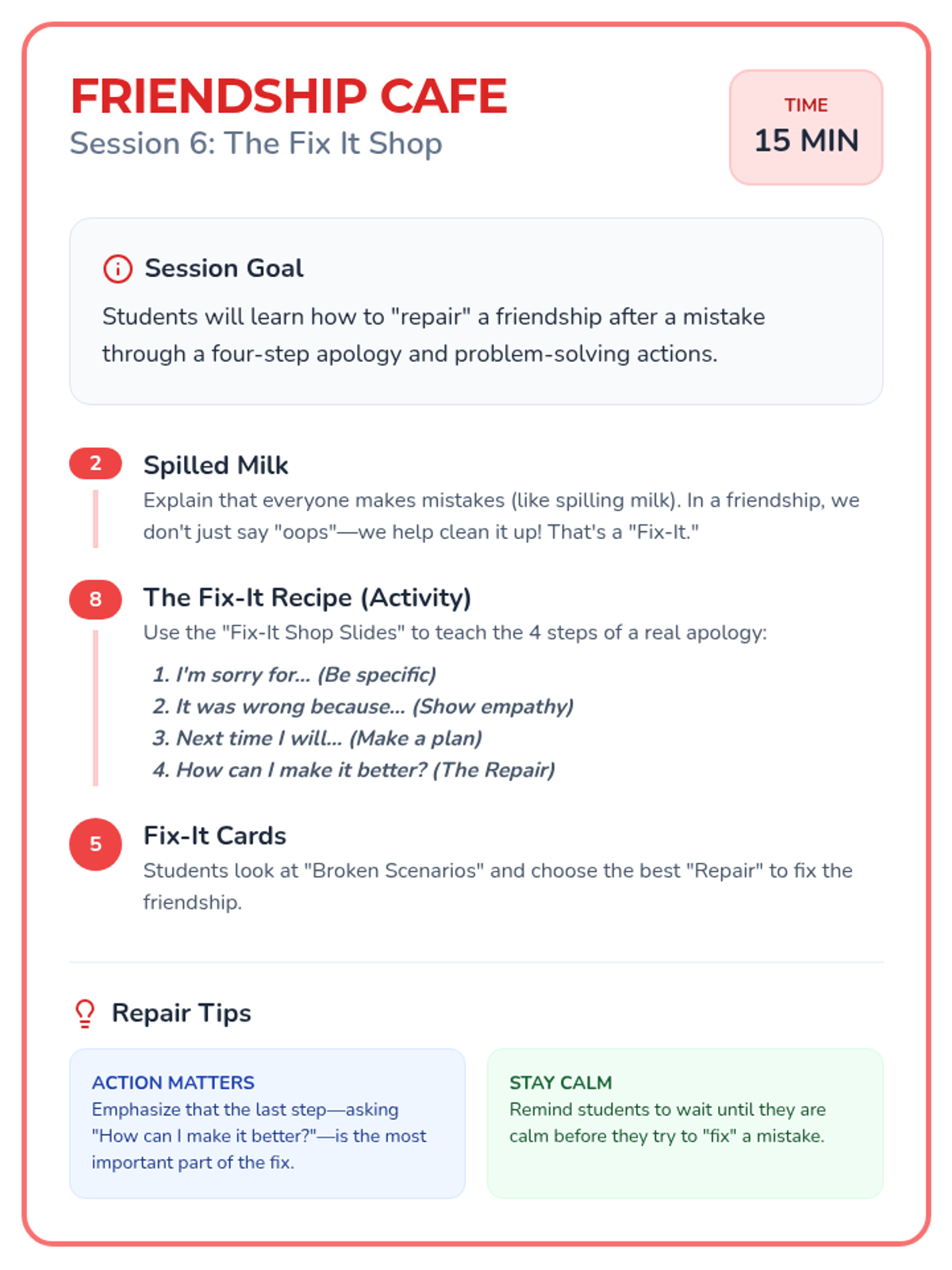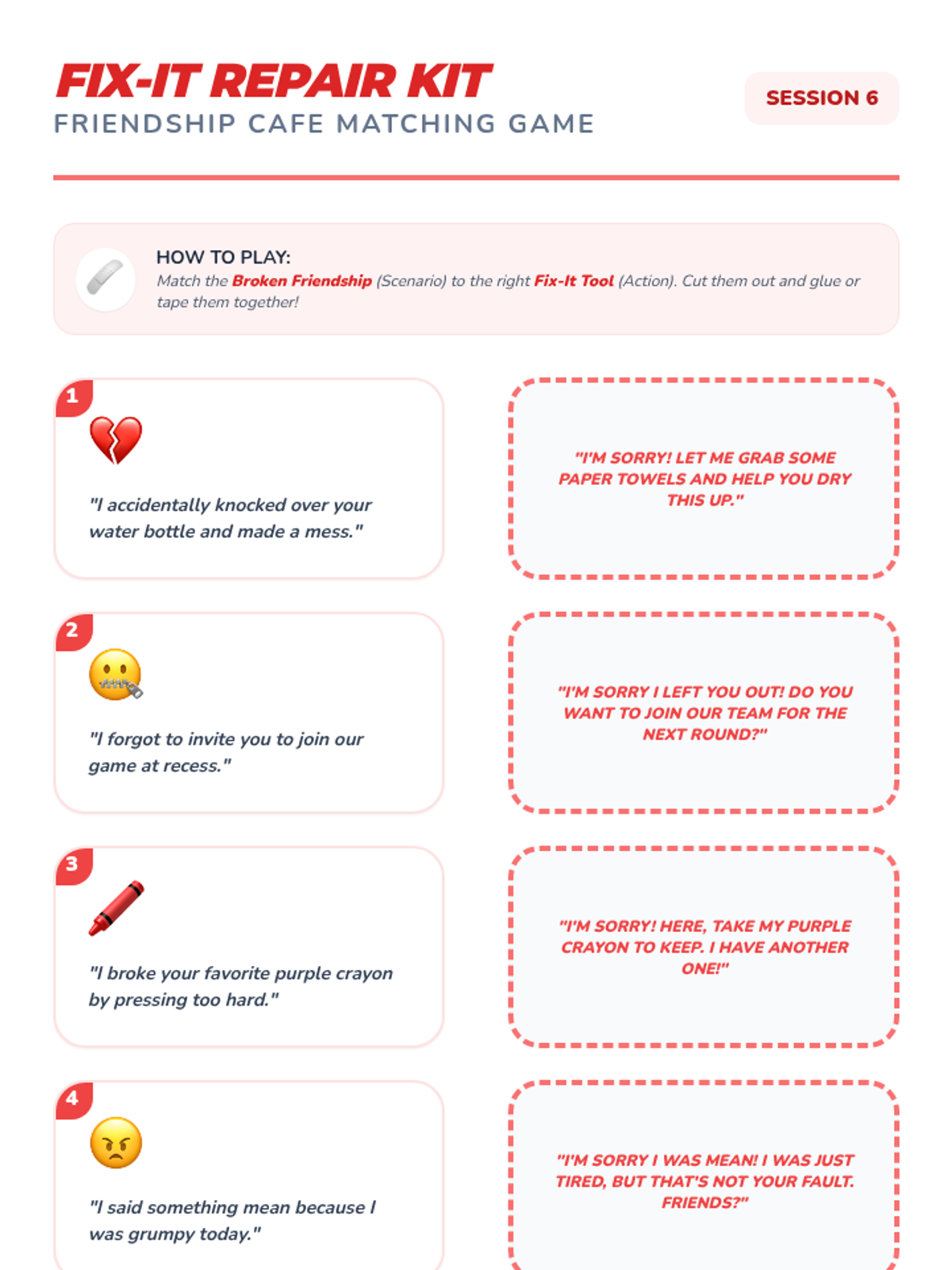 Learning how to "fix" friendship mistakes through sincere apologies and problem-solving scenarios.