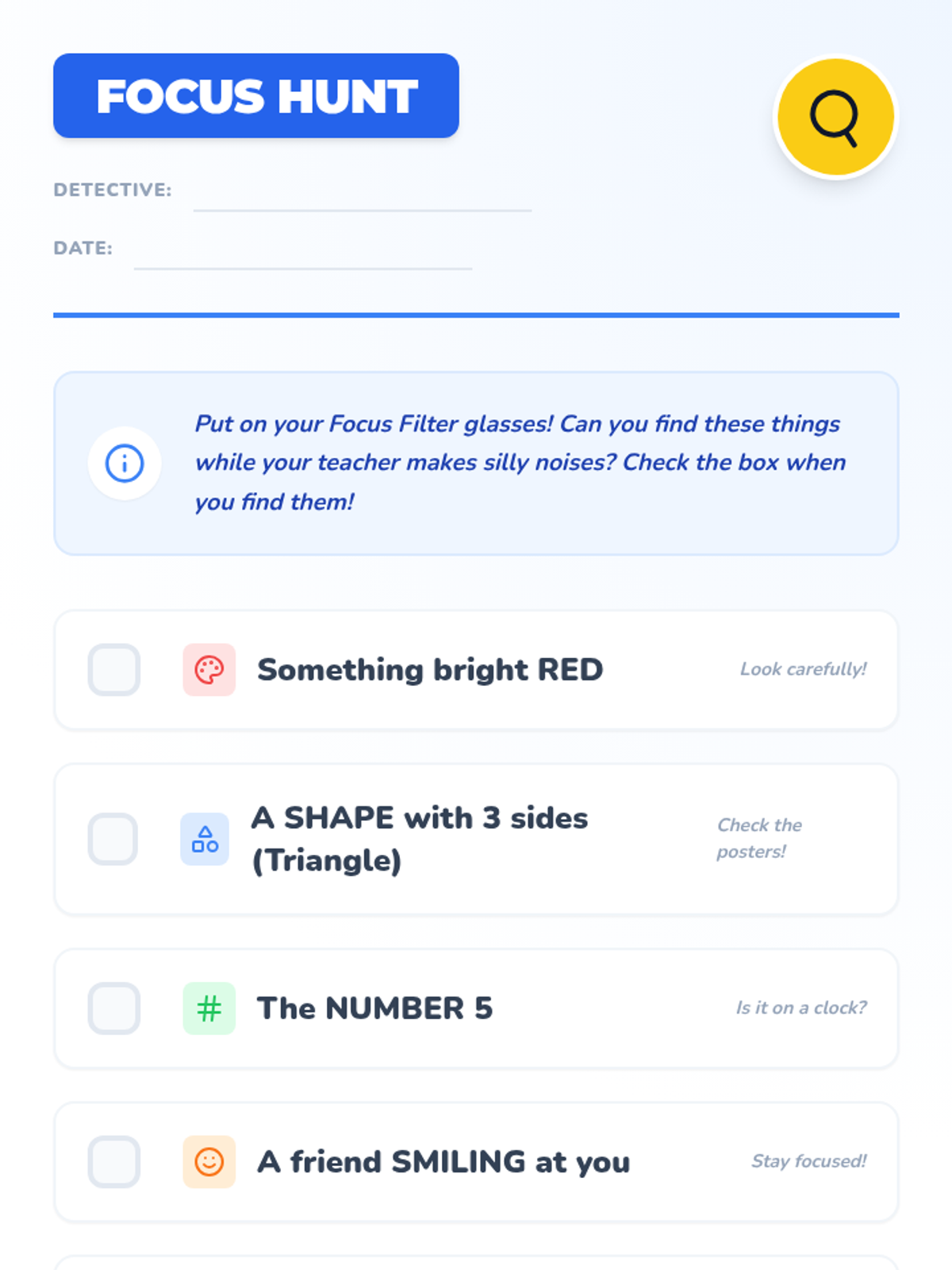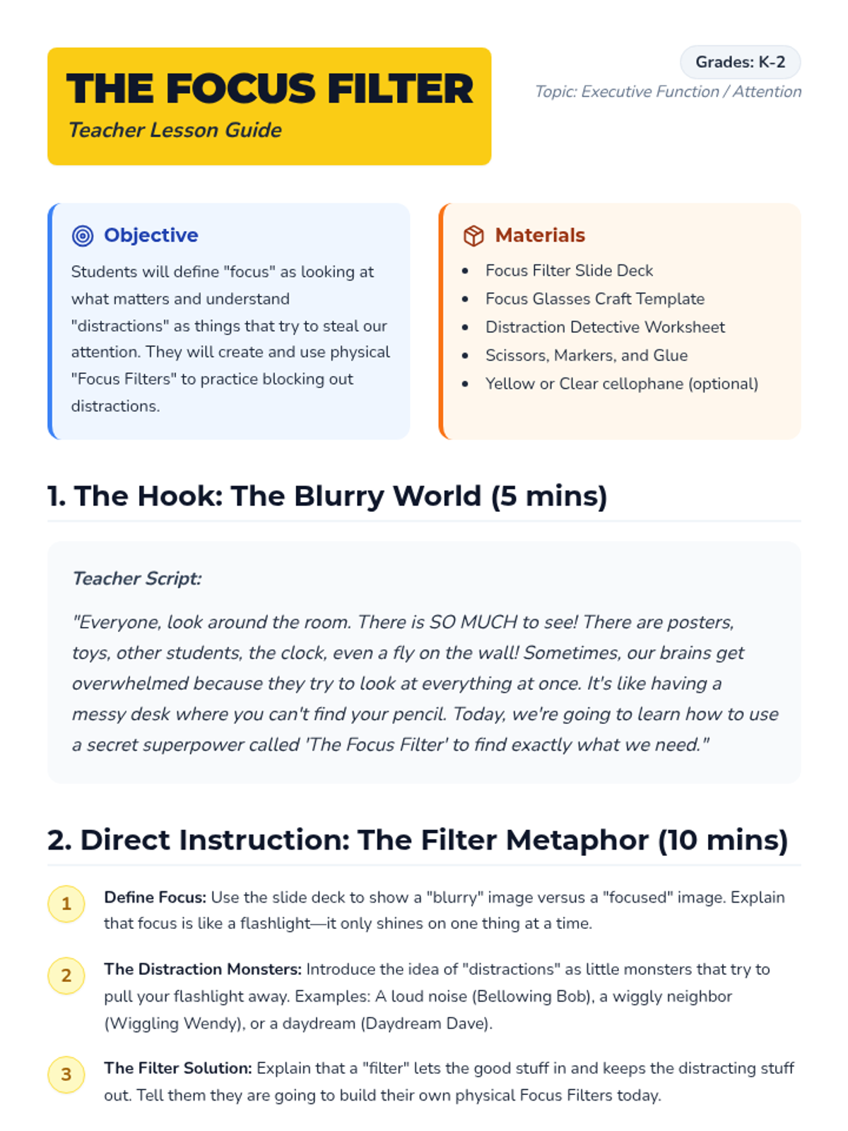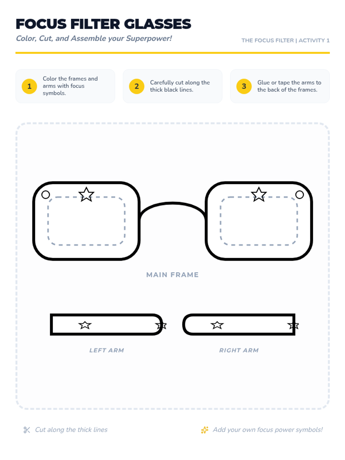 In this lesson for Kindergarten through 2nd grade, students use physical 'filters'—customized glasses—to learn how to block out classroom distractions and build foundational attention skills through a playful, tactile metaphor.