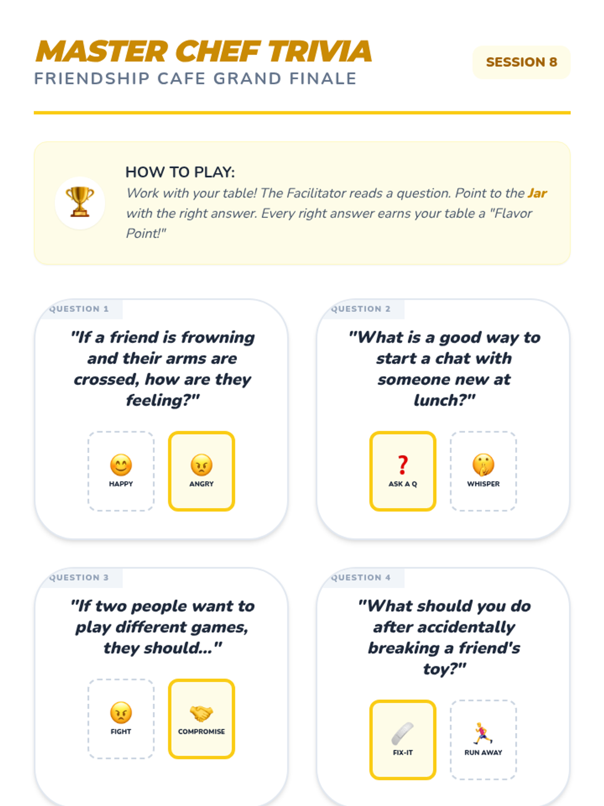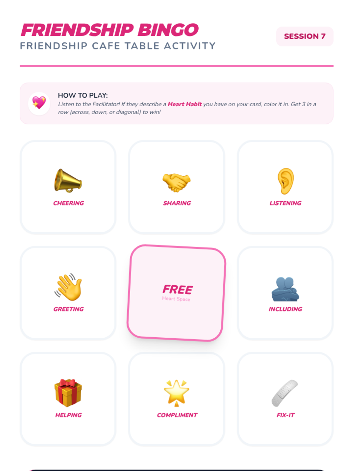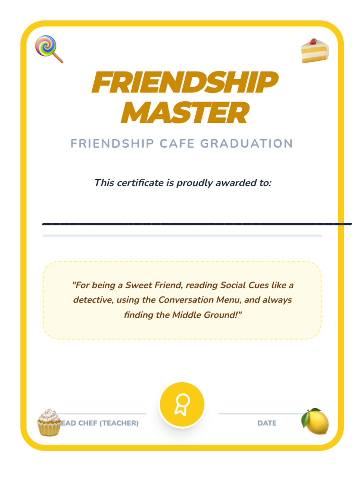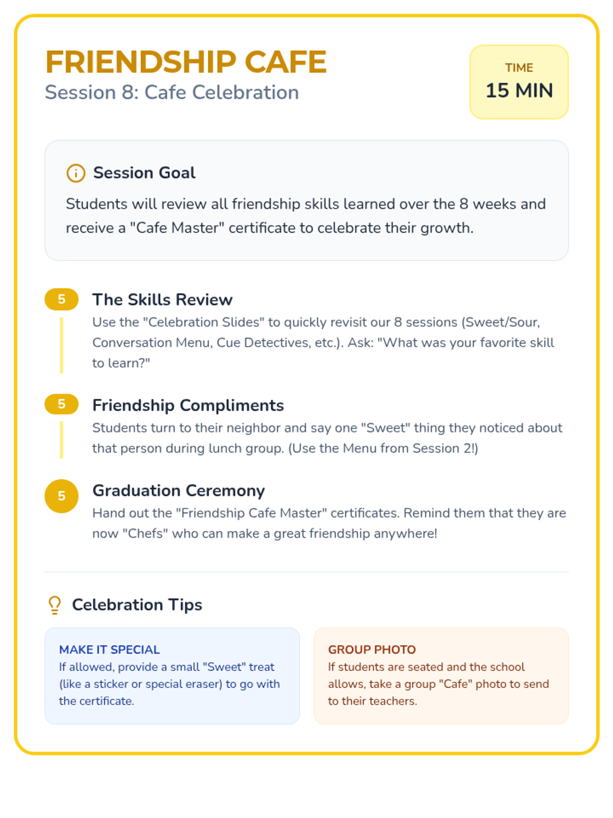 A review of all skills with a final "celebration" reflection and friendship certificates.