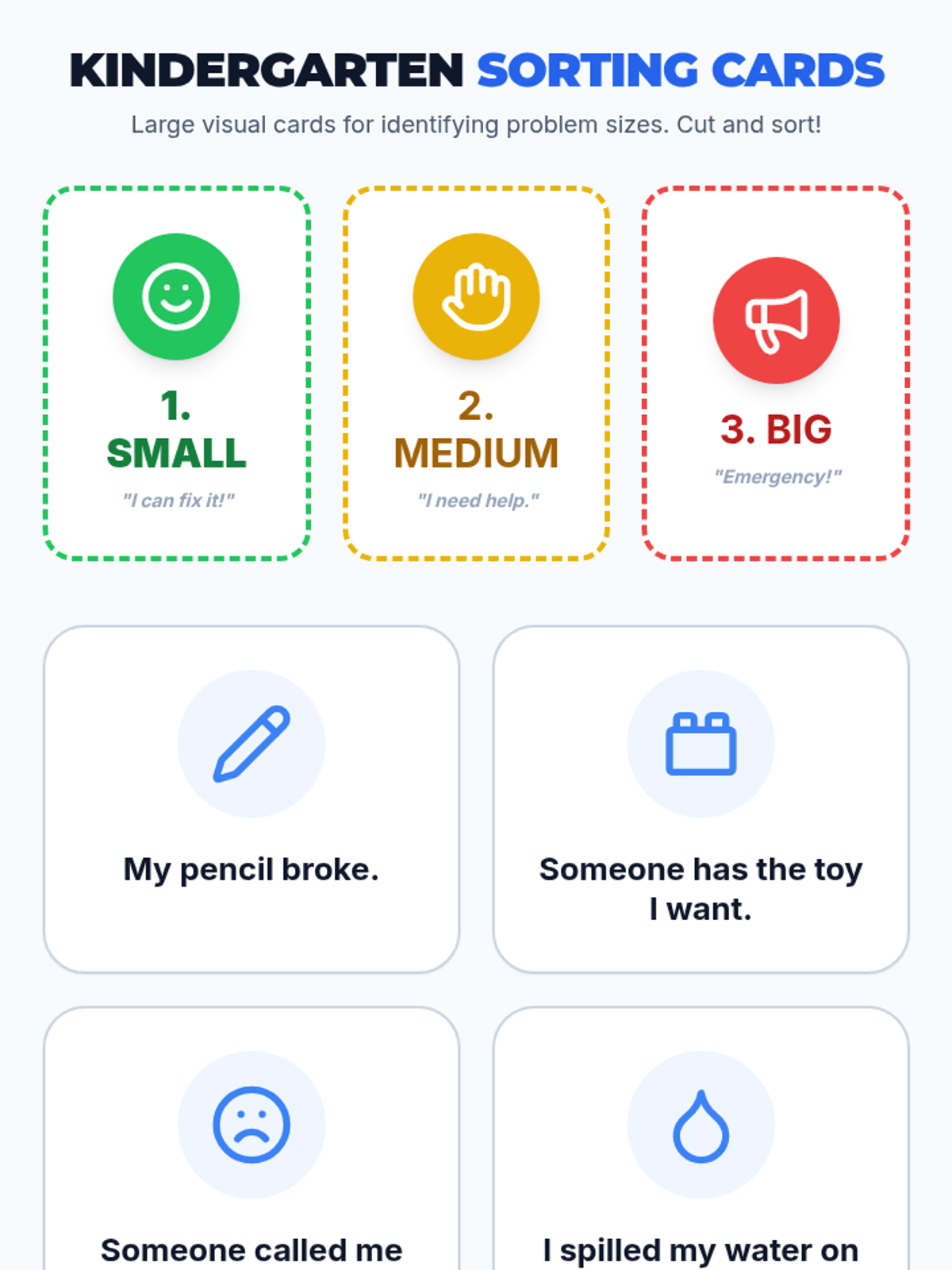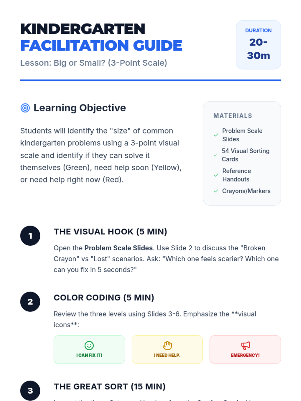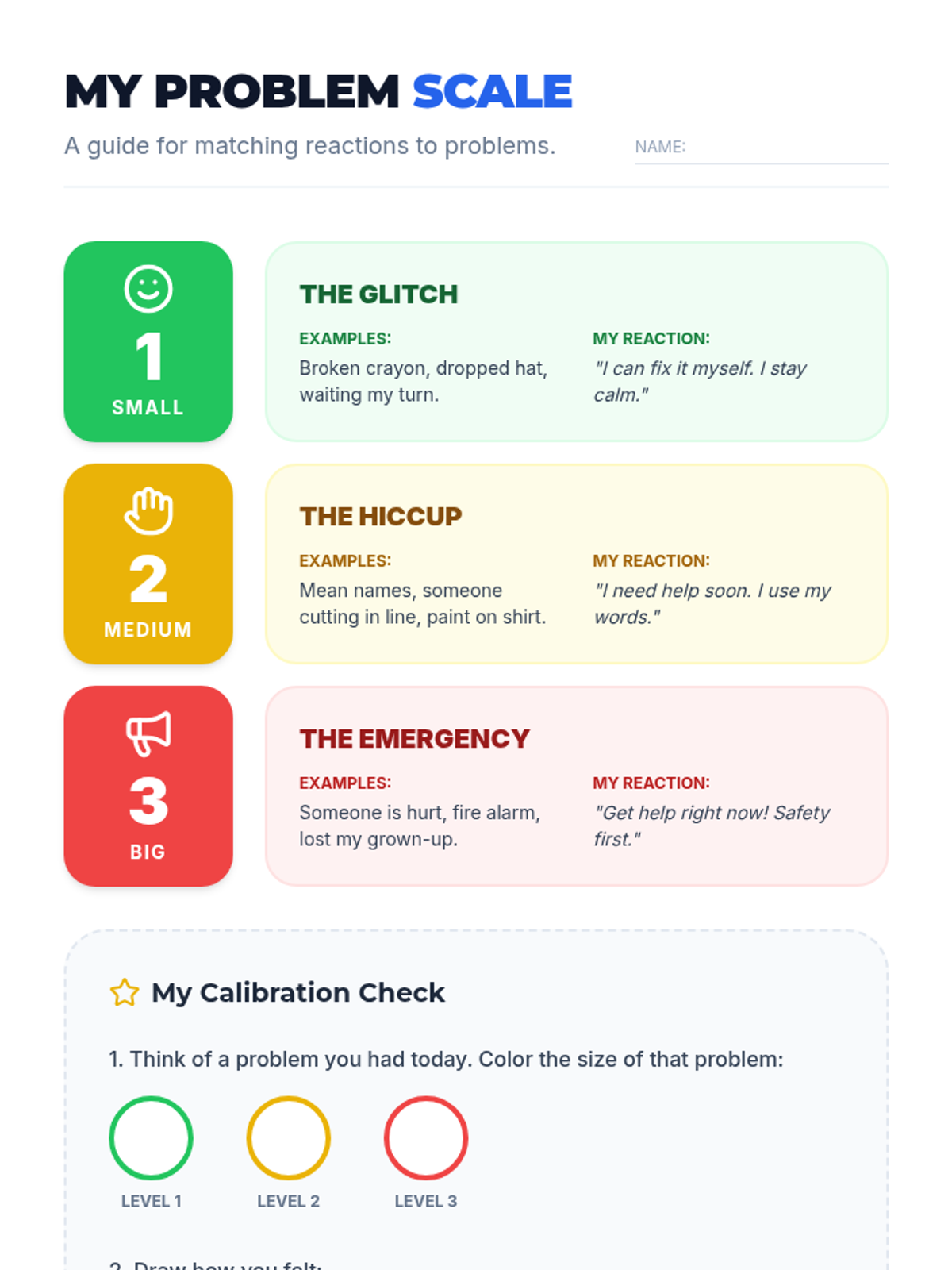 A small group social-emotional learning lesson focused on identifying and calibrating the 'size' of different problems using a 3-point scale. Students will practice matching reactions to problem sizes through interactive scenarios.