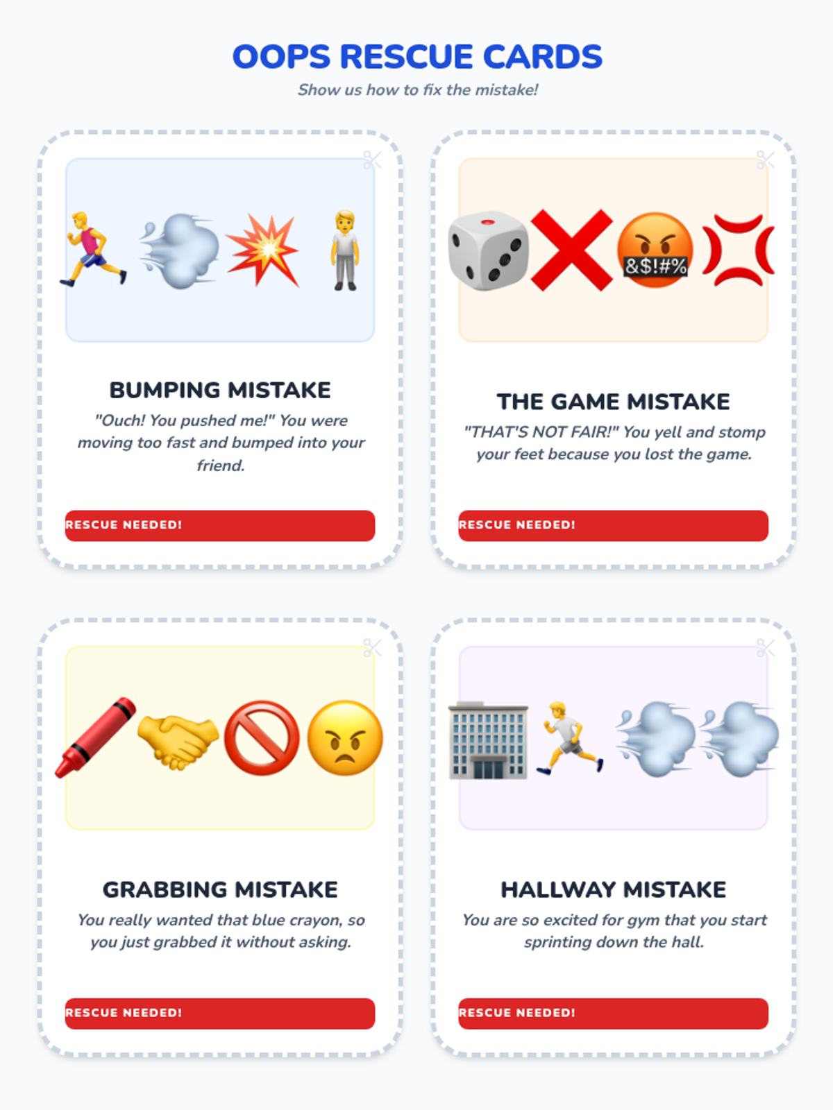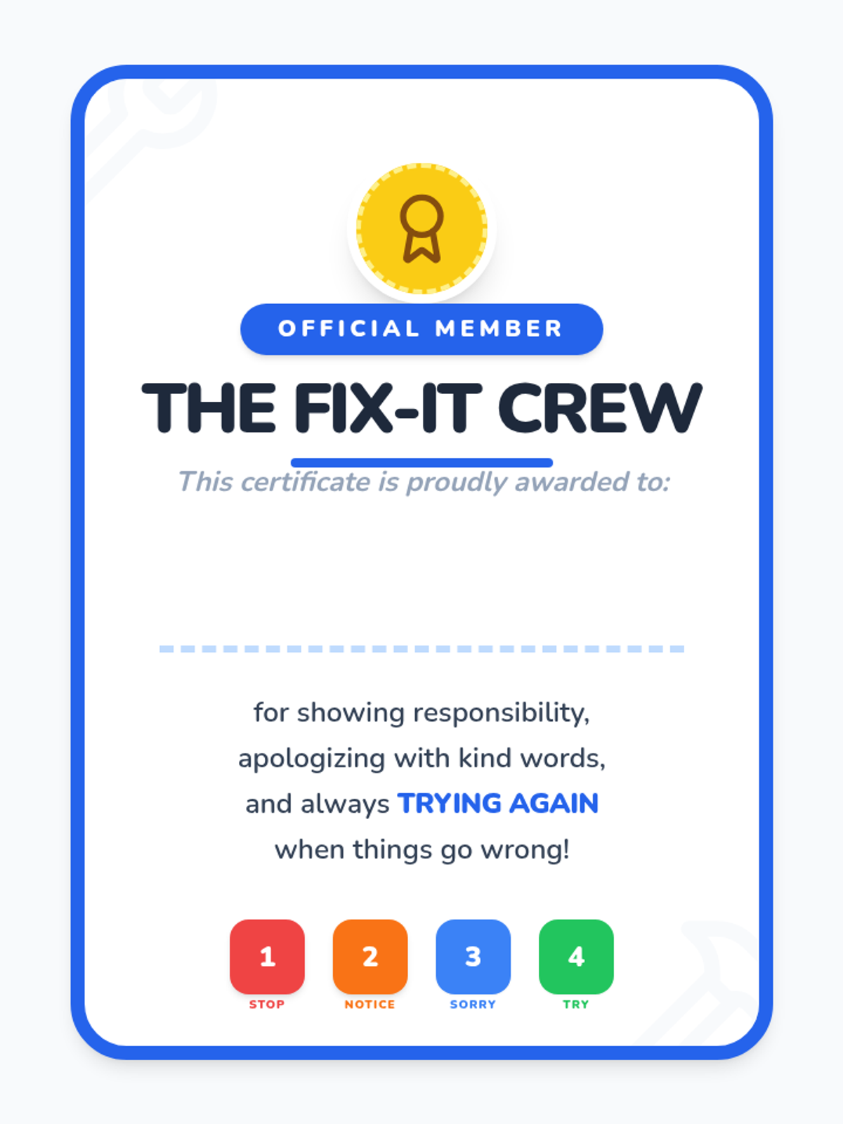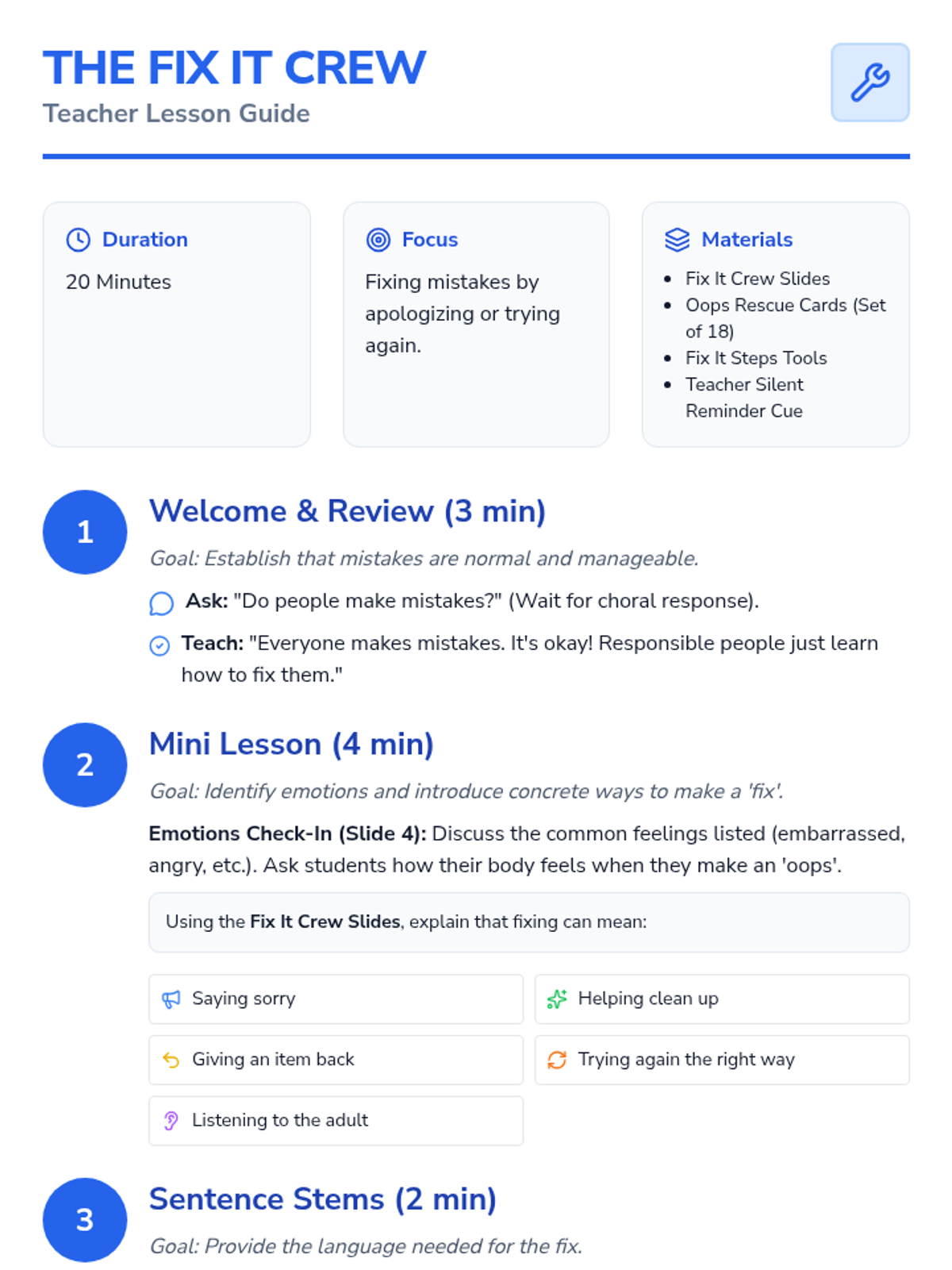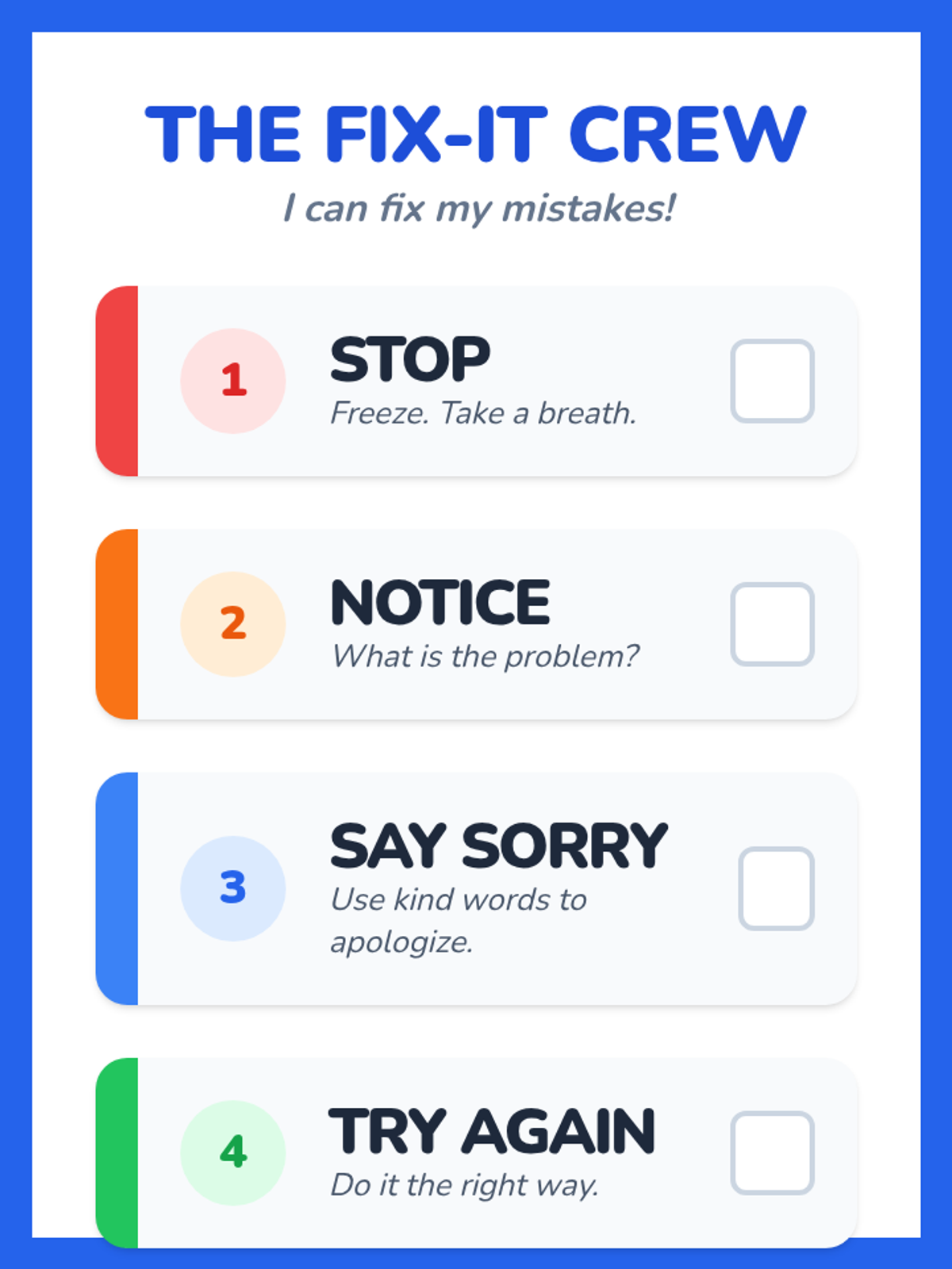 A social-emotional learning lesson focused on taking responsibility for mistakes by following clear 'Fix-It' steps. Students practice apologizing, making amends, and trying again through role-play and visual reminders.