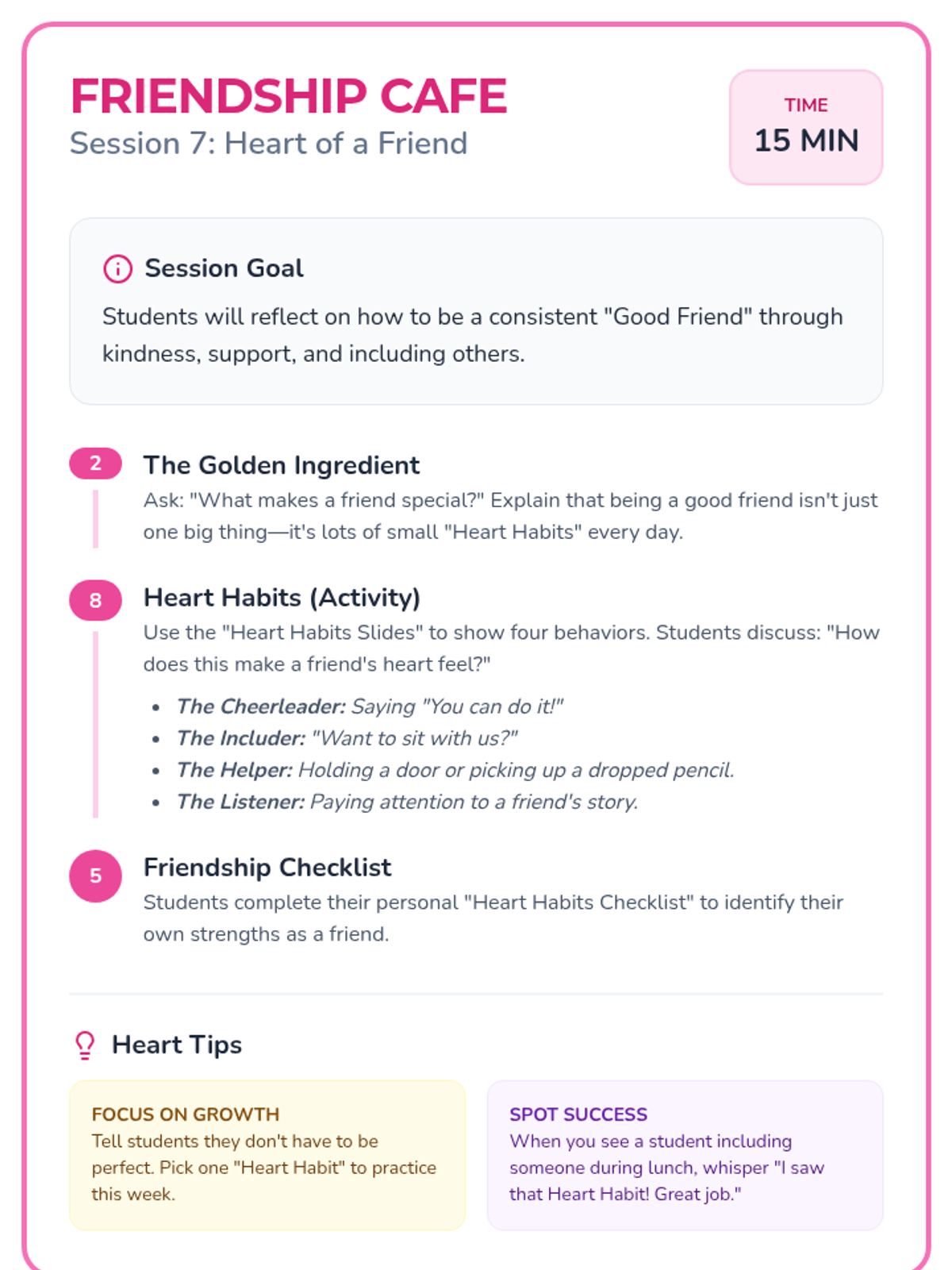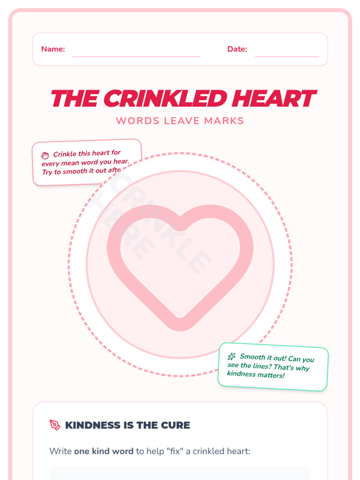 Students learn about the 'Ripple Effect' of kindness and how small acts of inclusion can transform a school culture. The lesson concludes with a class pledge to be 'Kindness Crusaders'.
