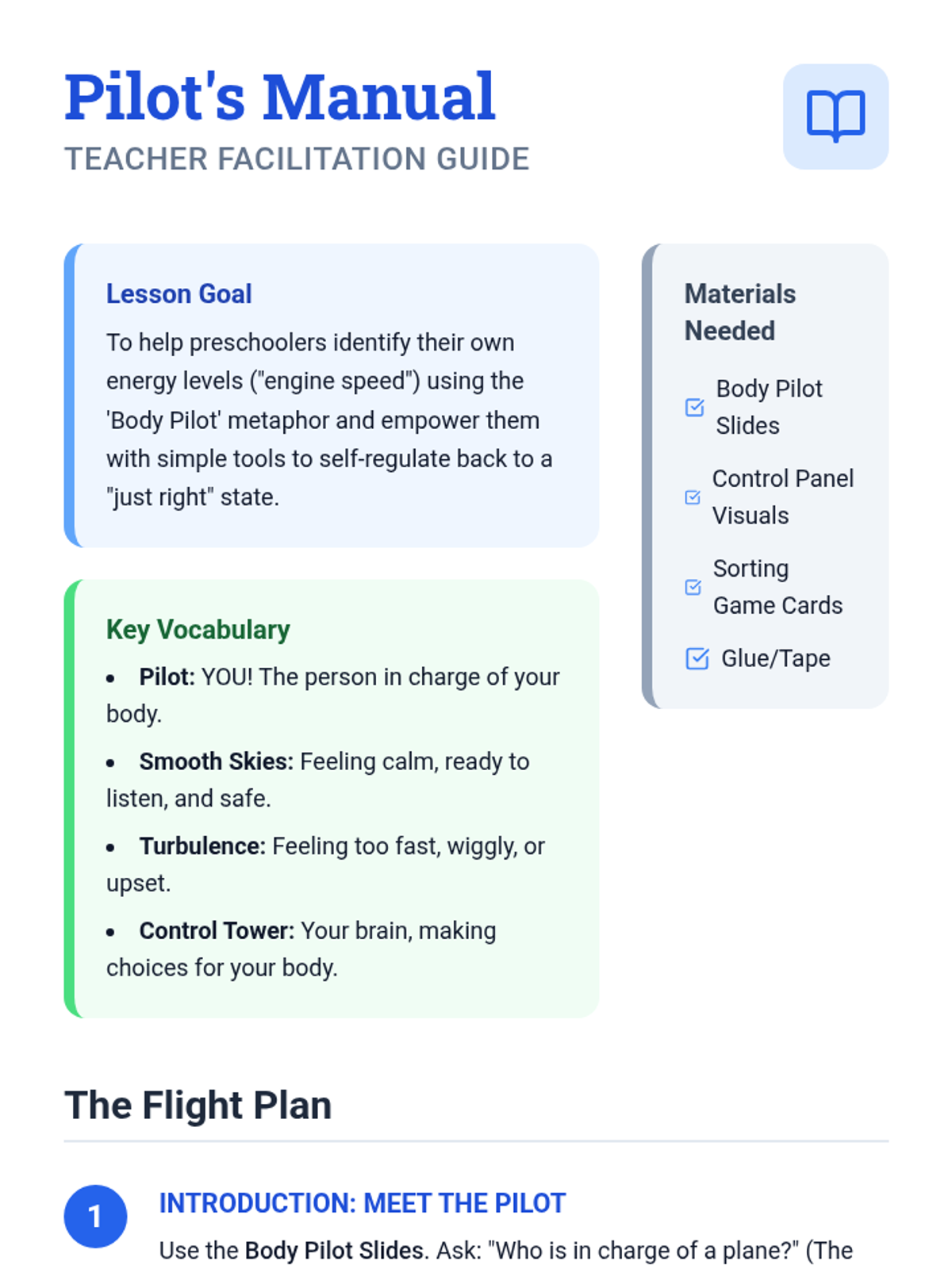A preschool lesson focused on self-regulation using the 'Body Pilot' metaphor to help children understand and manage their energy levels and emotions.