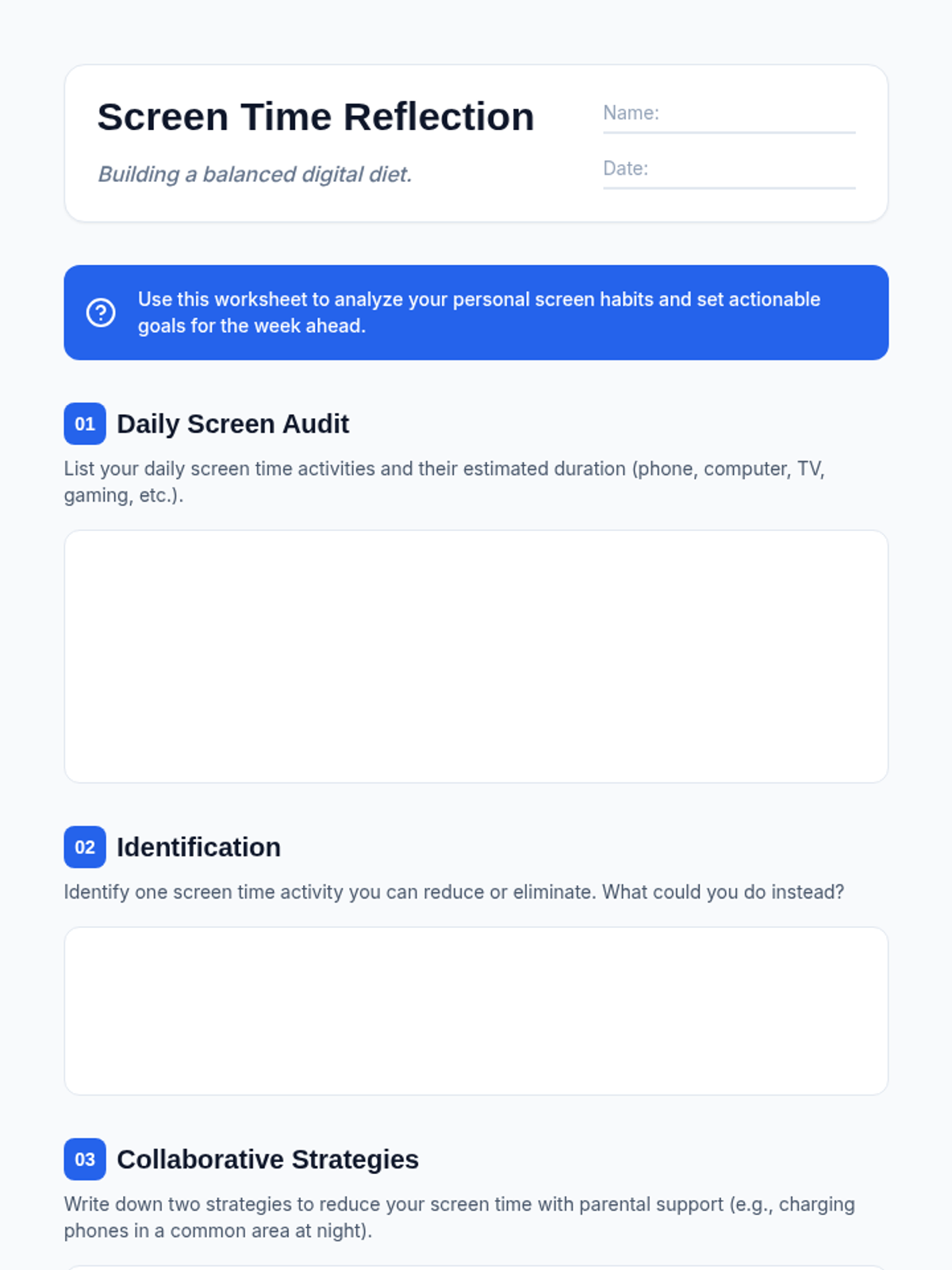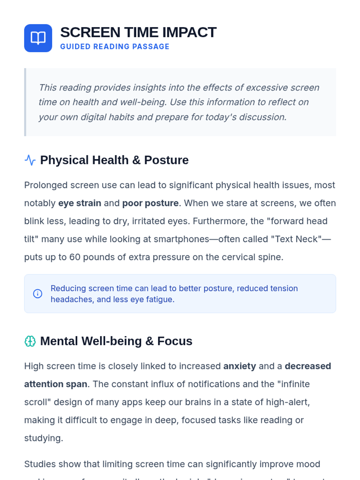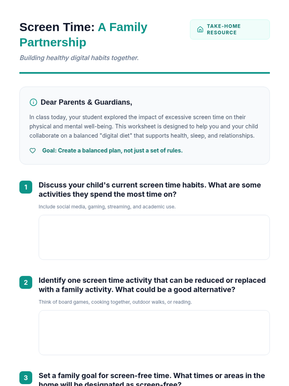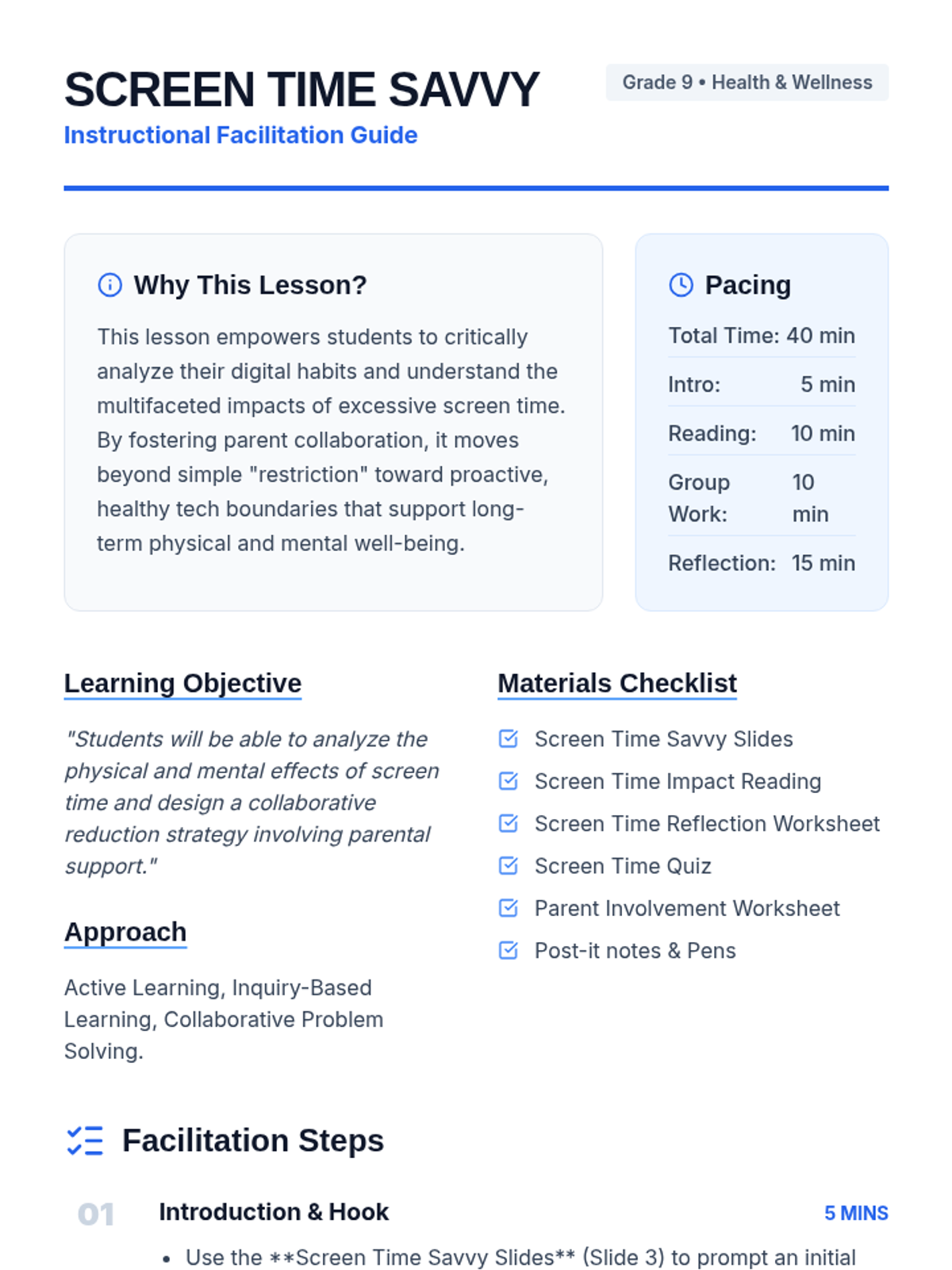 A comprehensive lesson for 9th graders to analyze their digital habits, understand the physical and mental impacts of excessive screen time, and collaborate with parents to build healthier tech boundaries.