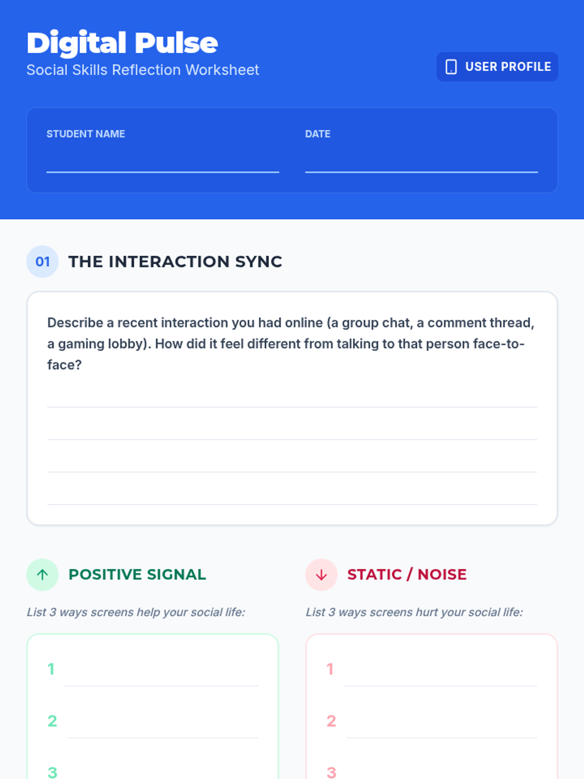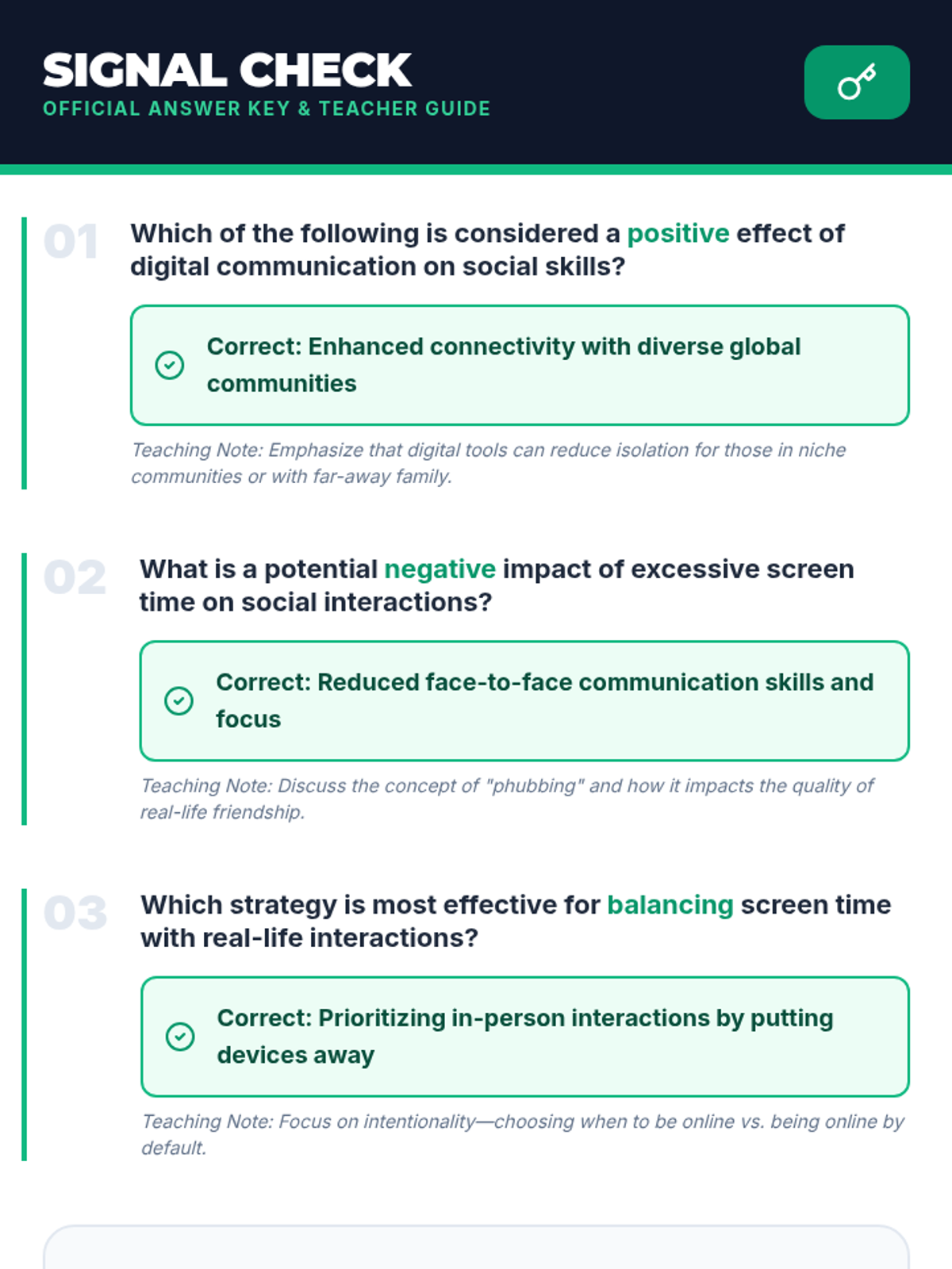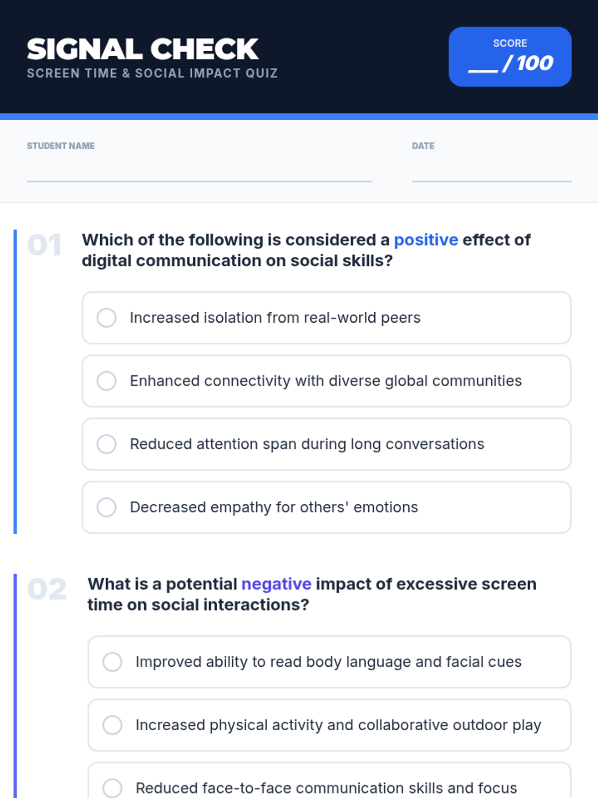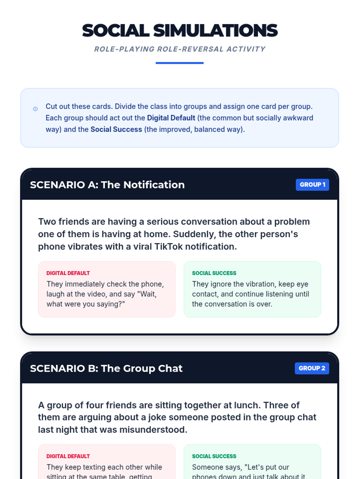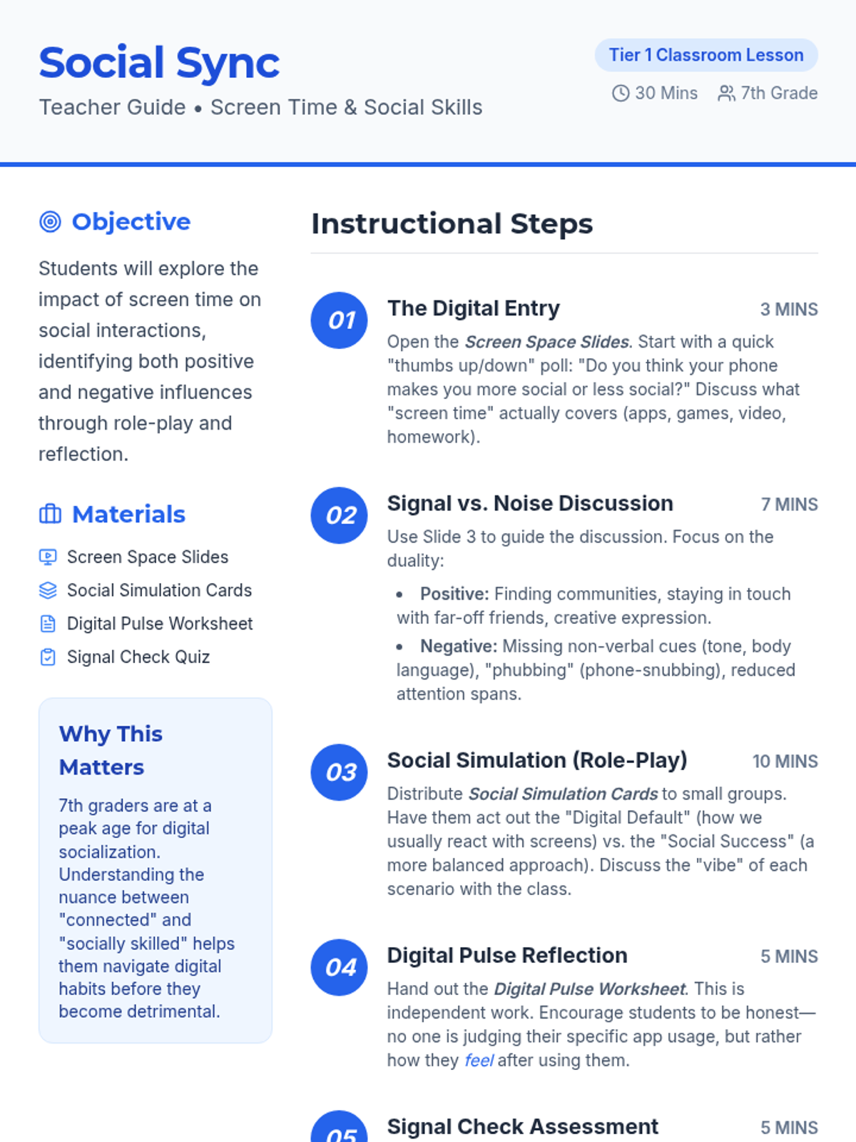 A 30-minute lesson for 7th graders to explore the impact of screen time on social skills through discussion, role-playing, and reflection.