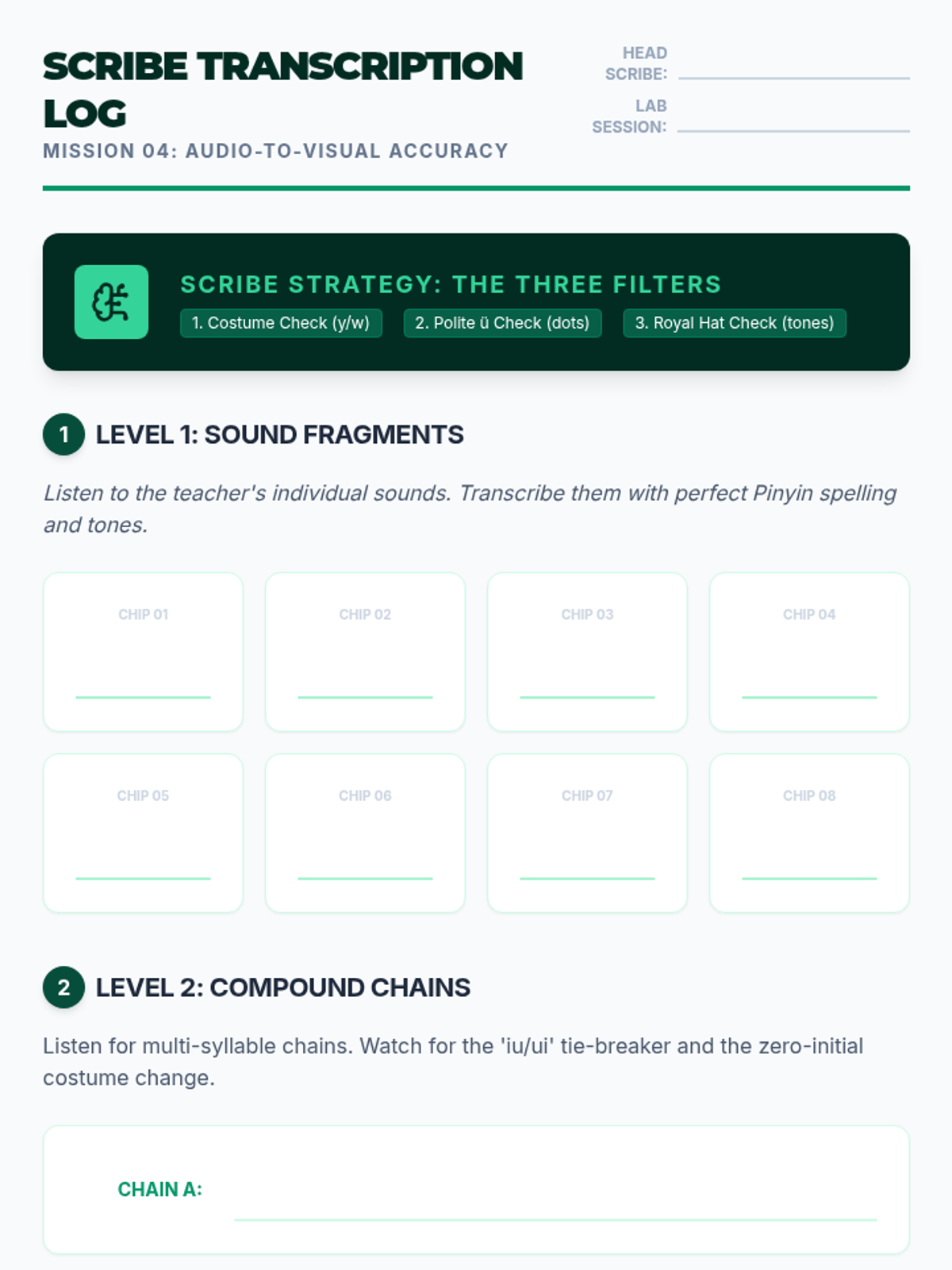 Students bridge the gap between auditory perception and written accuracy through structured dictation and transcription exercises.