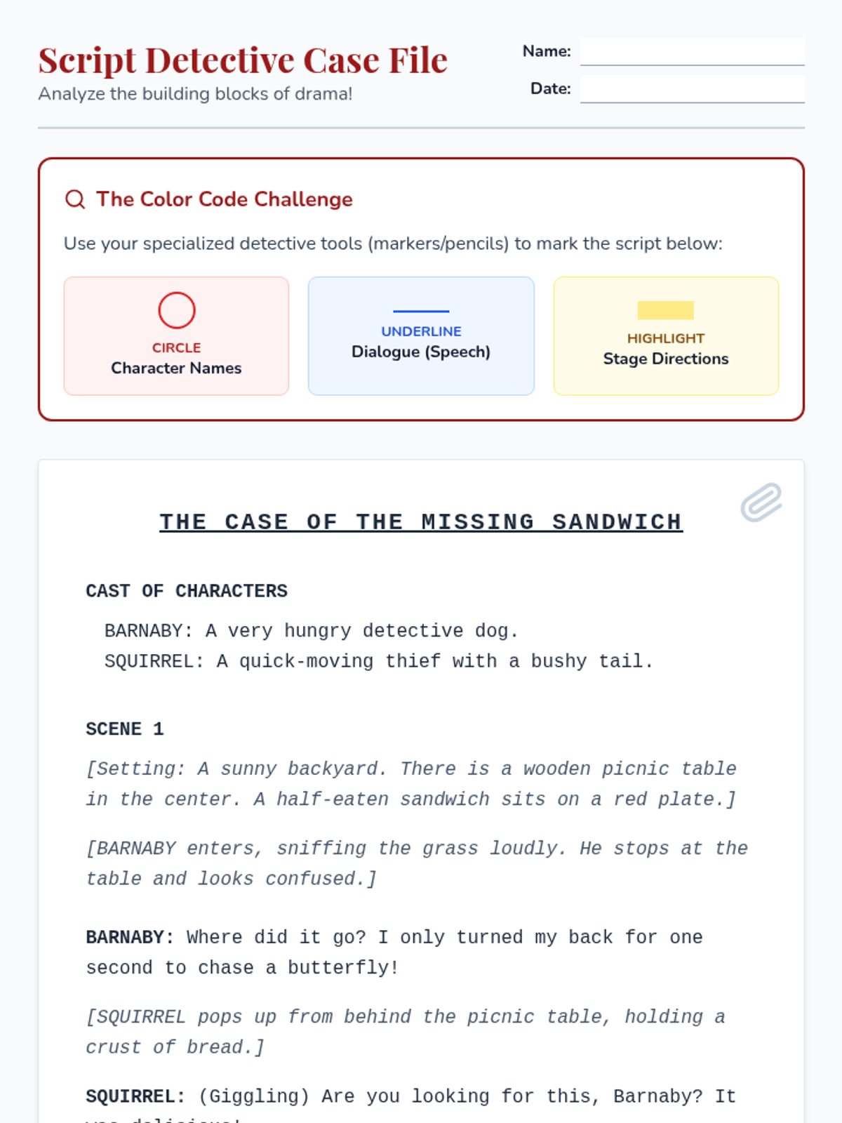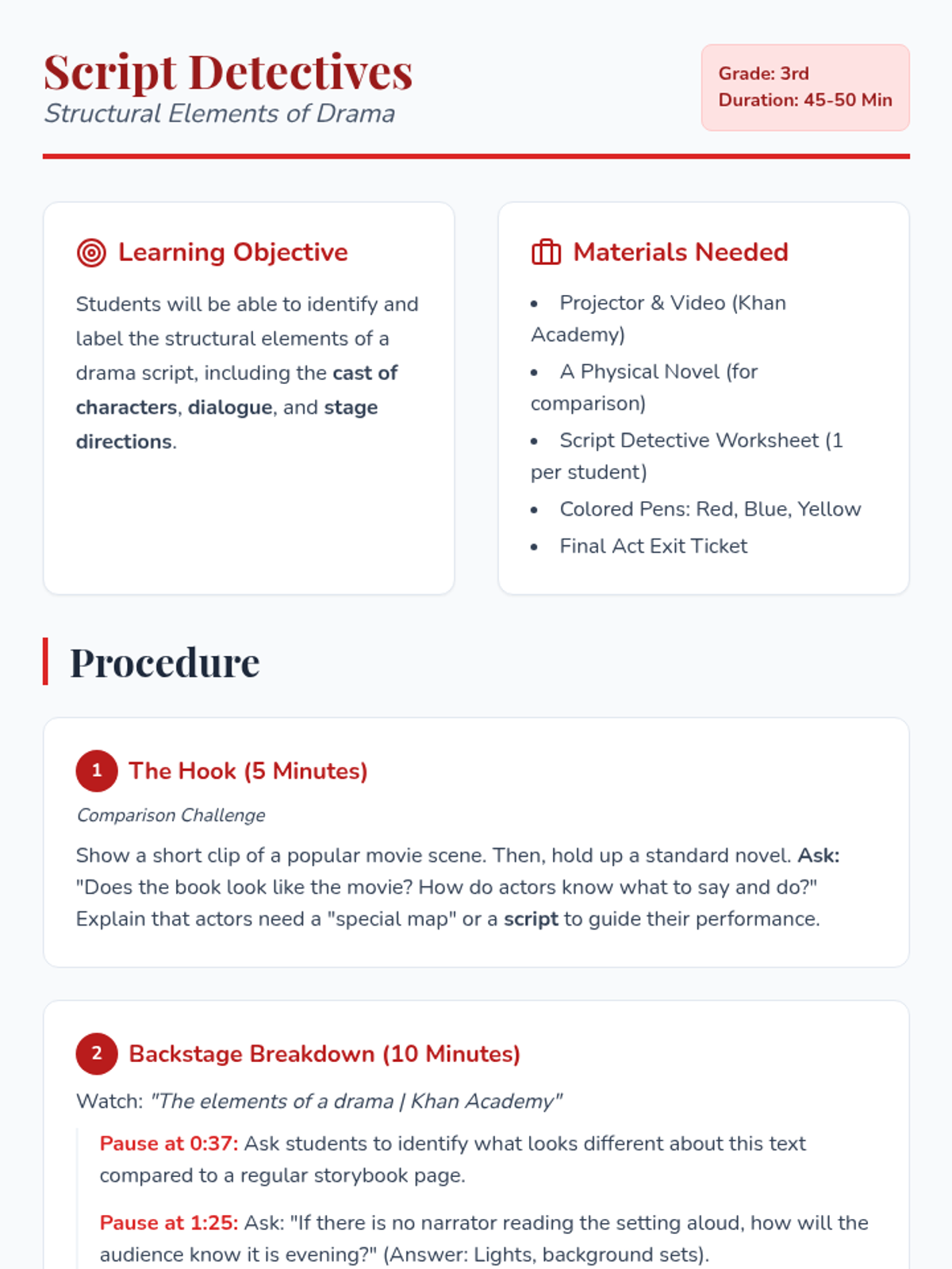 A comprehensive 3rd-grade lesson introducing the structural elements of a drama script, including cast, scenes, stage directions, and dialogue using the Khan Academy 'Elements of a Drama' video.